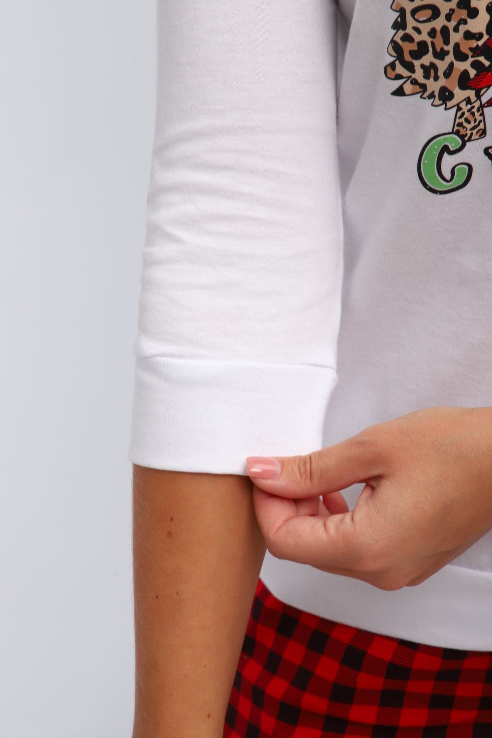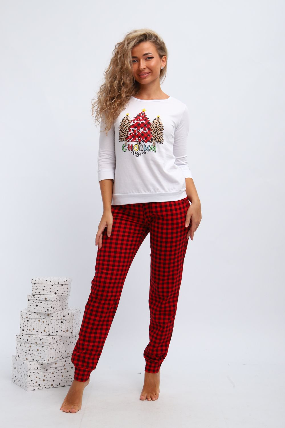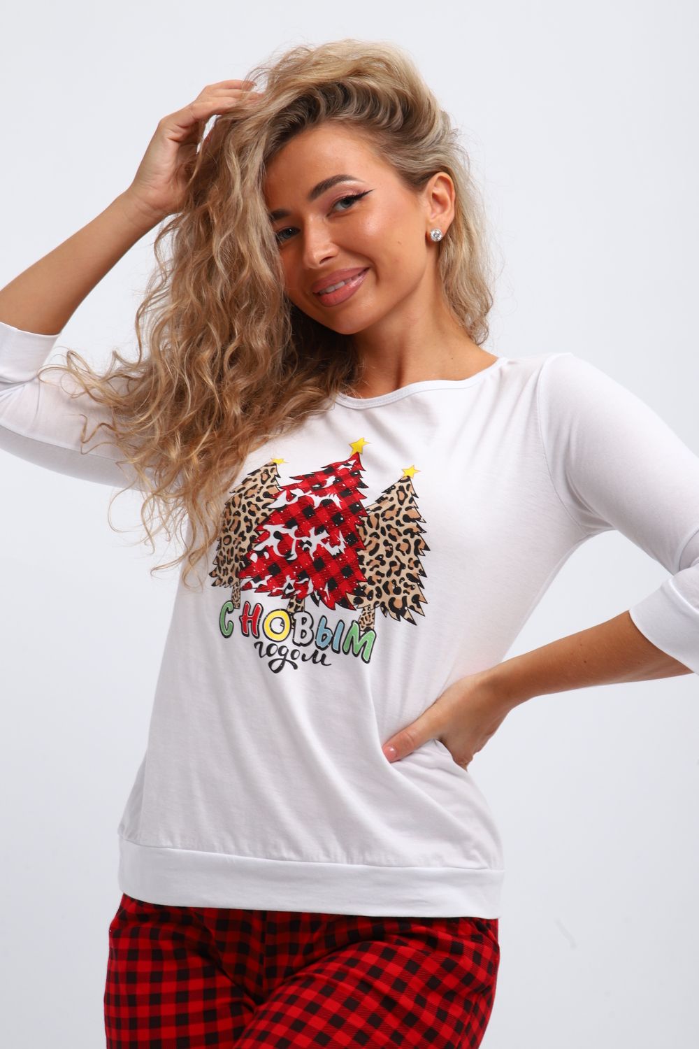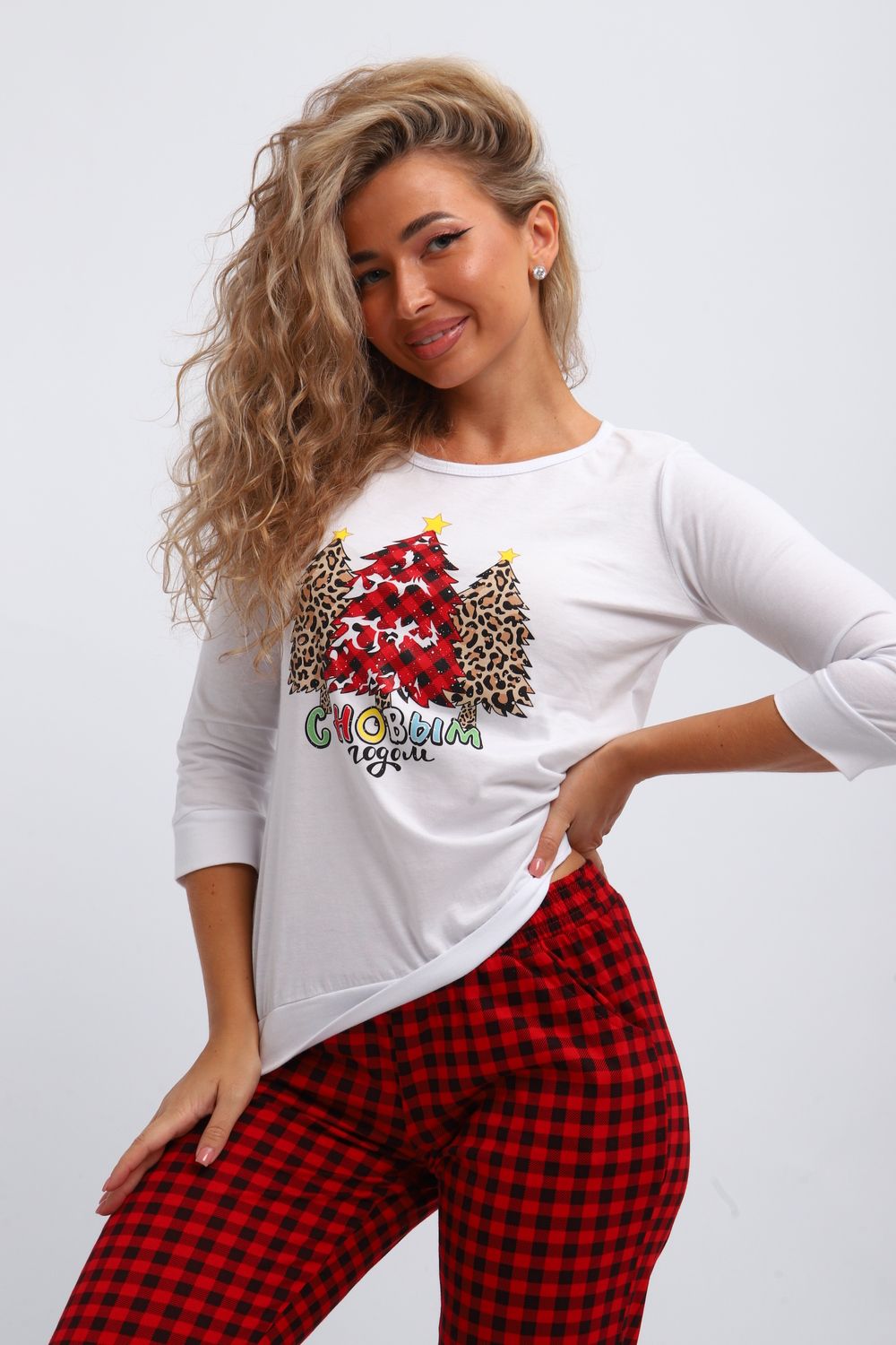 Стильный и модный набор для дома, который станет отличным выбором для девушек и женщин. Этот комплект создан с учетом всех современных тенденций, обеспечивая комфорт и удобство повседневной носки. Трикотажный материал приятно ощущается на коже, благодаря чему костюм идеально подходит для отдыха и сна. Этот красивый пижамный комплект включает в себя уютную кофту с рукавами ¾ и брюками на резинке. Мягкий трикотаж обеспечивает свободу движений и комфорт в любое время суток. Одежда выполнена в ярком стиле, чтобы вы чувствовали себя привлекательно даже дома. Особенным украшением комплекта является оригинальный новогодний принт, создающий милый и игривый образ.