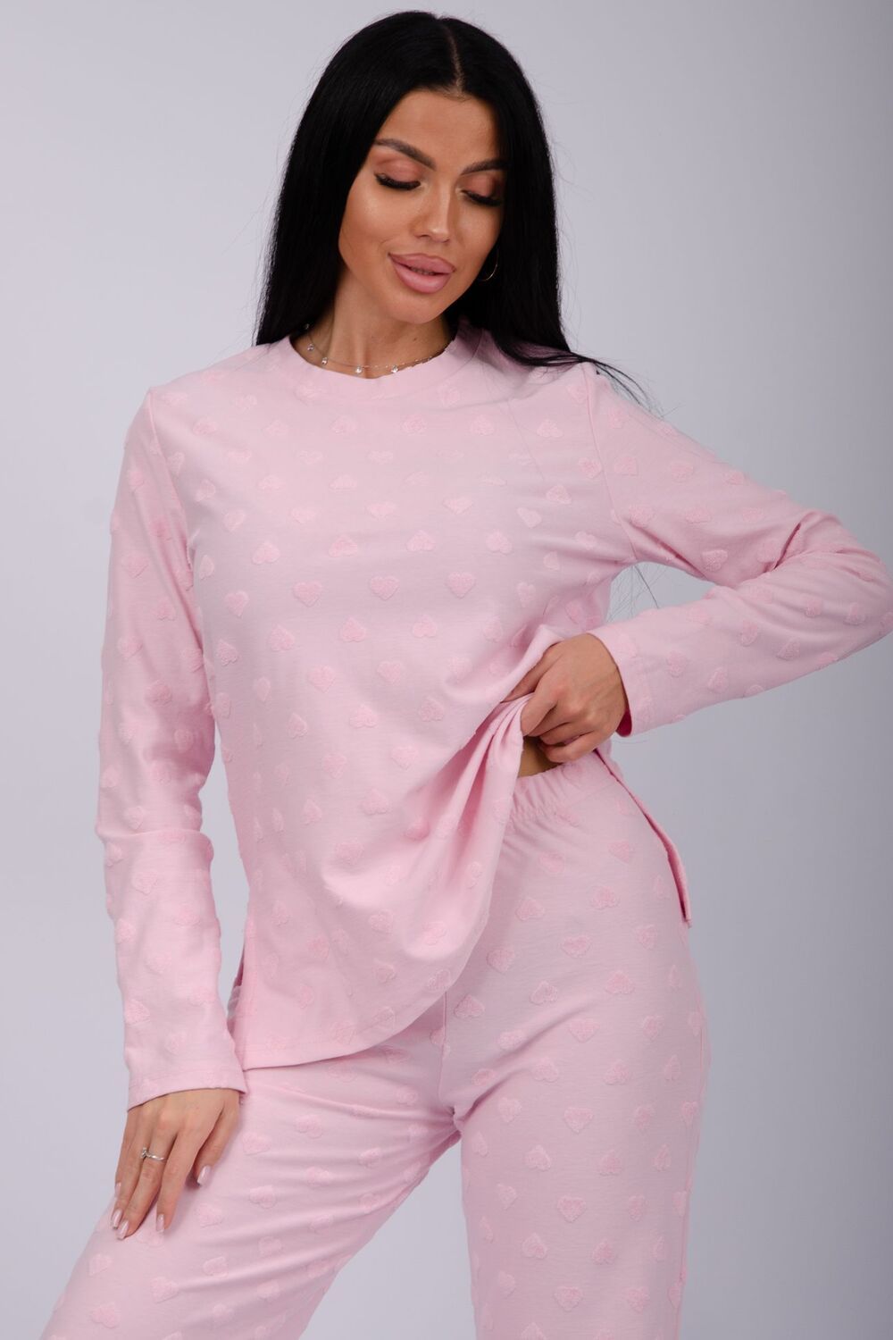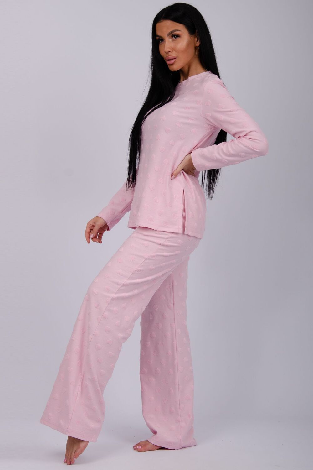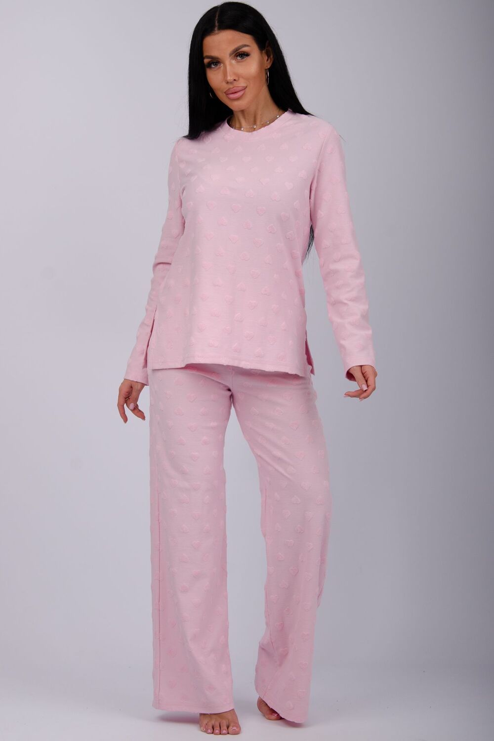 Костюм домашний - сочетание уюта и комфорта, которое понравится и взрослой женщине, и девушке - подростку. Пижама состоит из лонгслива с длинными рукавами с круглой горловиной, и штанов прямого кроя на комфортной резинке по поясу. Пижама сшита из мягкого и теплого полотна (состав: хлопок 100%), доступна в размерах от 44-го до большого 54-го, чтобы женщины и девушки с фигурой любого типа и комплекции могли комфортно себя чувствовать. Пижама с кофтой и прямыми брюками прекрасно подойдет для дома, для вечерних и повседневных образов. Мягкий и уютный костюм из нежной махровой ткани. Модная пижама придаст комфорт в любое время года: в зимний, демисезонный и осенний - весенний период.