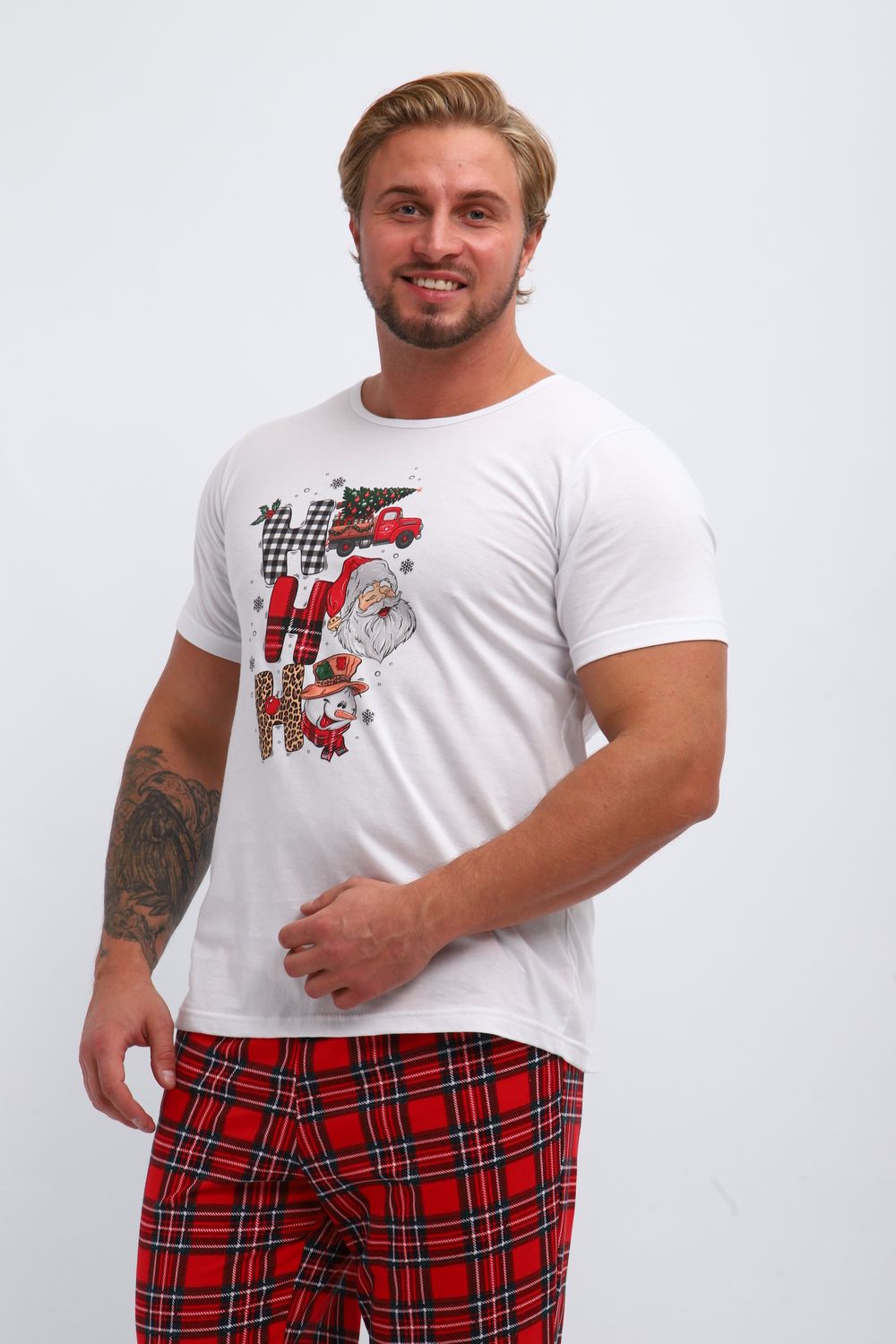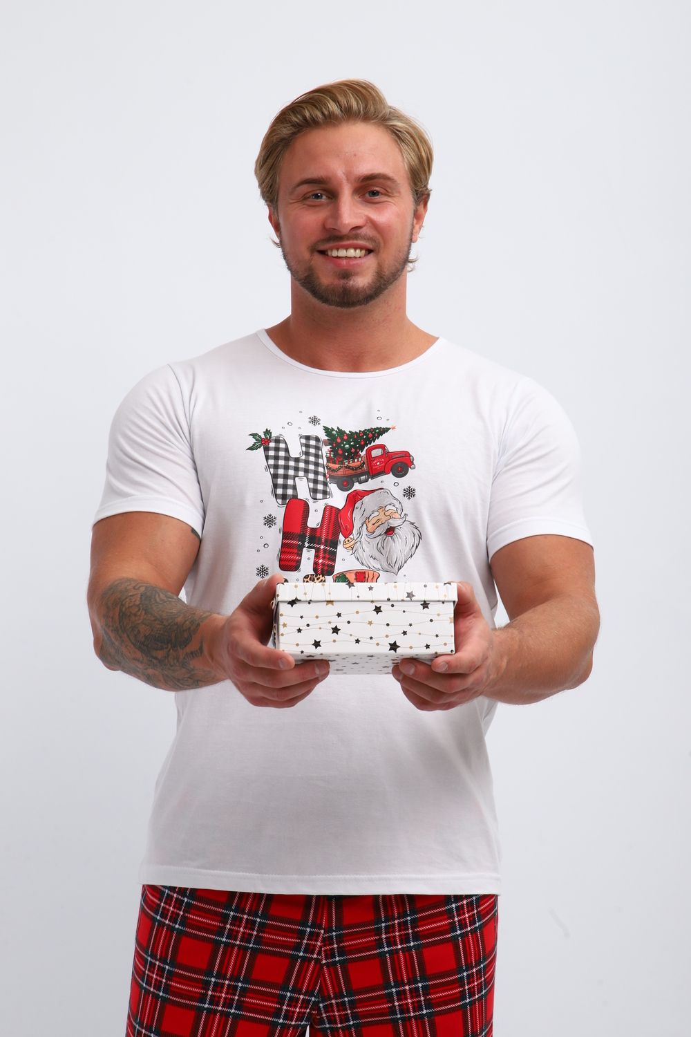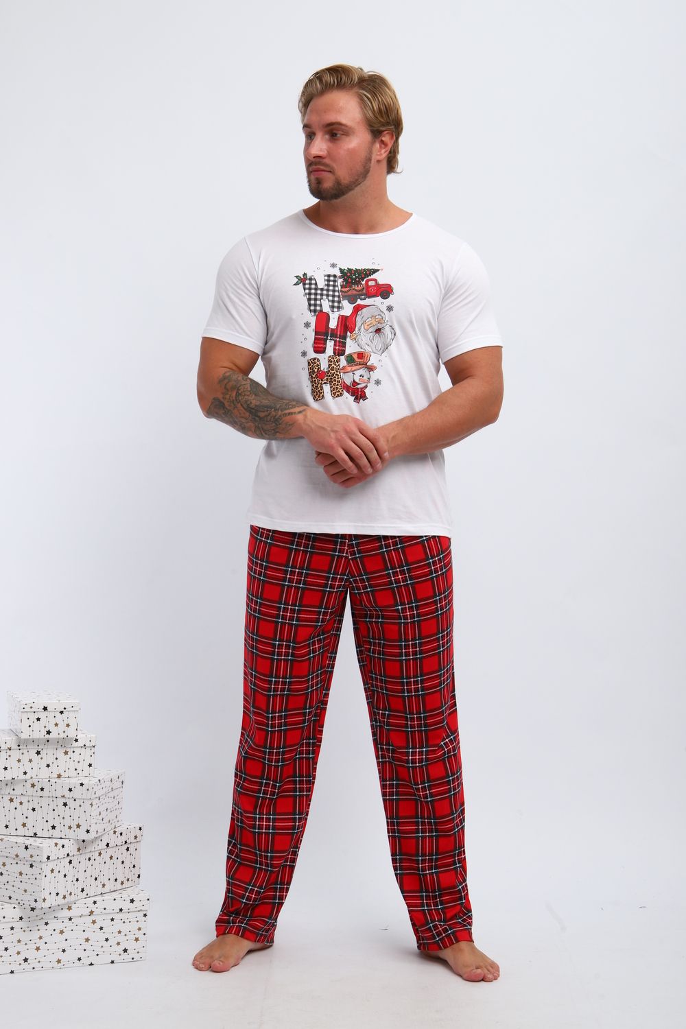 Стильный и модный набор для дома, который станет отличным выбором для мужчин. Этот комплект создан с учетом всех современных тенденций, обеспечивая комфорт и удобство повседневной носки. Трикотажный материал приятно ощущается на коже, благодаря чему костюм идеально подходит для отдыха и сна. Этот красивый пижамный комплект включает в себя уютную футболку и брюки. Мягкий трикотаж обеспечивает свободу движений и комфорт в любое время суток. Одежда выполнена в ярком стиле, чтобы вы чувствовали себя привлекательно даже дома. Особенным украшением комплекта является оригинальный новогодний принт, создающий милый и игривый образ.