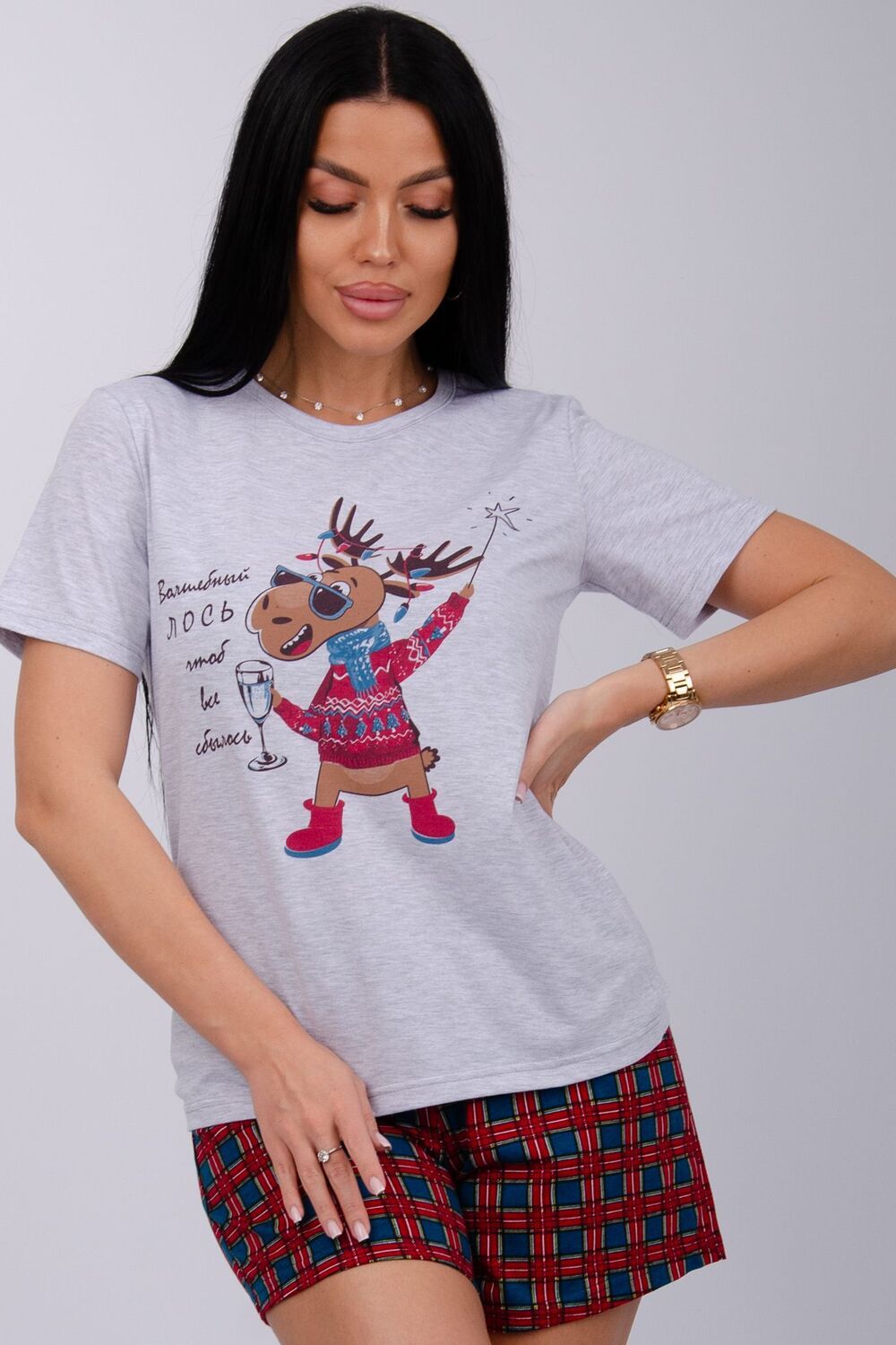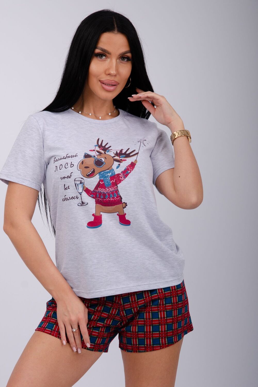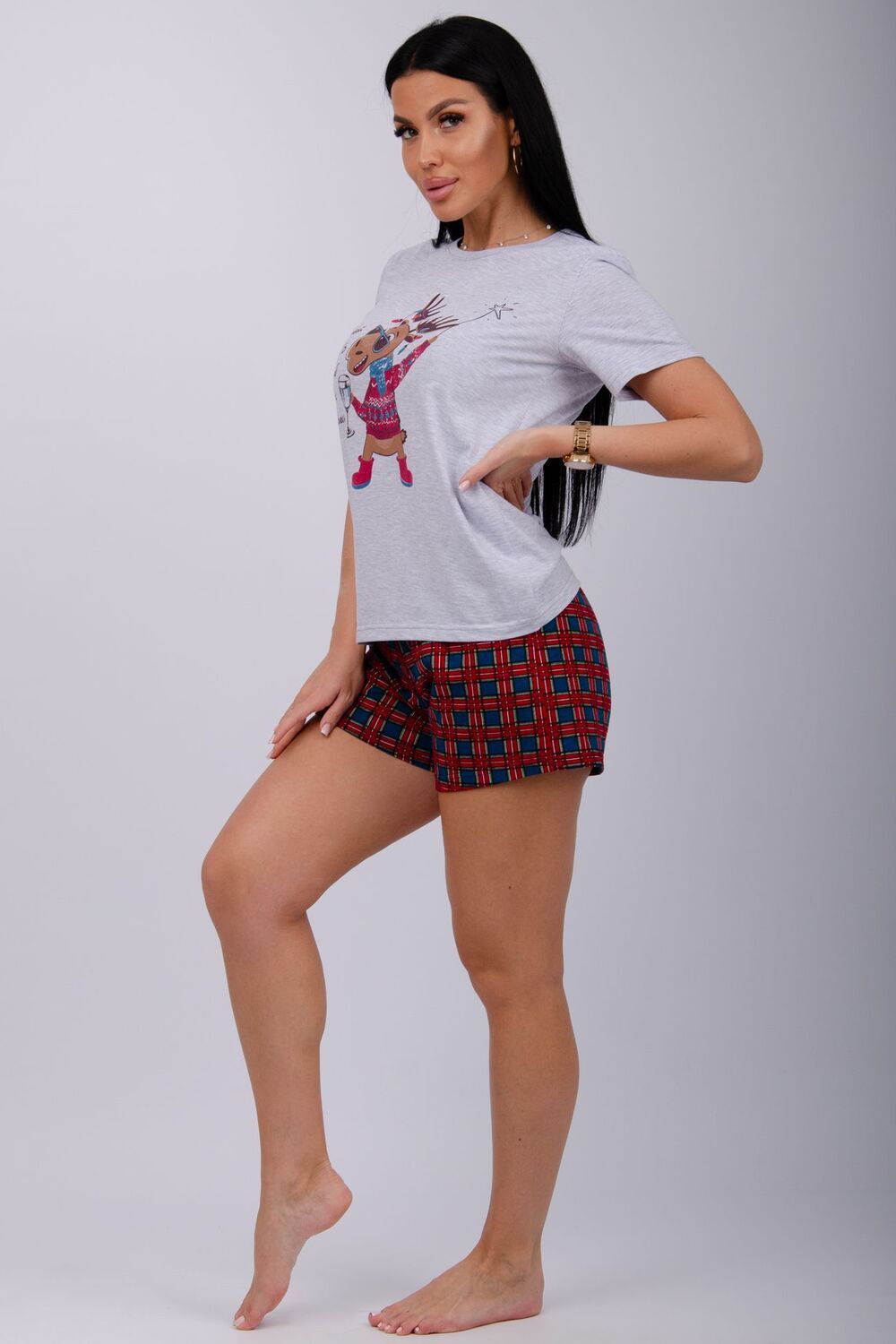 Пижама женская состоит из футболки с коротким рукавом и шортов. Футболка из однотонной кулирки с красивым принтом, шорты свободного покроя из ткани кулирка.