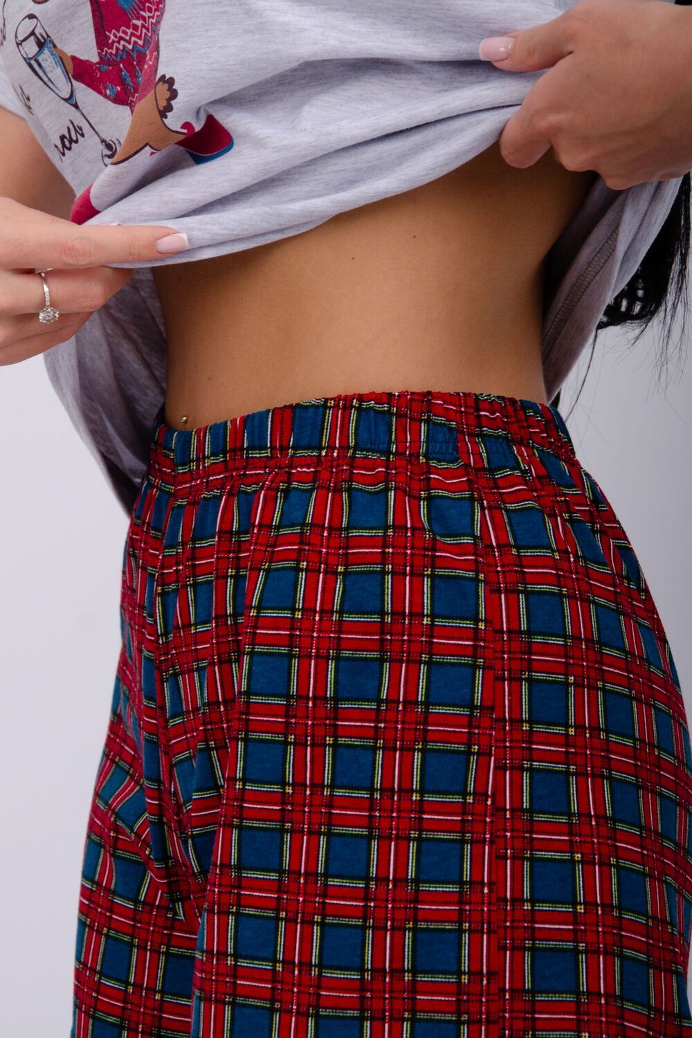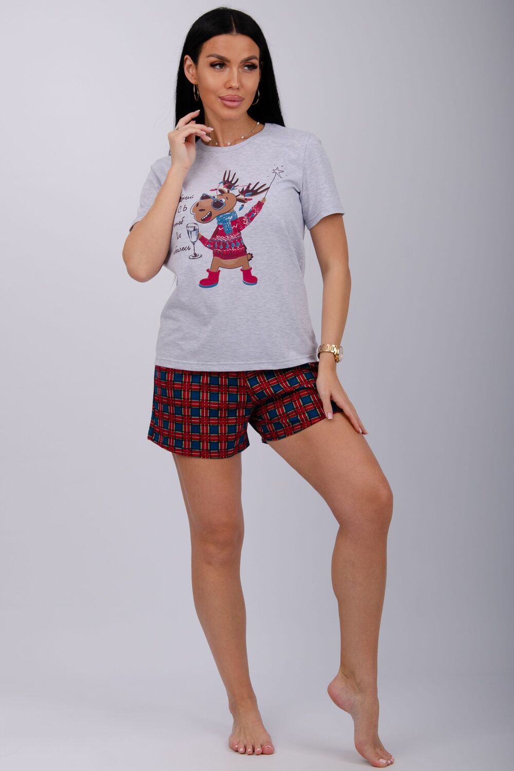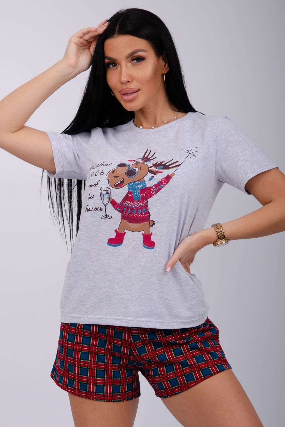 Пижама женская состоит из футболки с коротким рукавом и шортов. Футболка из однотонной кулирки с красивым принтом, шорты свободного покроя из ткани кулирка.