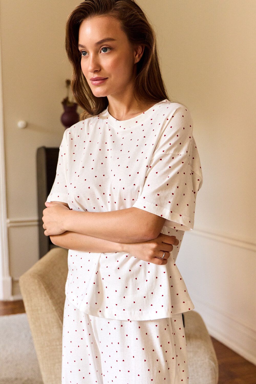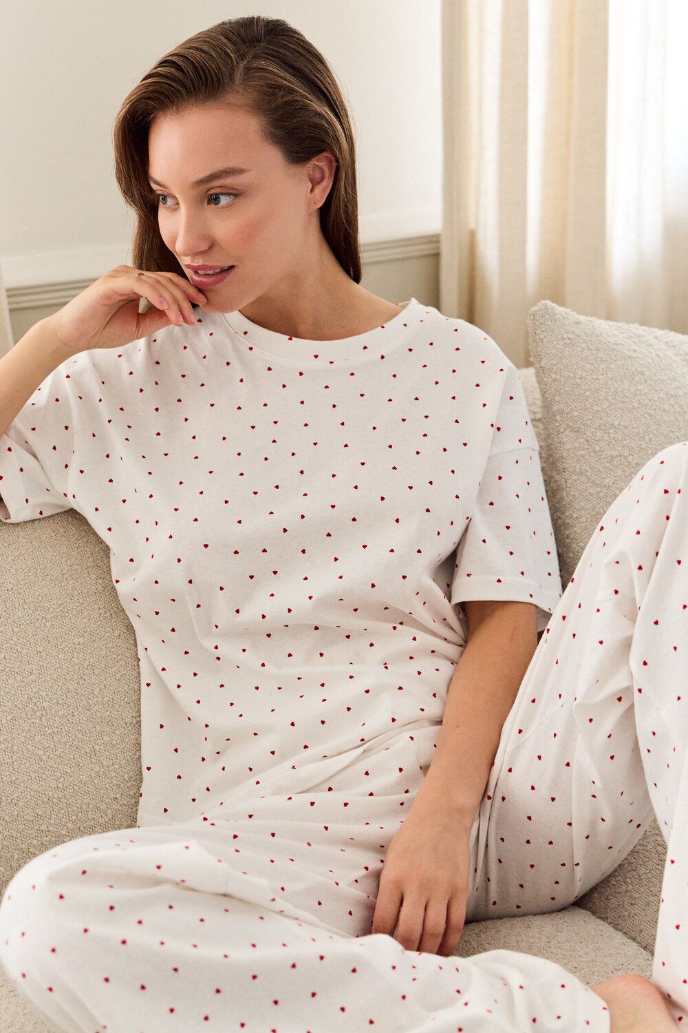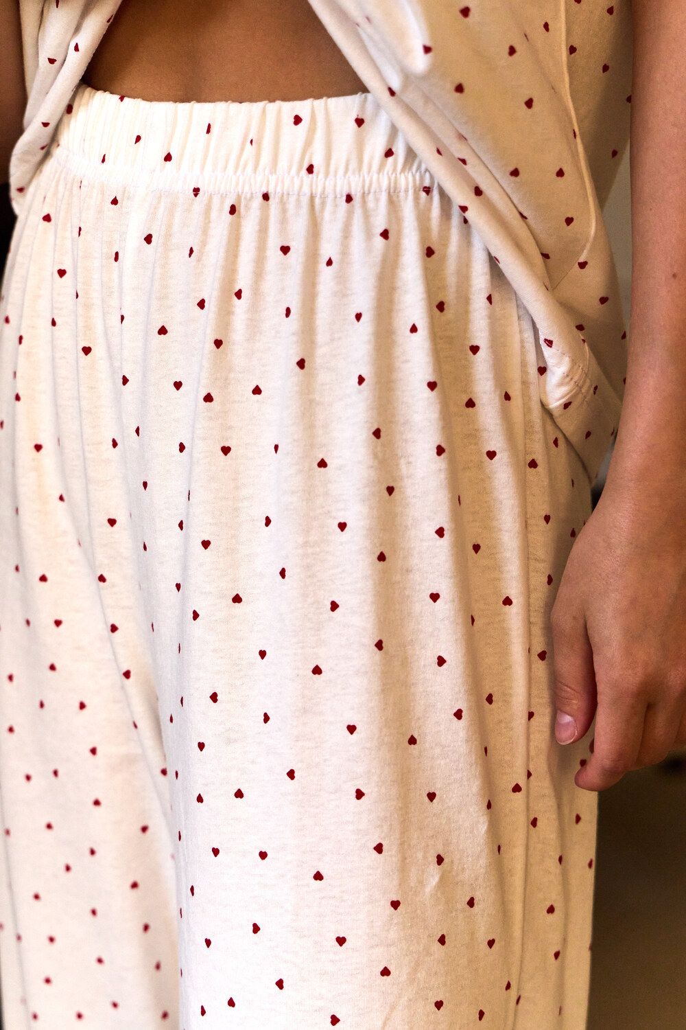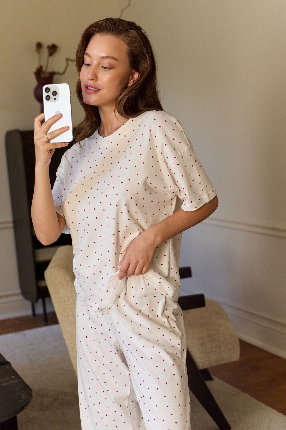 Женская пижама с брюками – это не просто одежда для сна, это кокон уюта, созданный для каждой женщины, ценящей комфорт и стиль в домашней обстановке. Мягкий, словно облако, материал ласкает кожу, даря ощущение безмятежности на всю ночь. Классический силуэт и свободный крой обеспечивают полную свободу движений, позволяя забыть о будничной суете. Широкие штаны с высокой посадкой и эластичным поясом нежно обнимают талию, подчеркивая женственность. Пижама представлена с очаровательным принтом - сердечки, пробуждающими самые теплые чувства и создающими атмосферу нежности. Этот домашний костюм станет настоящей находкой для будущих и молодых мам, а также для юных леди, предпочитающих комфорт и стиль традиционной ночной рубашке. Подарите себе или близким этот островок безмятежности – пижама станет прекрасным подарком для мамы, сестры, дочери или любимой внучки, ведь она – воплощение стиля, комфорта и качества, обещающее самые сладкие и волшебные сны.
