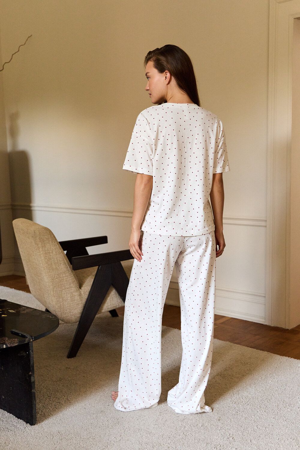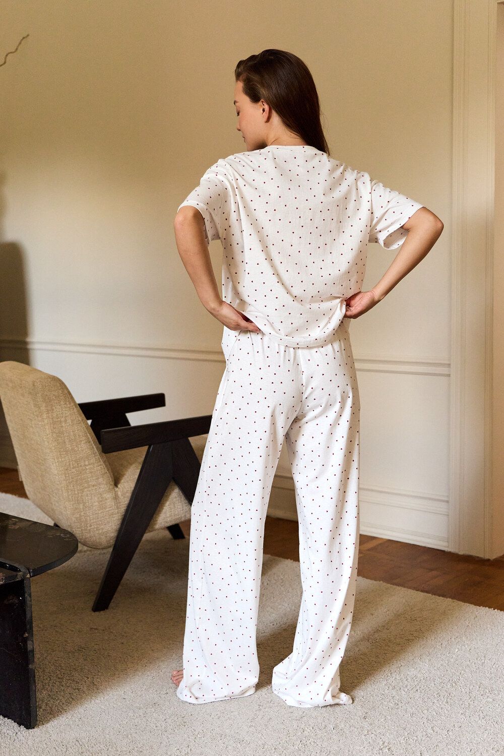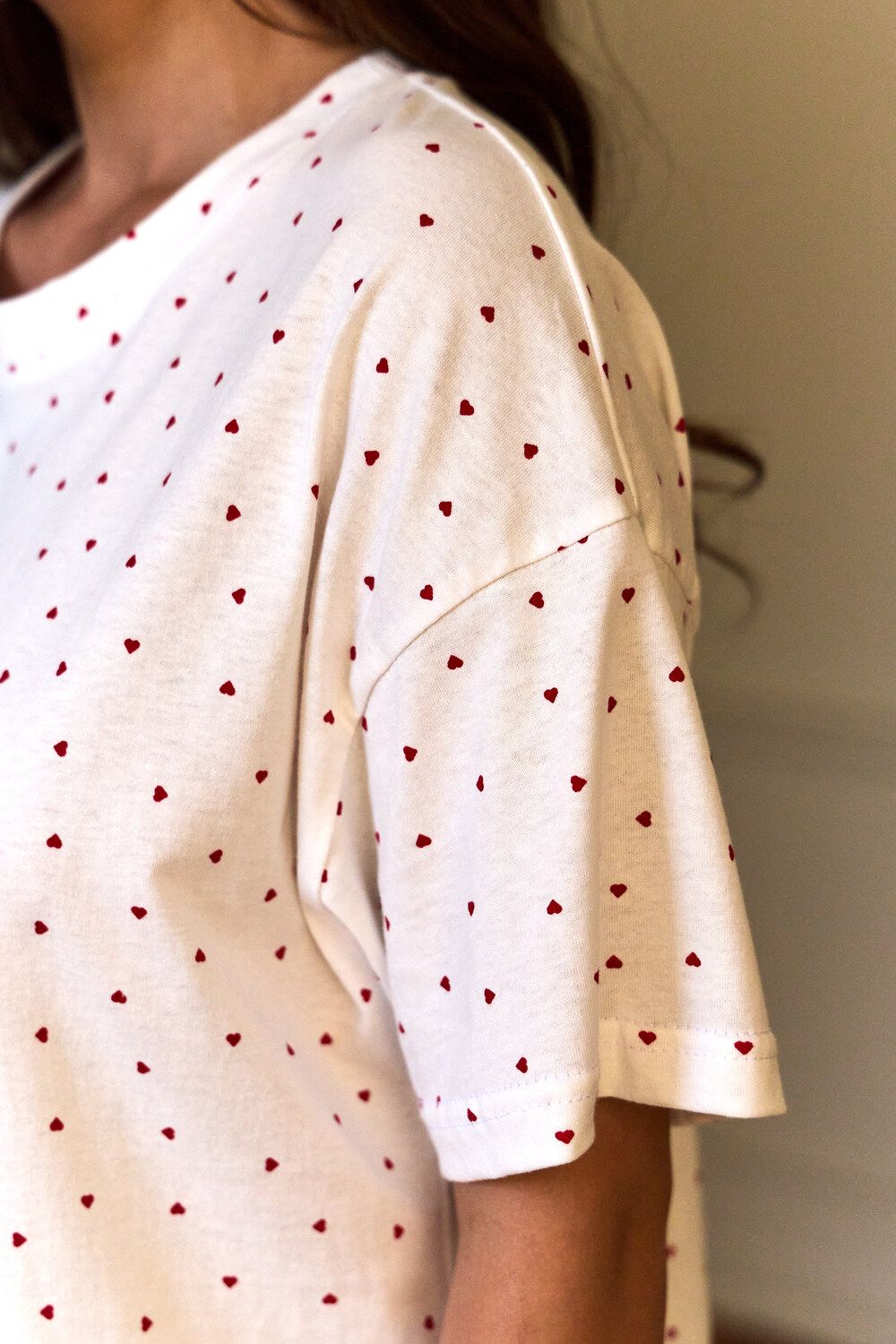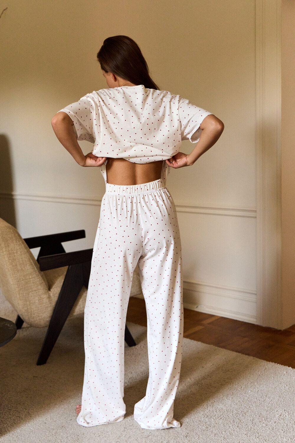 Женская пижама с брюками – это не просто одежда для сна, это кокон уюта, созданный для каждой женщины, ценящей комфорт и стиль в домашней обстановке. Мягкий, словно облако, материал ласкает кожу, даря ощущение безмятежности на всю ночь. Классический силуэт и свободный крой обеспечивают полную свободу движений, позволяя забыть о будничной суете. Широкие штаны с высокой посадкой и эластичным поясом нежно обнимают талию, подчеркивая женственность. Пижама представлена с очаровательным принтом - сердечки, пробуждающими самые теплые чувства и создающими атмосферу нежности. Этот домашний костюм станет настоящей находкой для будущих и молодых мам, а также для юных леди, предпочитающих комфорт и стиль традиционной ночной рубашке. Подарите себе или близким этот островок безмятежности – пижама станет прекрасным подарком для мамы, сестры, дочери или любимой внучки, ведь она – воплощение стиля, комфорта и качества, обещающее самые сладкие и волшебные сны.