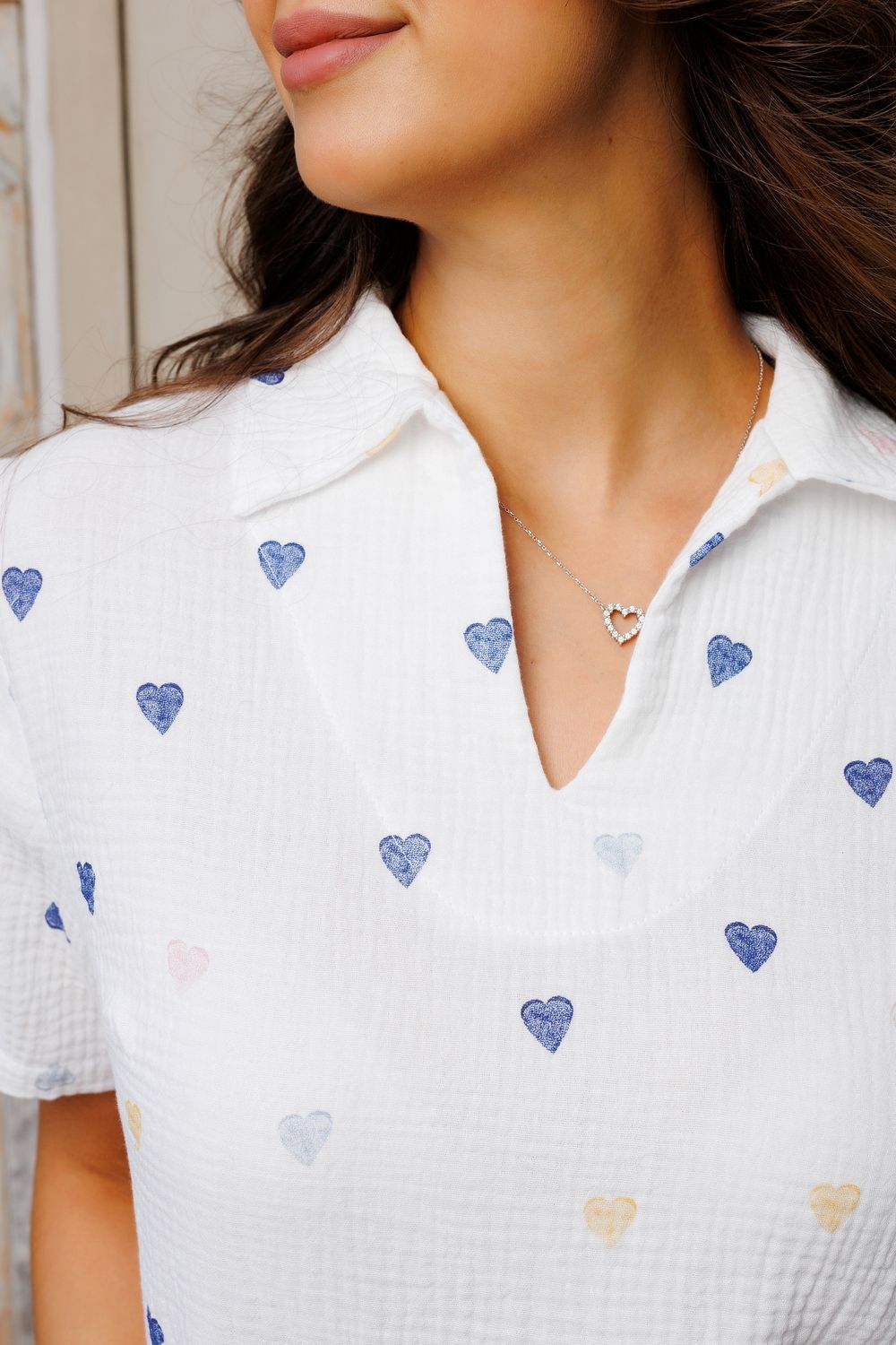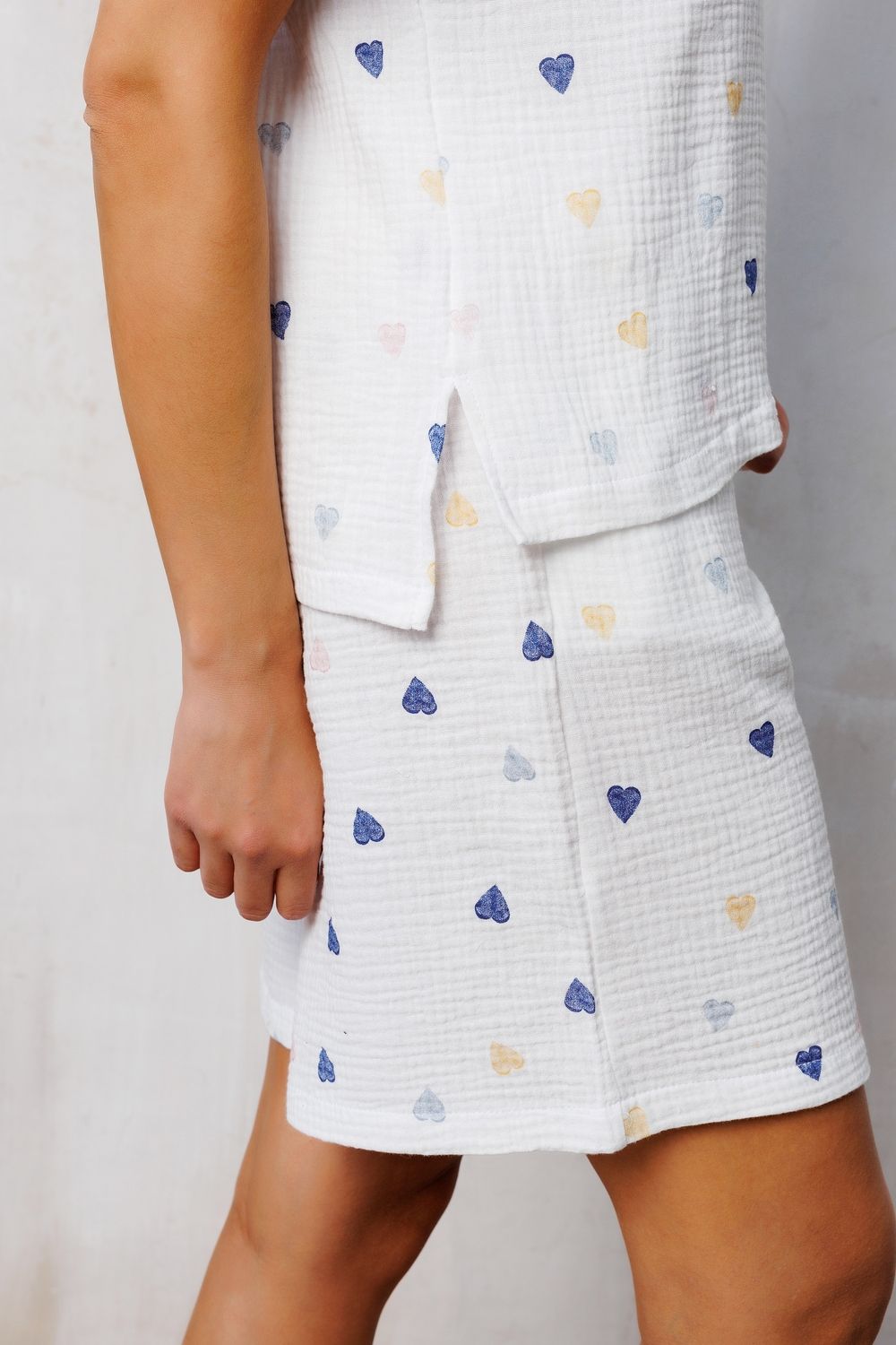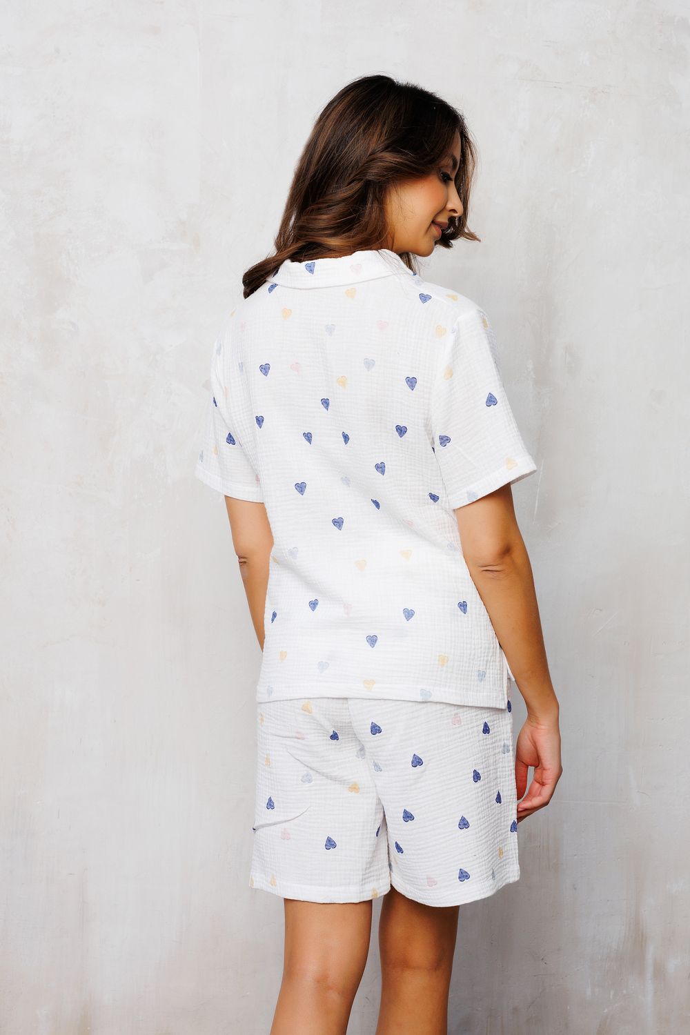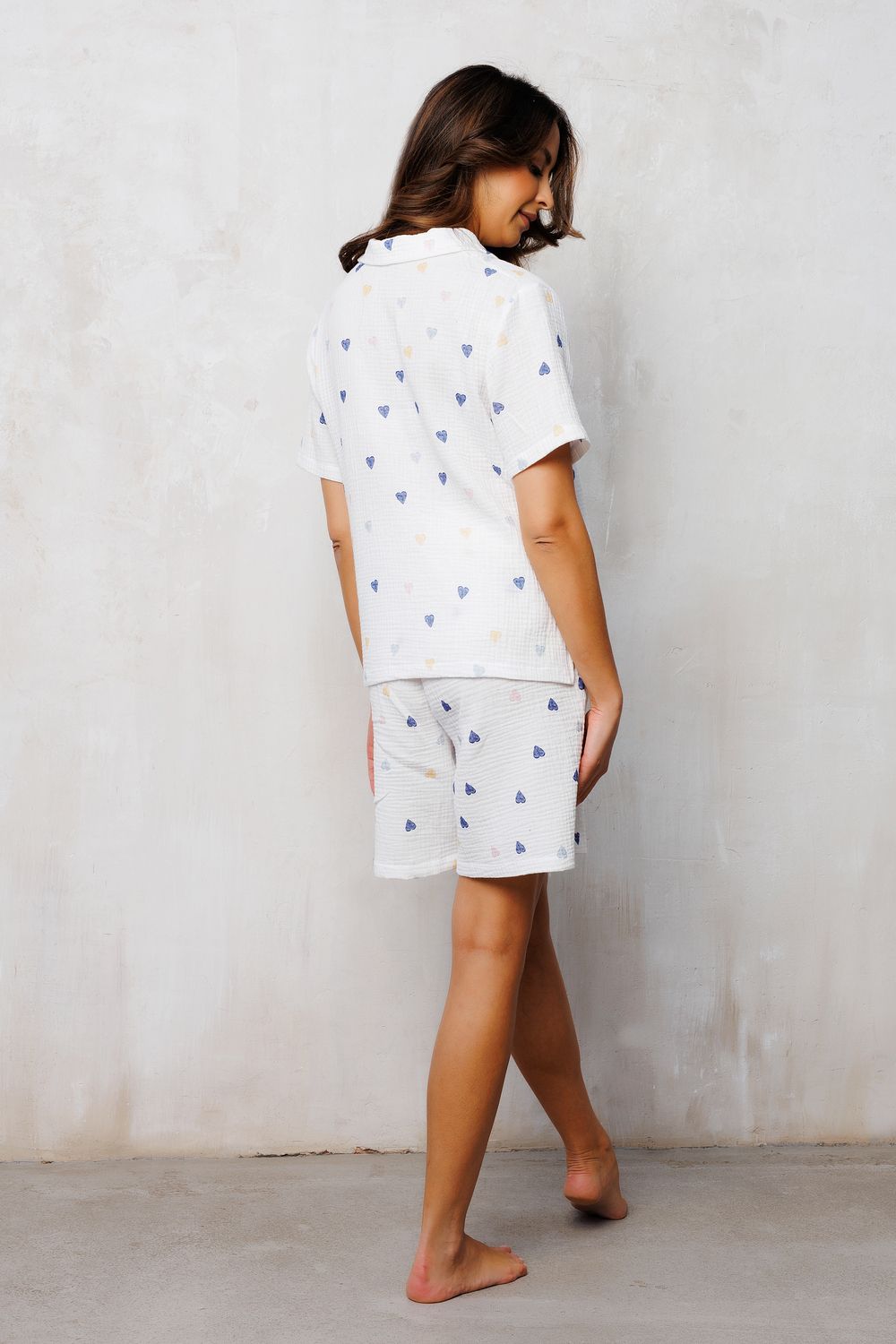 Пижама с шортами женская из муслина от бренда Raposa – идеальный вариант для домашнего отдыха или прогулок по пляжу. Изготовлена из натурального хлопкового текстиля, что делает ее максимально удобной и приятной к телу. Уютная пижамка больших размеров, оверсайз, подойдет как беременным женщинам, так и дамам плюс сайз. Узор в виде разноцветных сердечек придает пижаме особый шарм, а дышащий материал обеспечивает комфорт в жаркую погоду, благодаря чему пижамный комплект вполне применим как универсальный и стильный пляжный костюм. Модная пижама из хлопка 100 % понравится подросткам, эта женственная двойка свободного кроя приятна для тела и совершенно не стесняет движений. Пижама из муслина понравится поклонникам стиля оверсайз, хороша как подарок к любому празднику маме, жене, дочке, любимой девушке.