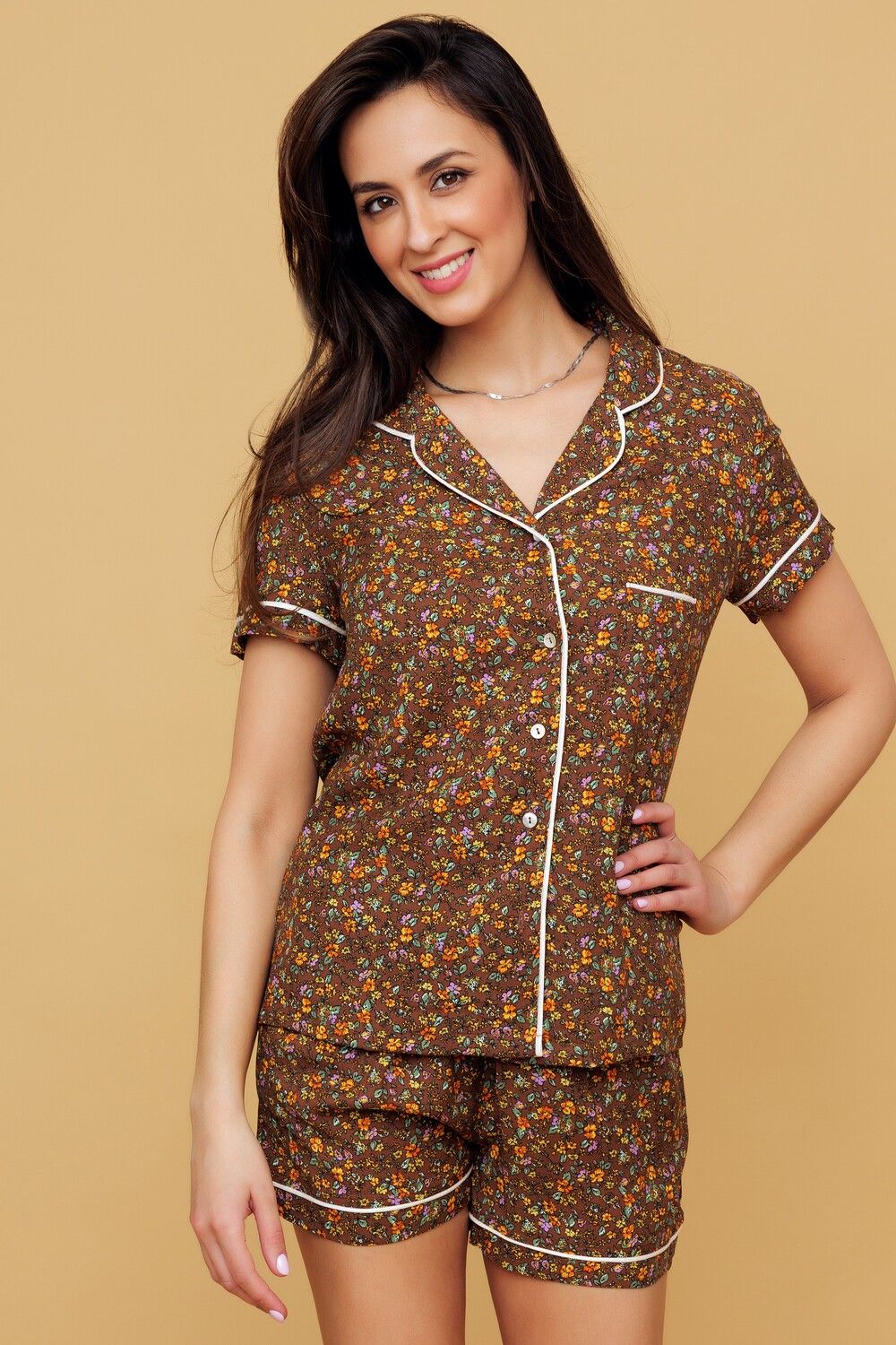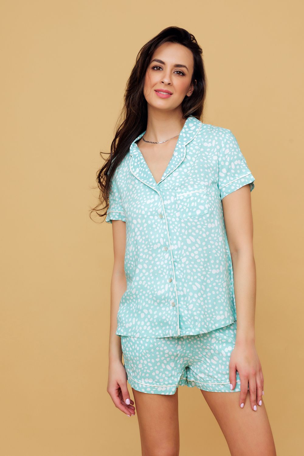 Шорты: Низ пижамы — шорты классического фасона, длиной выше середины бедра, с поясом на резинке. Они выполнены из набивного материала (хлопок) с повторяющимся рисунком (набивкой) "Стрекозы".