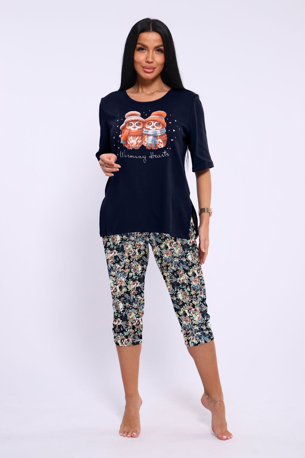 Уютная пижама свободного кроя из 100% хлопка. Футболка с втачным рукавом и разрезами по бокам, на полочке декоративная, глянцевая печать в стиле шелкографии с добавлением глиттера. Бриджи на резинке с карманами и манжетами.
