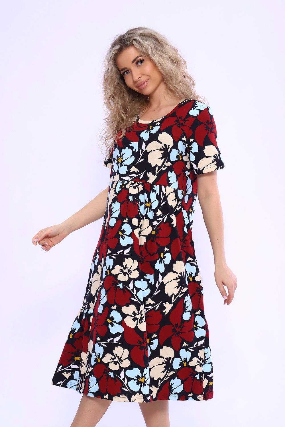 Платье свободного кроя с асимметричной сборкой на юбке, короткими рукавами и удобными карманами в боковых швах.