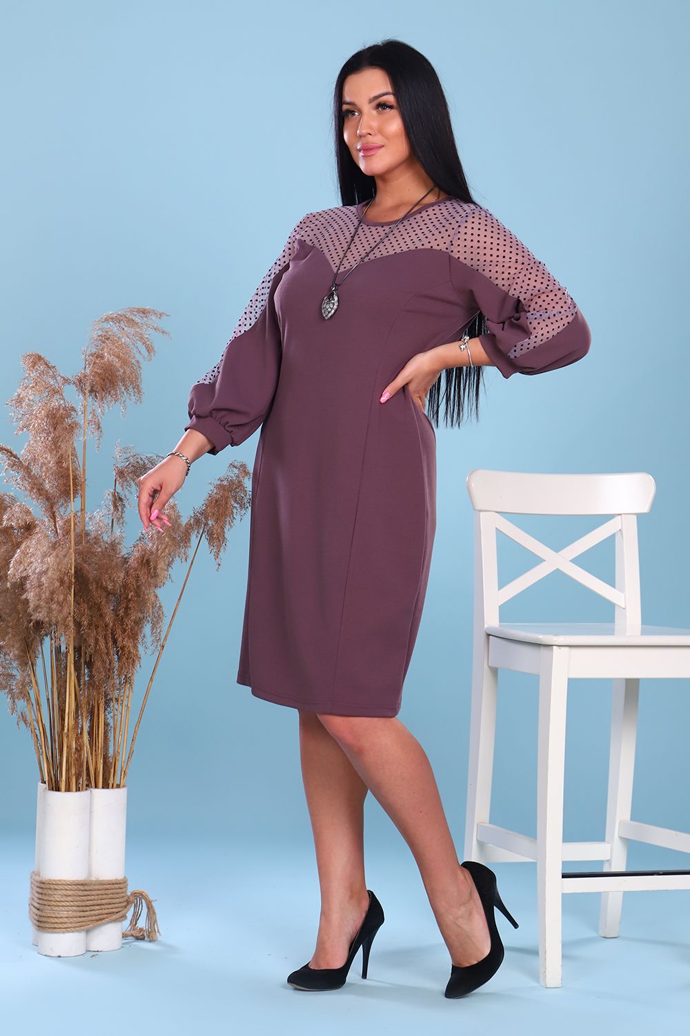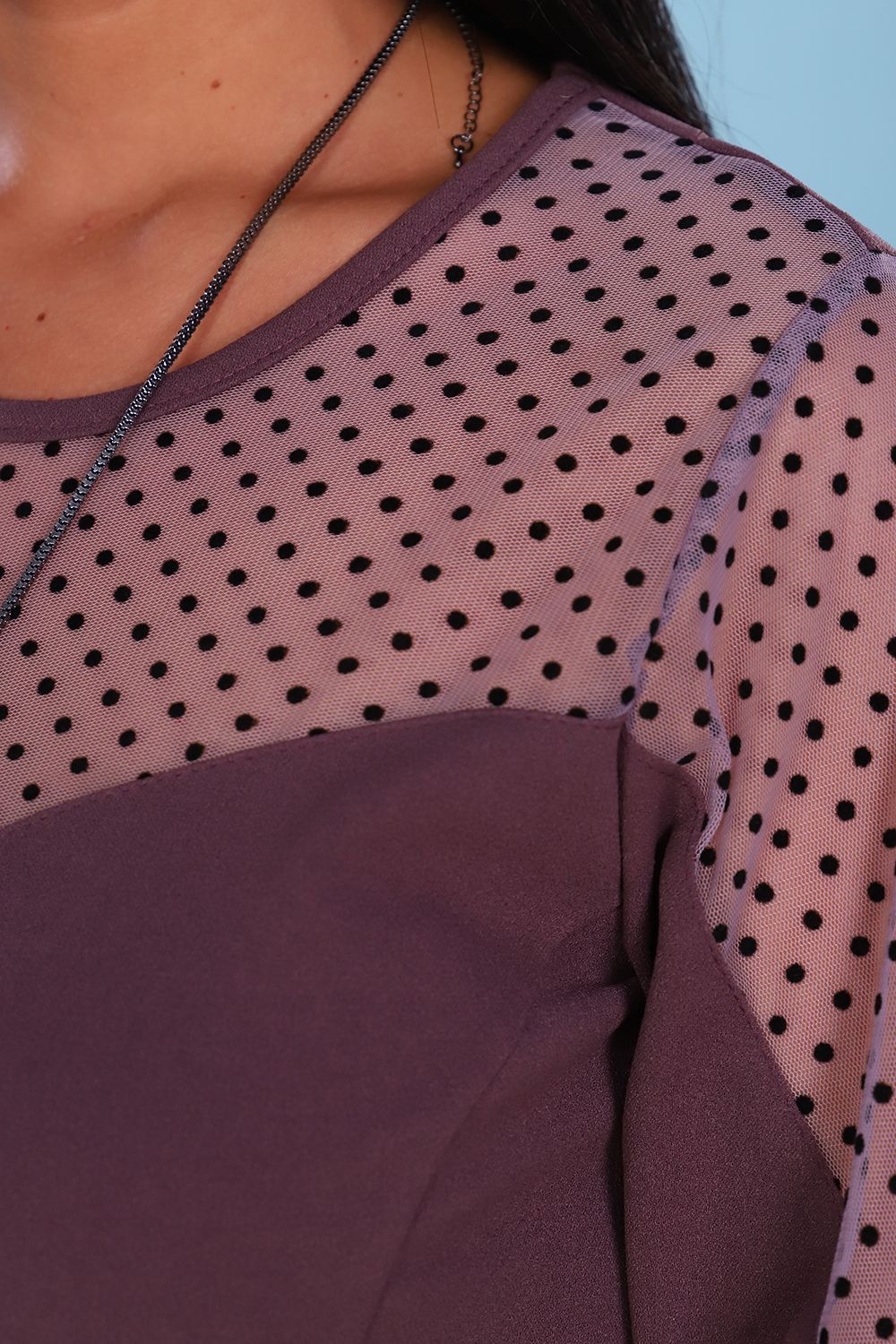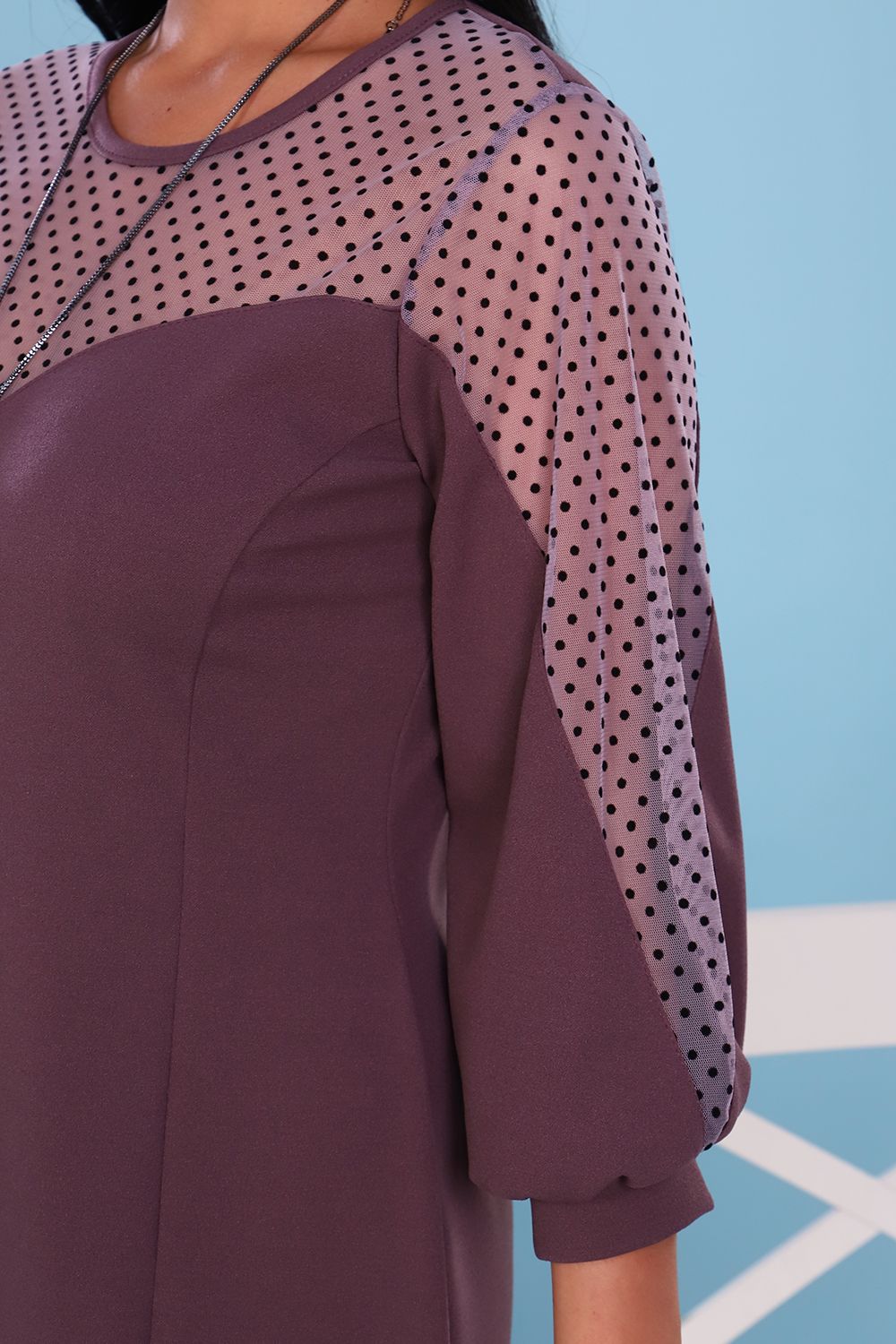 Платье женское - горловина круглая под окантовку, по груди и рукавам сетка в горошек, рукав 3/4 на манжете. Платье с рельефом по переду, длина до середины колена, по спинке шов. На модели 50 размер. Аксессуары в комплект не входят