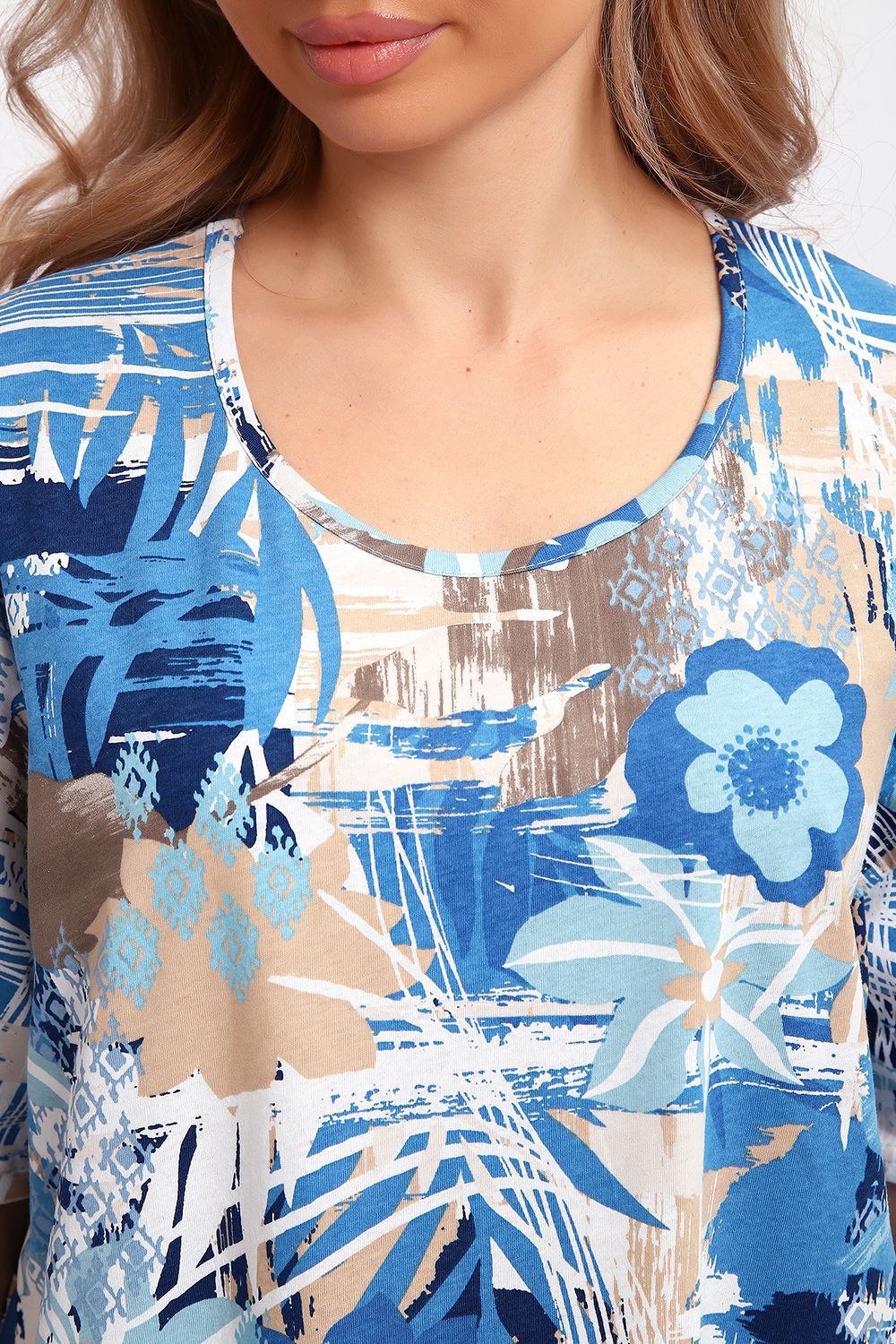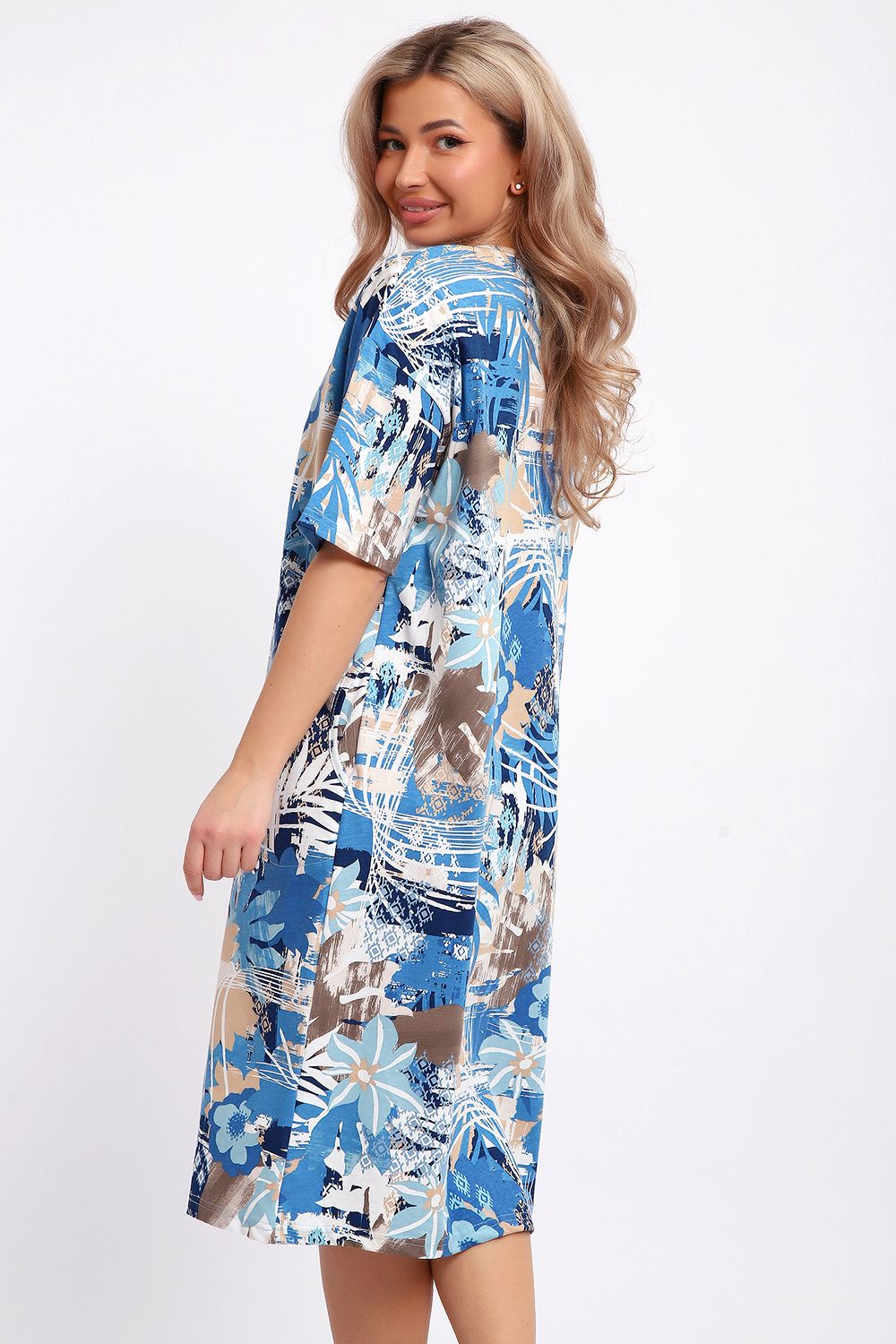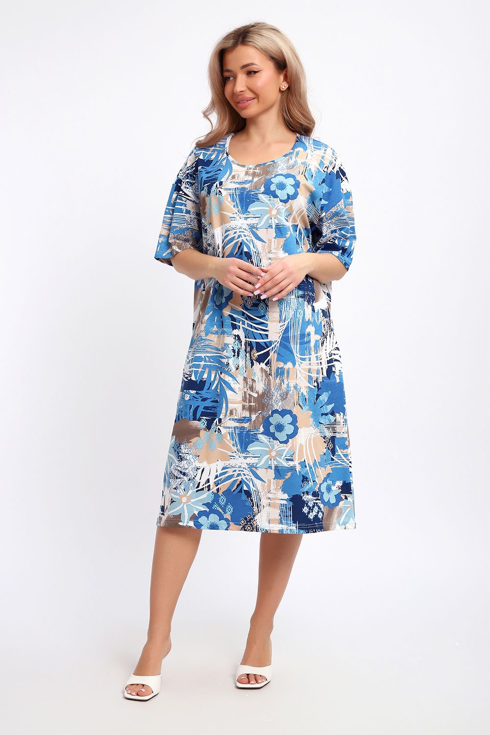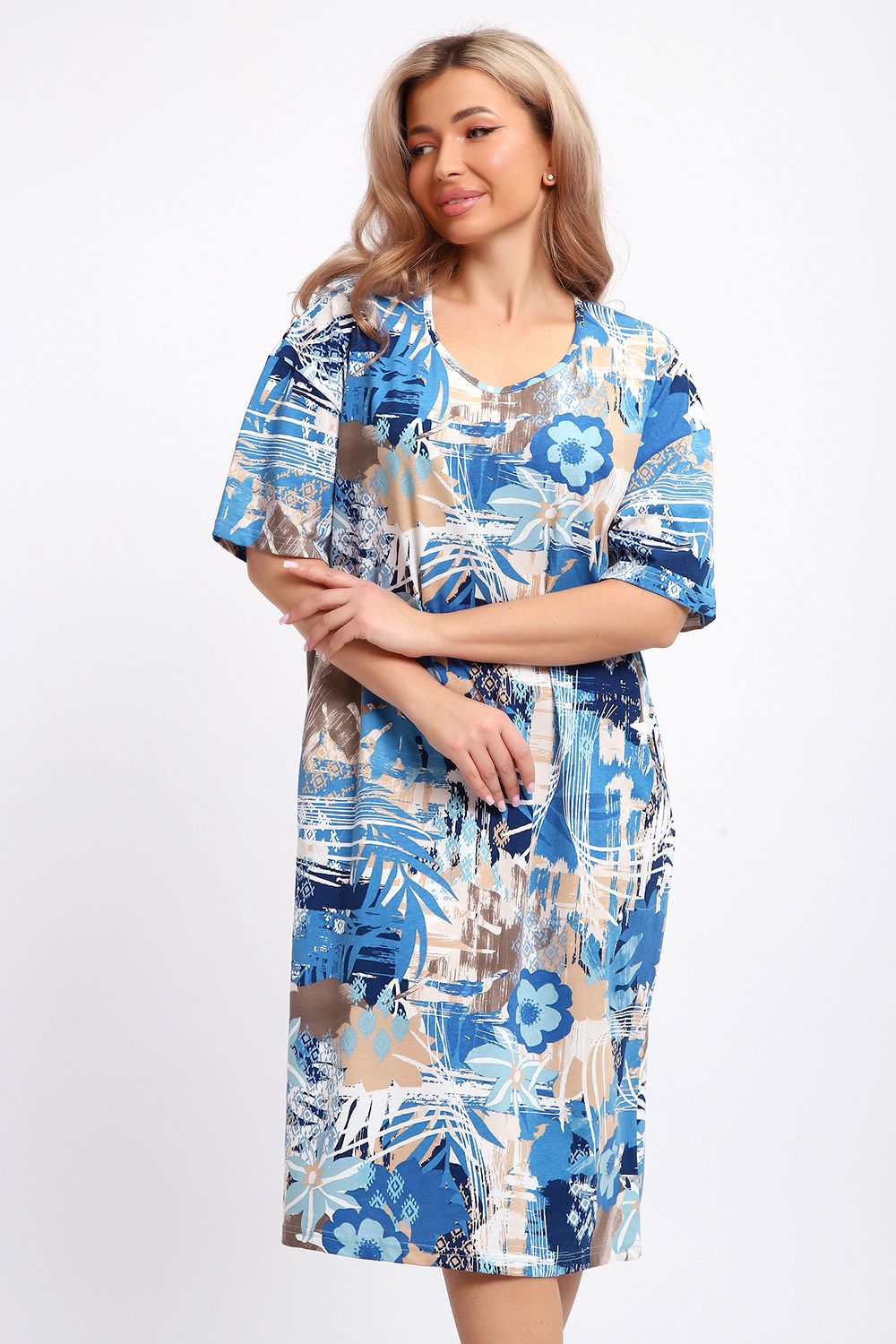 Изготовлено из мягкого хлопкового полотна кулирка, обеспечивает комфорт даже в жаркие дни. Яркий голубой оттенок с орнаментом добавляет свежести любому образу. Комфортная длина чуть закрывает линию колена. Стирать в бережном режиме, до 40С, не выкручивать, сушить в расправленном виде.