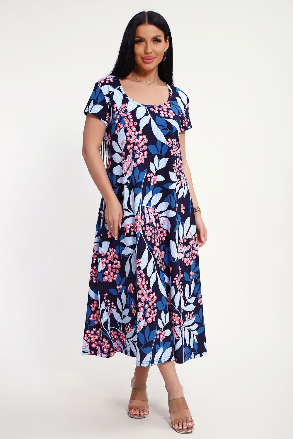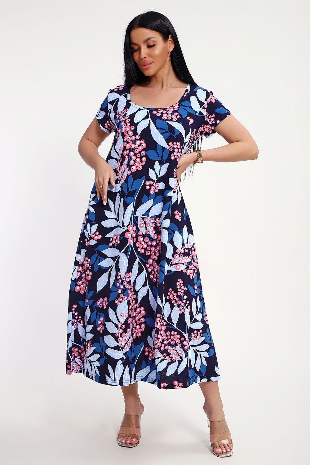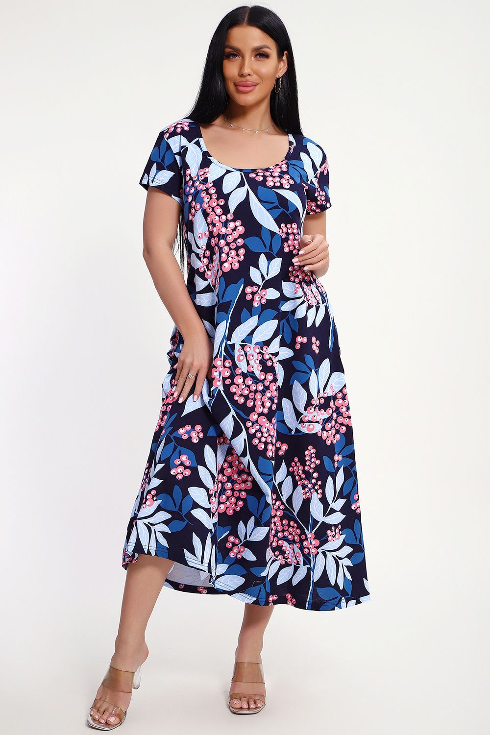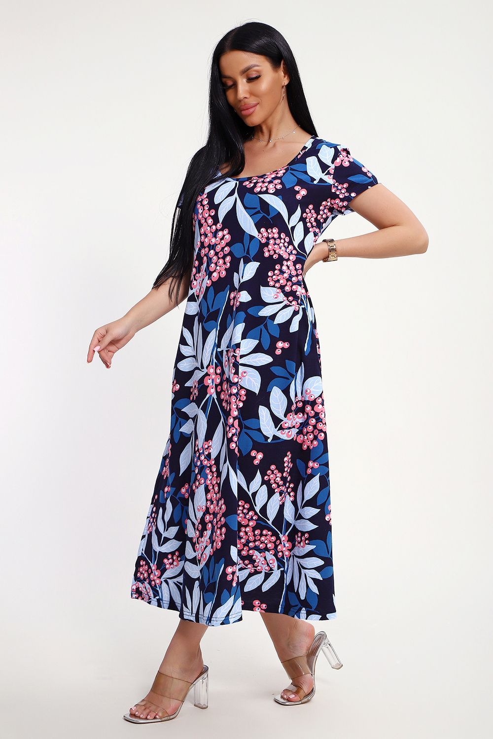 Свободный покрой создает комфортную атмосферу даже в жару. Легкая кулирная гладь обеспечивает мягкость и дышащую поверхность, идеально подходящую для повседневных прогулок. Яркие оттенки — синий, голубой, розовый. Продуманная детализация: классический фасон подчеркивает стройность фигуры. Длина - полноценное миди, подол расклешен, рукава втачные короткие, имеются боковые карманы.