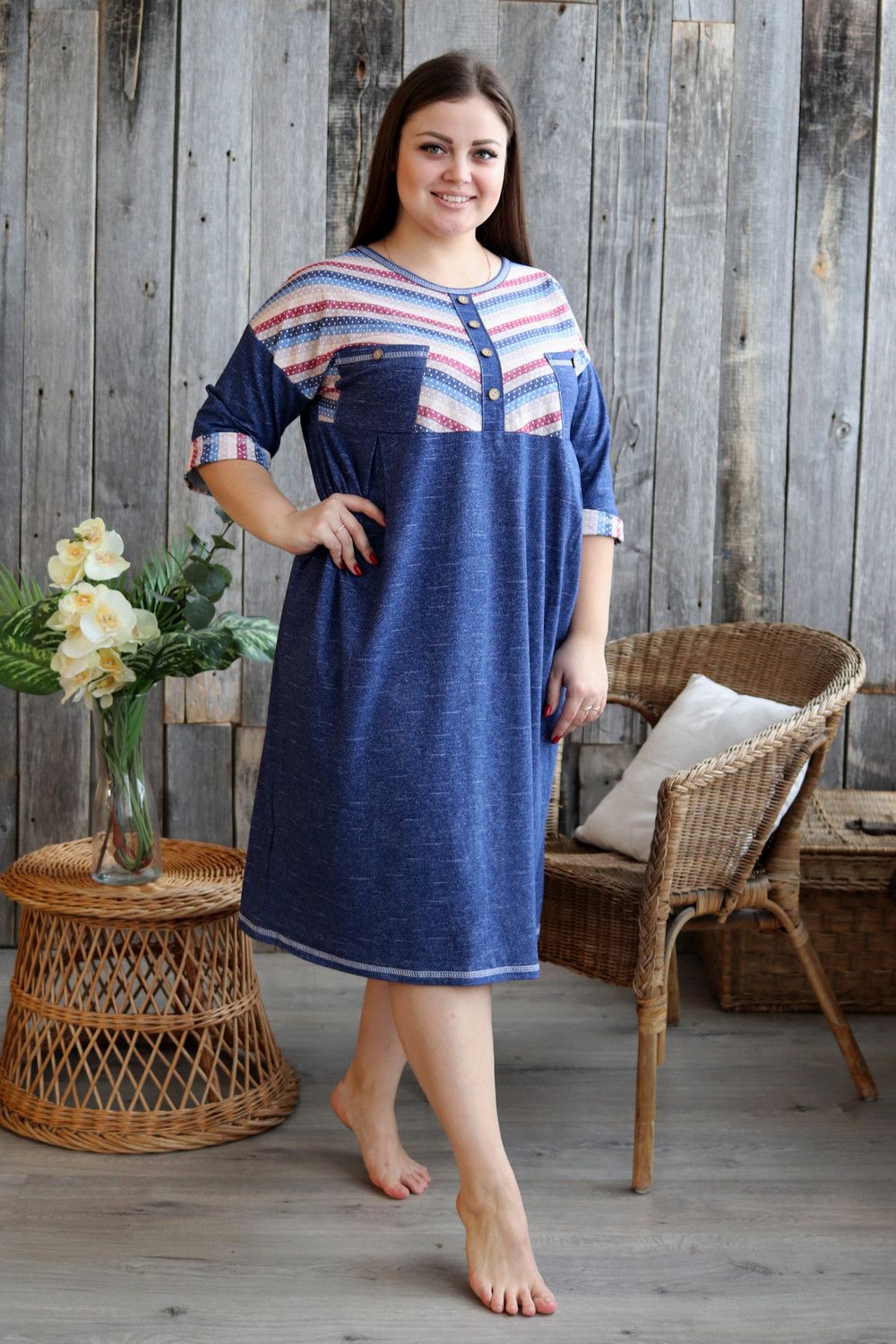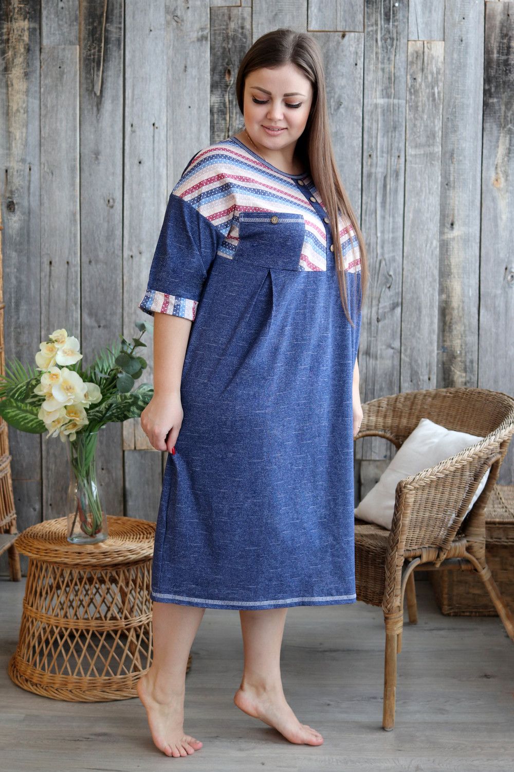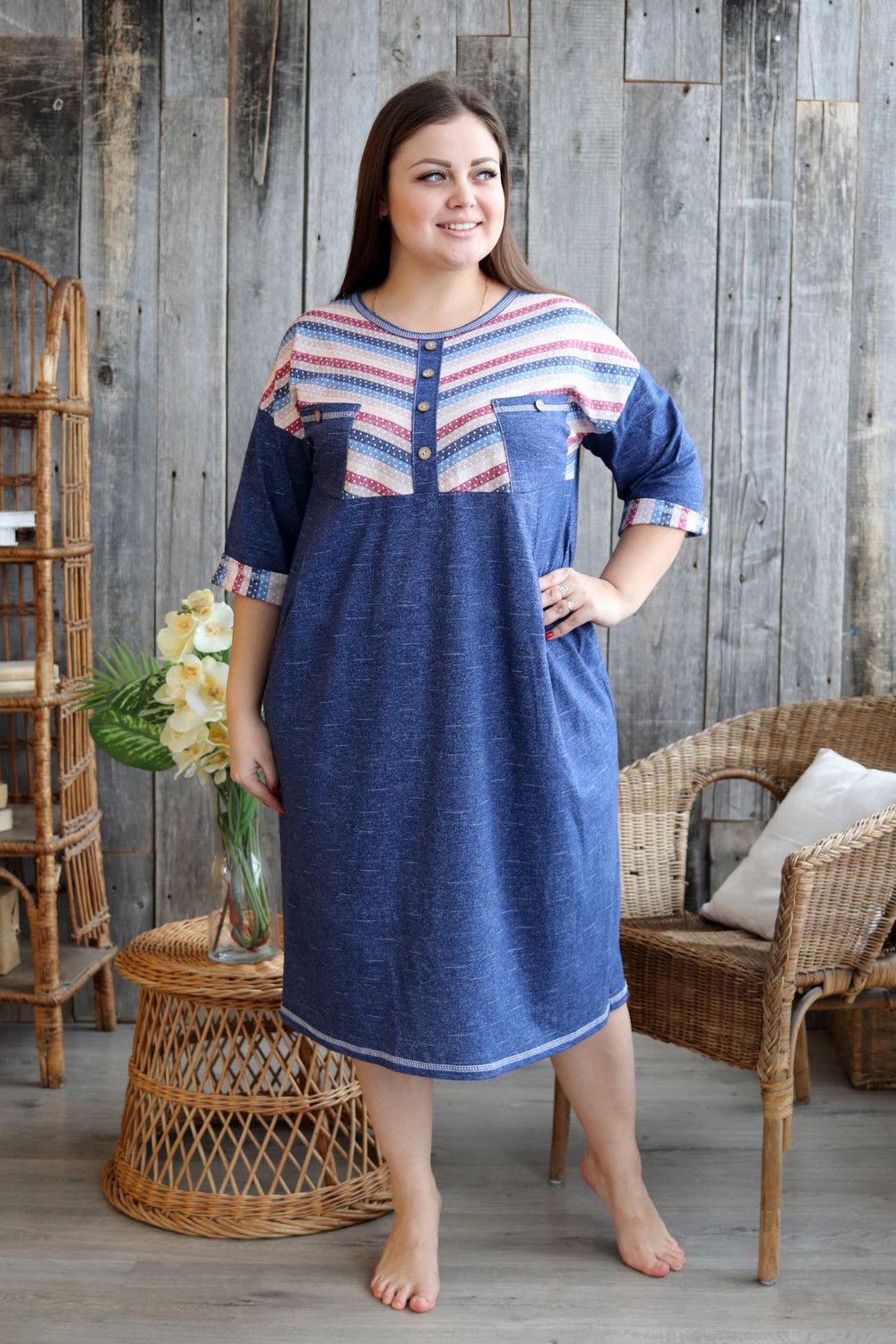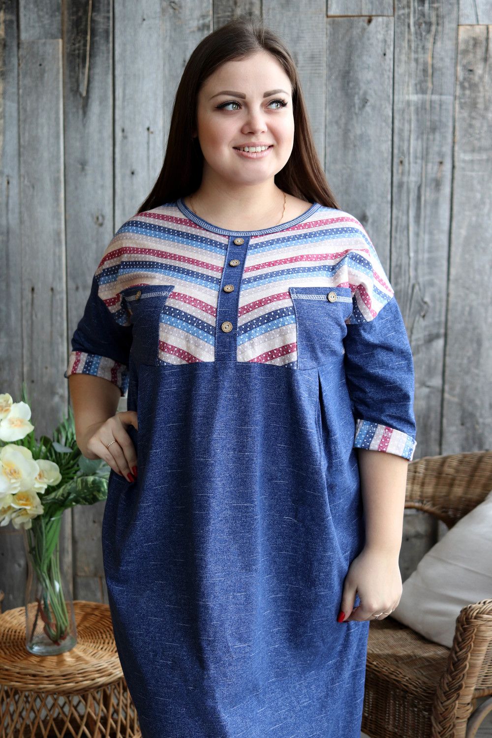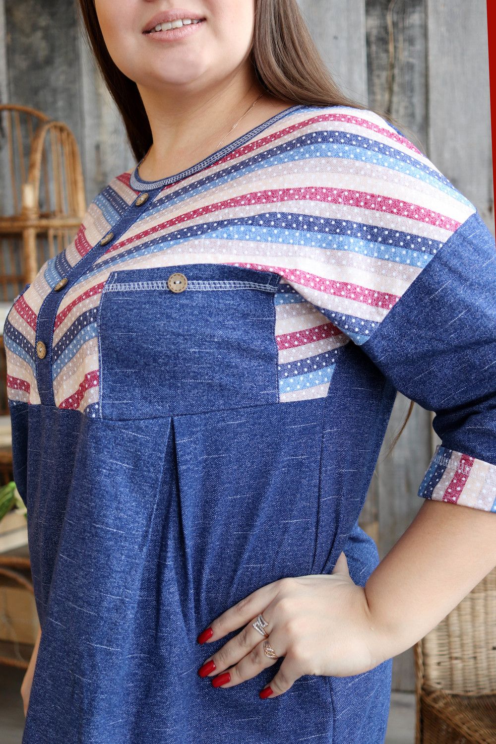 Платье женское прямого силуэта. Рукав цельнокроенный со швом. Верхняя часть полочки и манжета рукава из отделочной ткани в полоску. В верхней части полочки накладные карманы и имитация планки, в нижней: встречные складки, обеспечивающие дополнительную свободу в области талии и бедер. На модели 52 размер