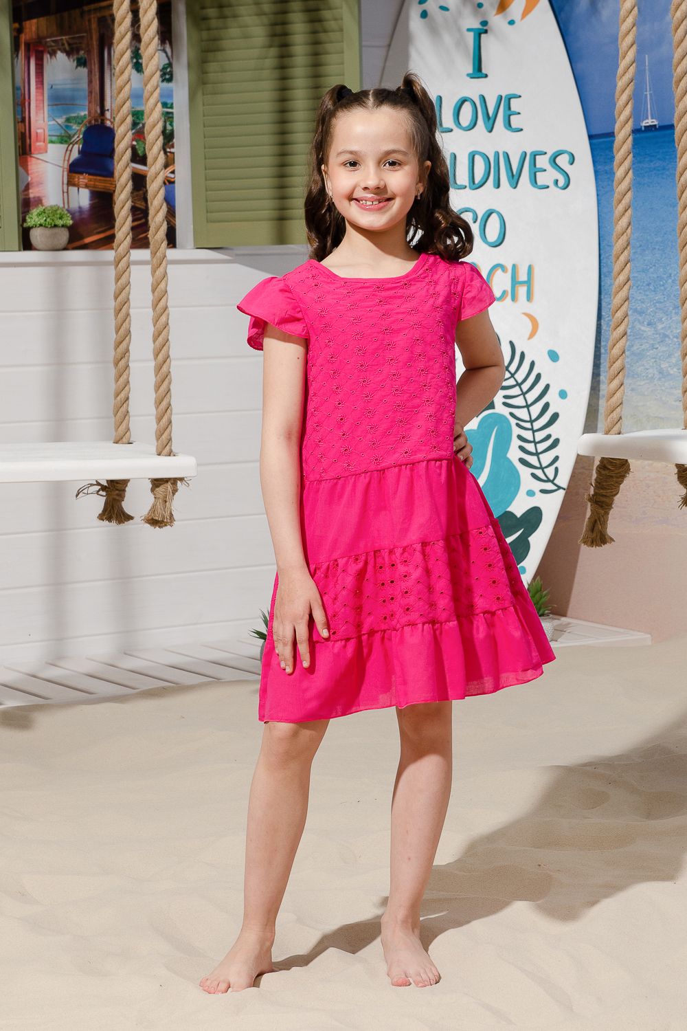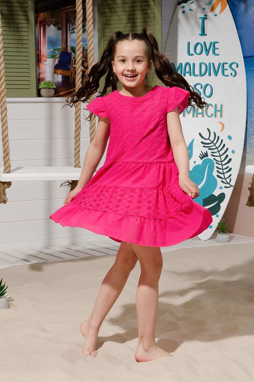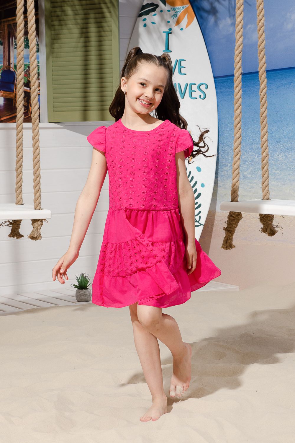 Платье детское, расширенное к низу. Рукав "крылышко". Горловина округлая, сзади завязки. Три яруса платья из тканей компаньонов. Платье из шитья, в состав которого входит 100% хлопок, ткань комфортна и гигроскопична.