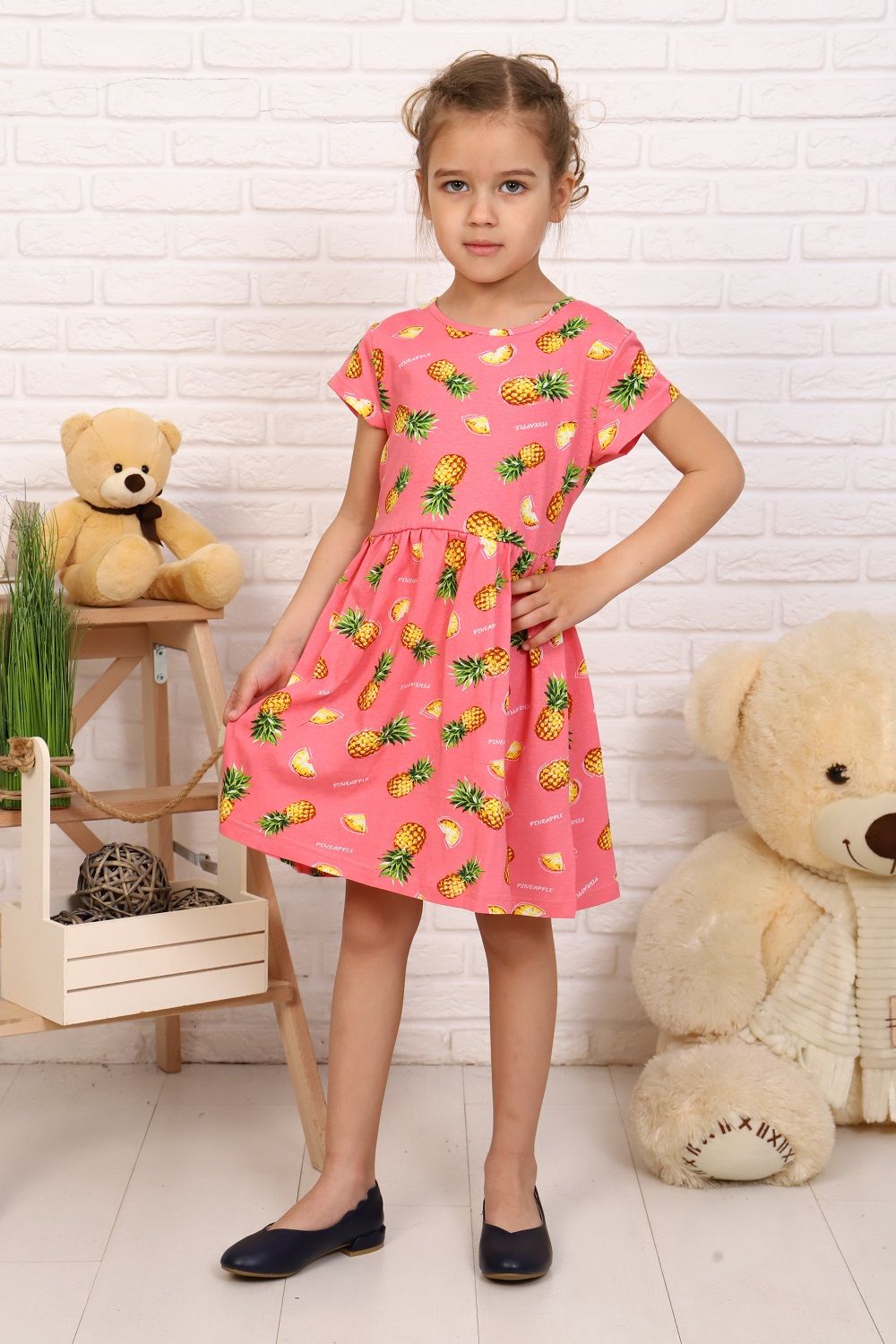 Платье для девочек дошкольного и младшего школьного возраста, из трикотажного полотна кулирка с лайкрой с рисунком. Платье прилегающего силуэта, отрезное и расклешенное от линии талии, с втачным длинным одношовным рукавом, с обтачкой в горловине. Низа рукавов и нижней части платья подогнуты. По шву втачивания обтачки в горловину проложена отделочная строчка. Спереди на верхней части платья нанесен печатный рисунок.