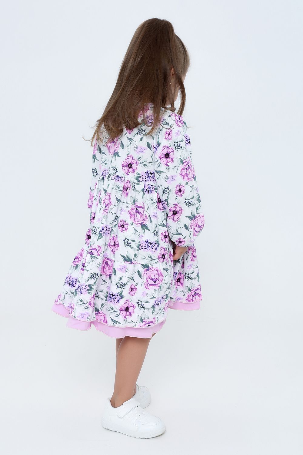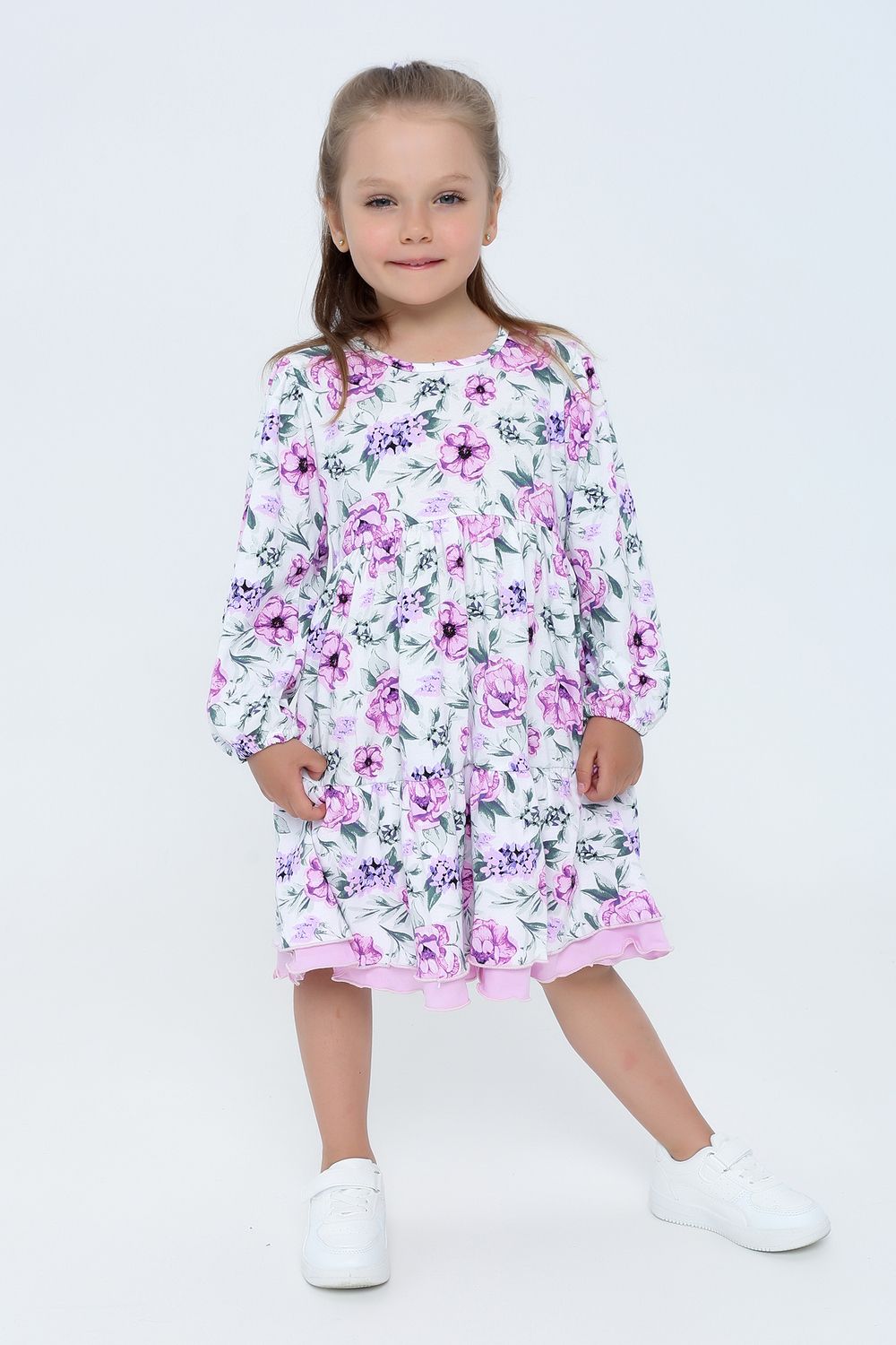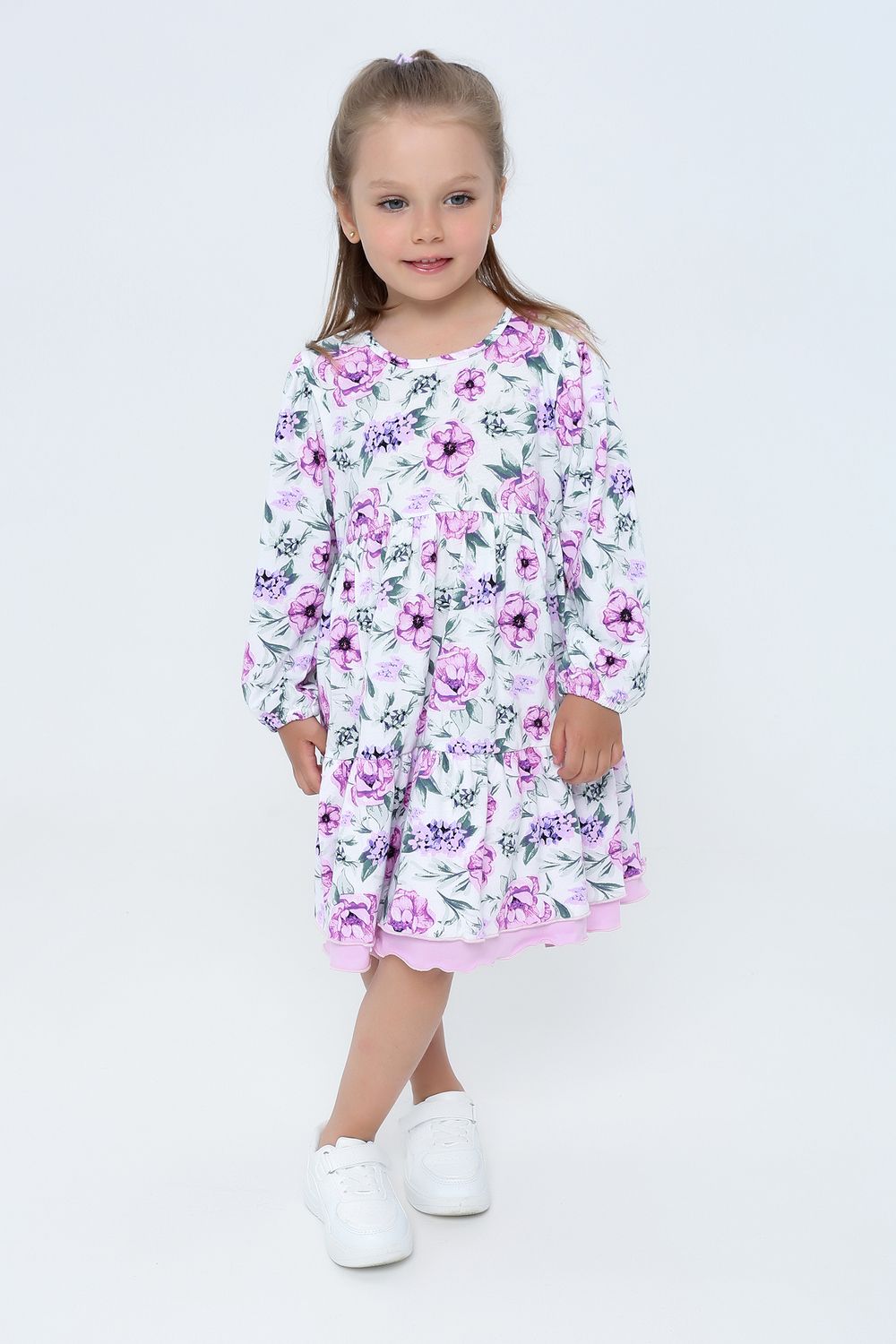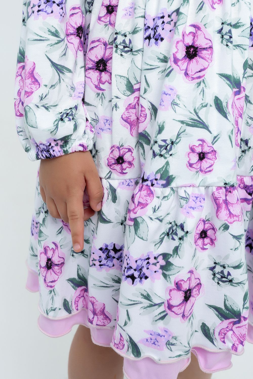 Платьице с длинным рукавом порадует своей продуманностью деталей: свободный рукав, аккуратно зафиксированный аккуратной резинкой, уютно облегает ручку ребенка, позволяя избежать дискомфорта и обеспечивая комфортное надевание и снятие изделия. Круглый вырез горловины подчеркивает изящность шеи и дарит дополнительное удобство.