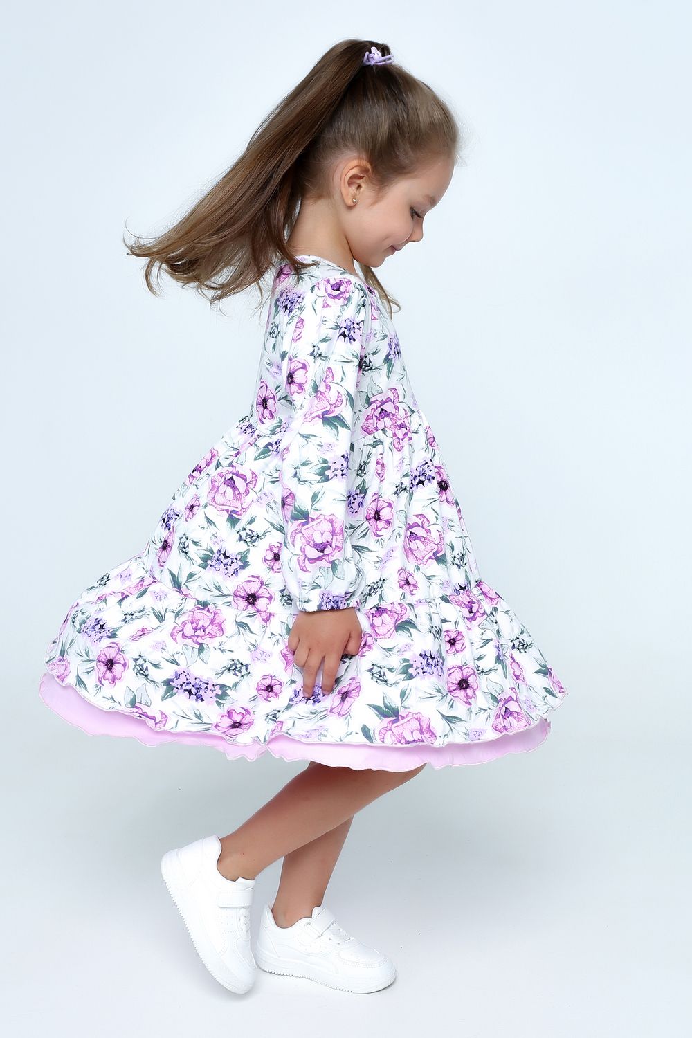 Нежный рисунок крупных цветов насыщенного сиреневого оттенка гармонично смотрится на белоснежном фоне ткани, подчеркивая красоту каждой детали дизайна и делая образ особенно привлекательным и женственным.