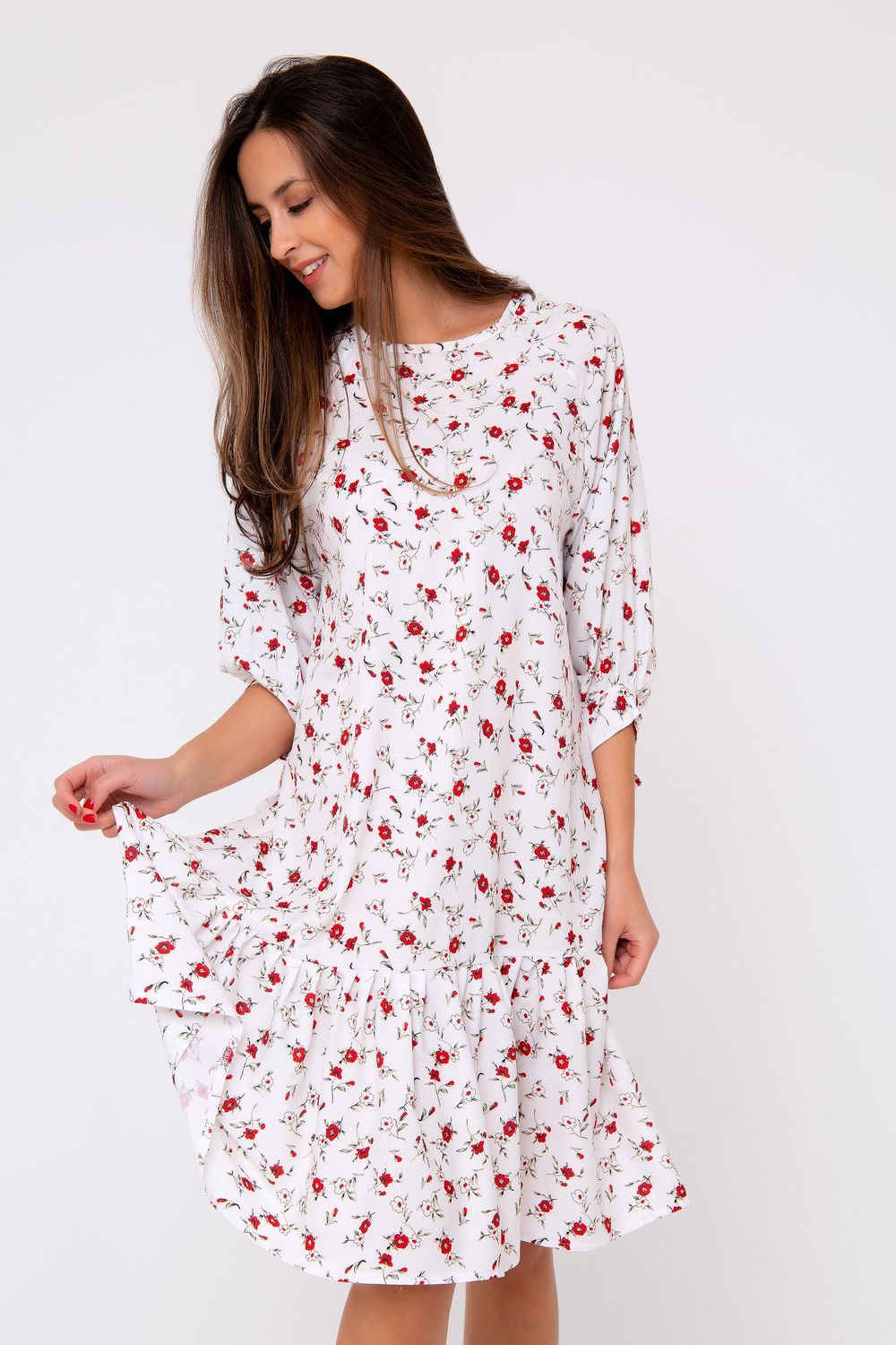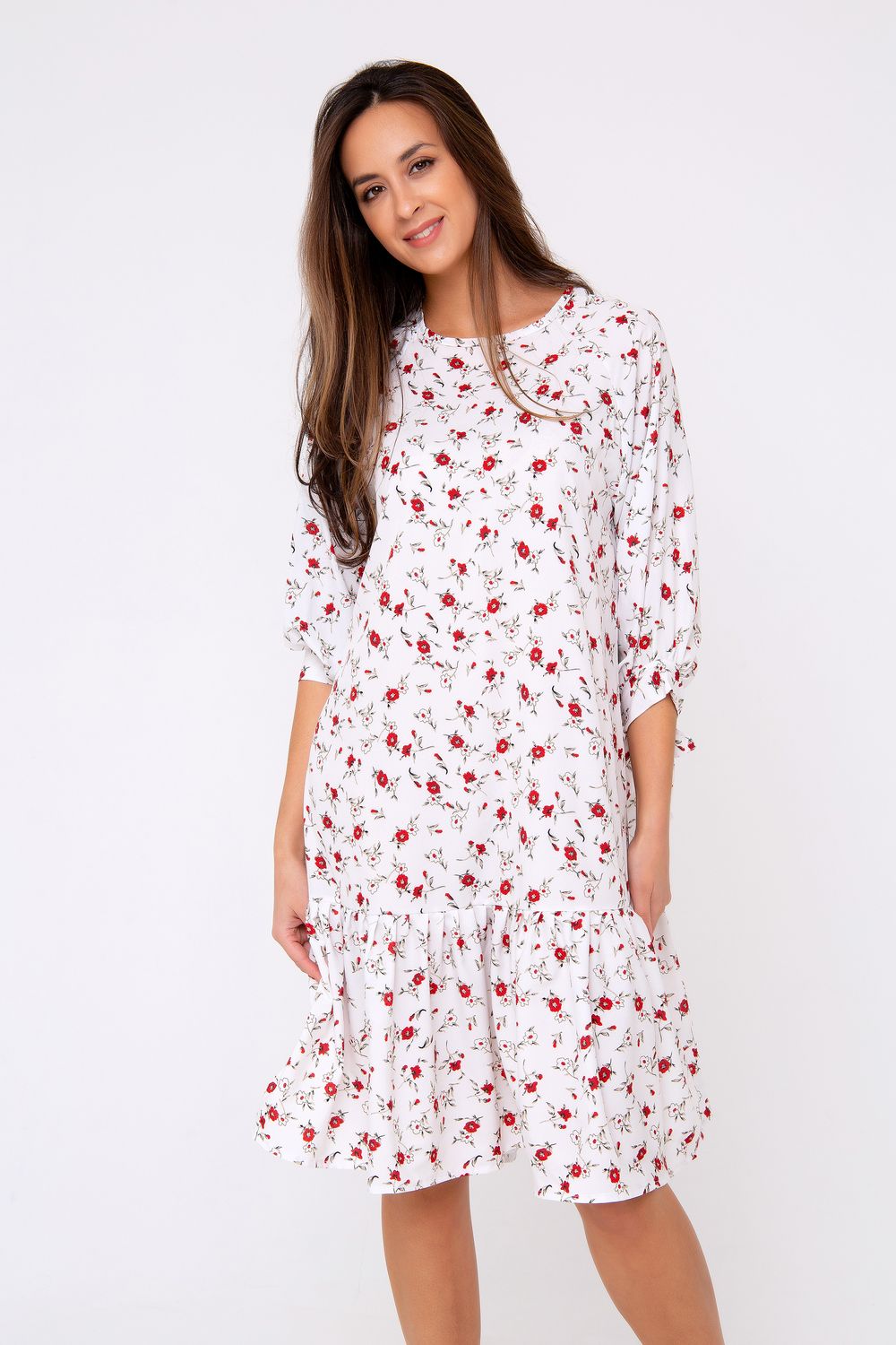 Платье-миди свободного кроя выполнено в нежнейшем молочно-белом цвете. Женственность модели подчеркивает оригинальный принт в стиле «petit fleur» по всей длине изделия. Свободный крой подчеркнет только достоинства фигуры и добавит легкости и игривости всему образу в целом. Рукав - реглан. Горловина округлая. Модель дополнена воланом по краю изделия. Приобретите легкость, комфорт и свободу на каждый день, ведь эта вещь полюбится Вами с первого прикосновения. Все товары бренда Raposa производятся в России, используются ткани только премиального качества. Ограниченная коллекция только для этой весны!