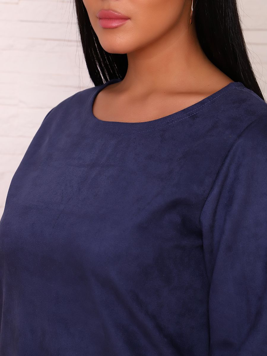 Платье прямого силуэта из замшевой ткани с рукавом ниже локтя. Горловина и низ платья подшиты плоскошовным швом.