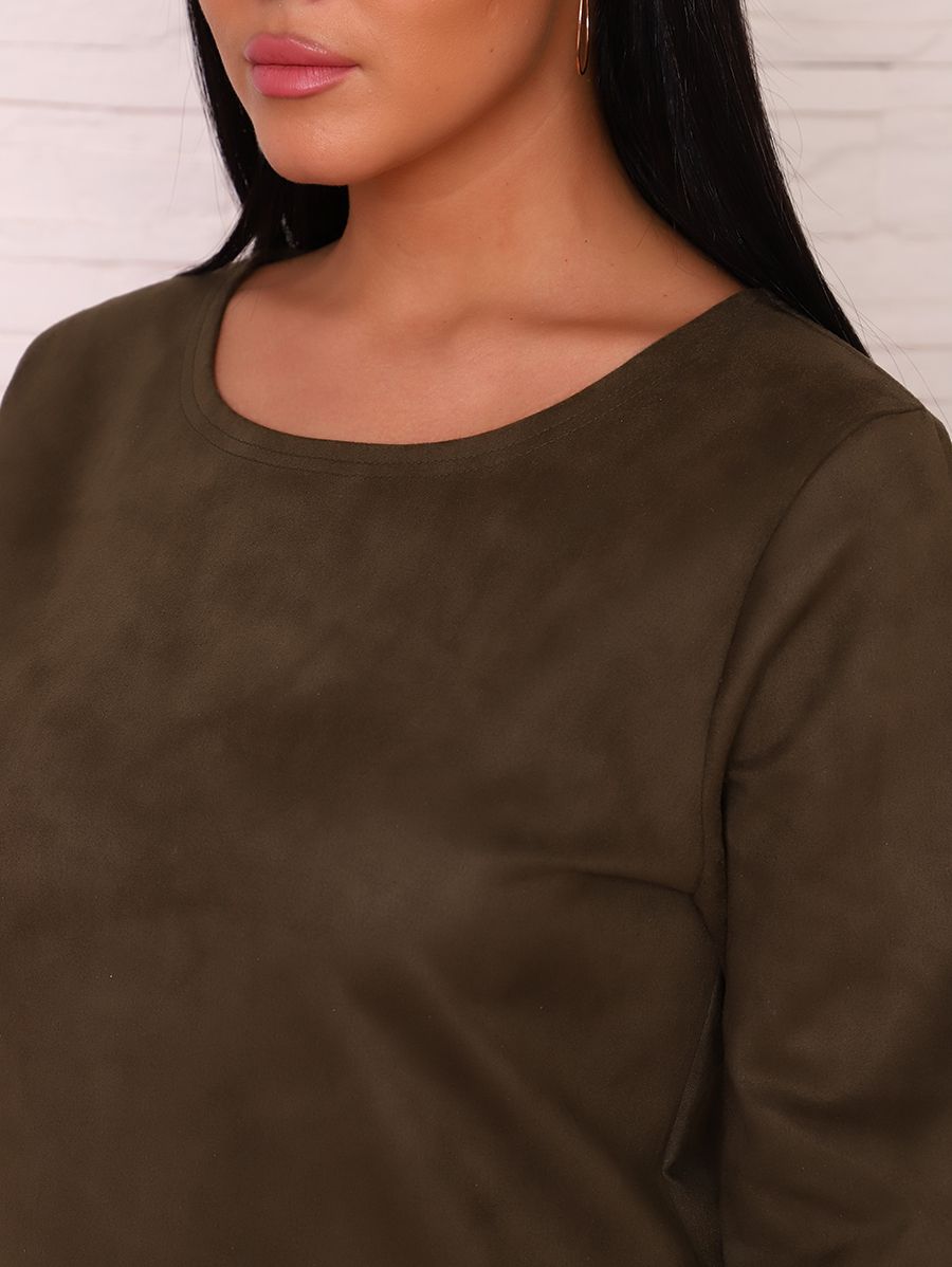 Платье прямого силуэта из замшевой ткани с рукавом ниже локтя. Горловина и низ платья подшиты плоскошовным швом.