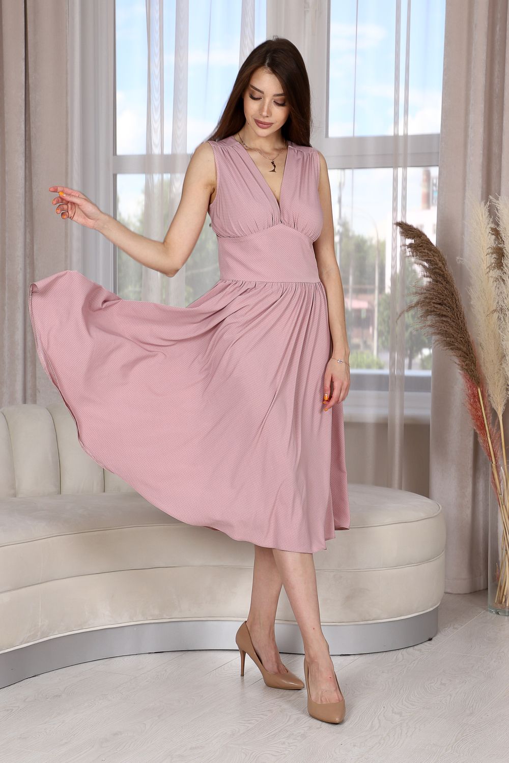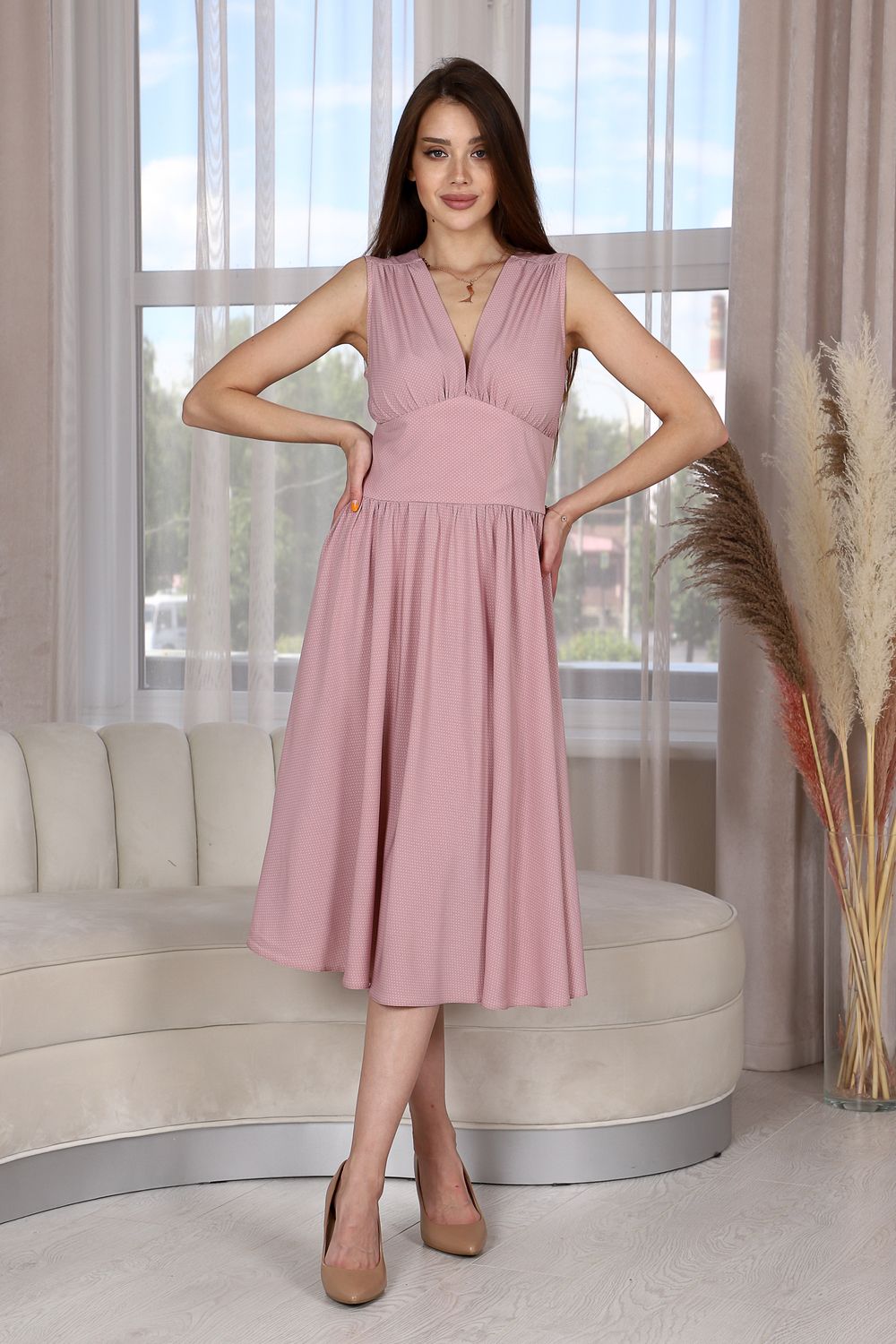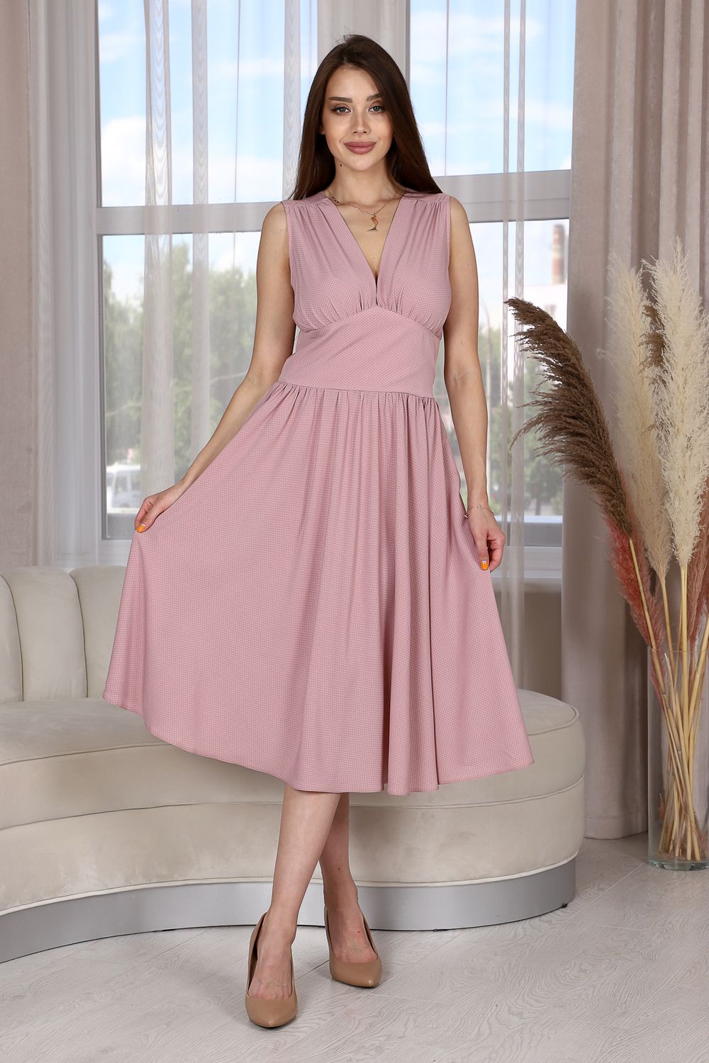 Легкое и романтичное, приталенное платье без рукавов с широкой юбкой-полусолнце - прекрасное решение для жаркого времени года. Ткань в мелкий горошек неизменно пользуется успехом у женщин всех возрастов и комплектаций. Оно тонкое и изящное, в нем вы будете чувствовать себя свободно и комфортно. Платье на высокий рост.