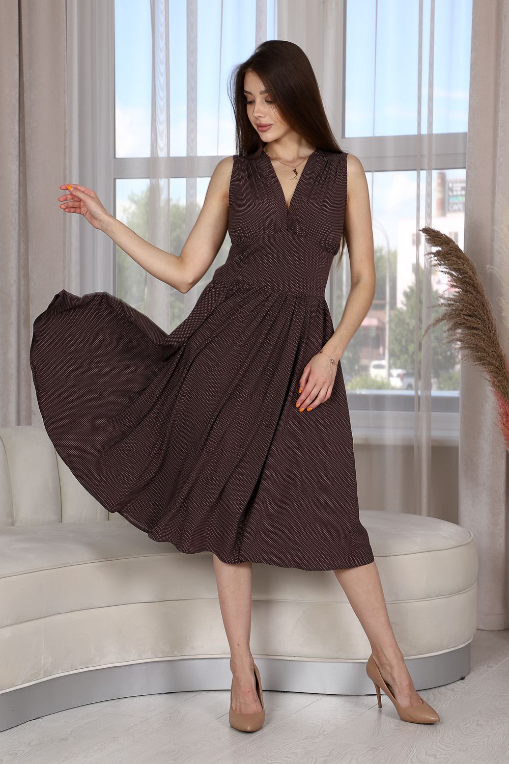 Легкое и романтичное, приталенное платье без рукавов с широкой юбкой-полусолнце - прекрасное решение для жаркого времени года. Ткань в мелкий горошек неизменно пользуется успехом у женщин всех возрастов и комплектаций. Оно тонкое и изящное, в нем вы будете чувствовать себя свободно и комфортно. Платье на высокий рост.
