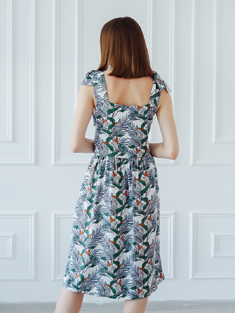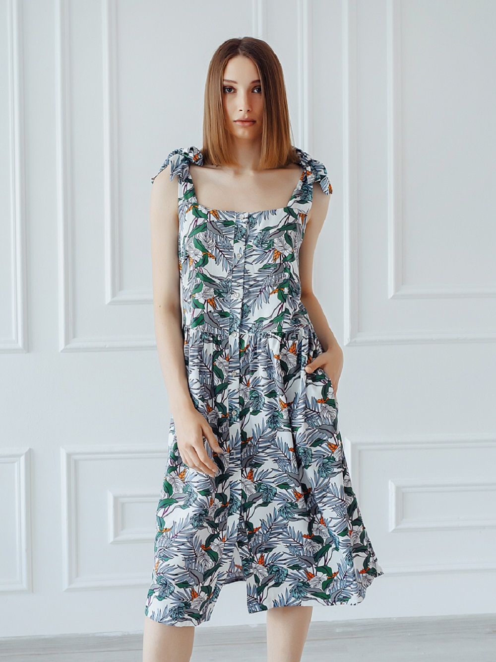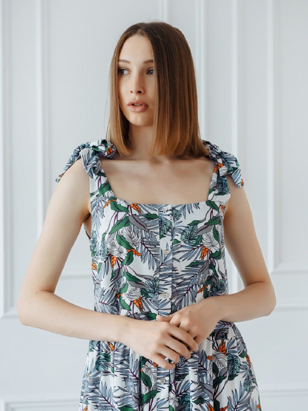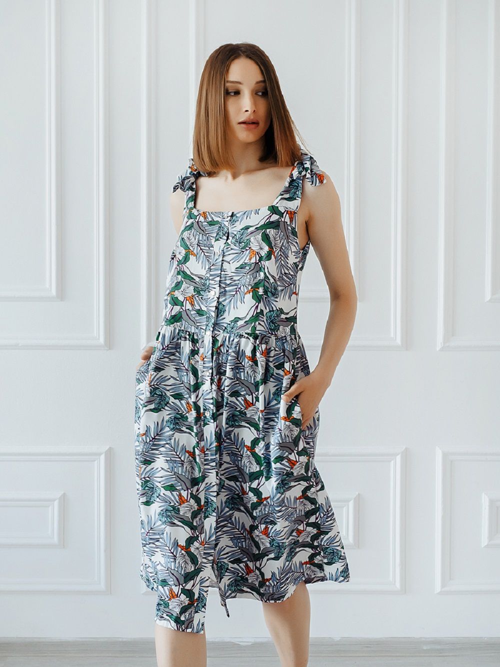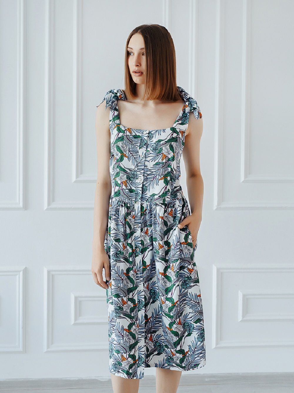 Сарафан женский летний из штапеля полуприлегающего силуэта длиною до колена с застежкой на пуговицы. По линии талии расположена легкая сборка. Бретели сарафана декорируются в банты. В боковых швах расположены карманы. Платье летнее женское из тонкой вискозы - штапель. Штапель это натуральный, легкий и дышащий материал. В таком платье Вы будите чувствовать себя комфортно даже в самый жаркий летний день. Летнее платье универсально, Вы можете создать легкий спортивный образ с кедами или романтичный, надев босоножки на каблуке. Дополните платье различными аксессуарами (серьги, сумочки, ремешки, бусы) и можете собрать вечерний образ. Стильное, модное, романтичное отлично подойдет для фотосессии. Платье из штапеля можно взять с собой на отдых или использовать как домашнее платье. Подойдет как стройным девушкам, так и дамам с пышными формами. Благодаря крою подойдет беременным и кормящим, а натуральная ткань не вызовет дискомфорта. Обращаем Ваше внимание, что платье выполнено из натуральной ткани и может дать усадку от 4 до 7 %, учитывайте это при заказе изделия. Платье из штапеля будет отличным подарком девушке, сестре, подруге, маме, племяннице и любимой женщине на день рождения, юбилей, годовщину свадьбы, новый год или просто без всякого повода.