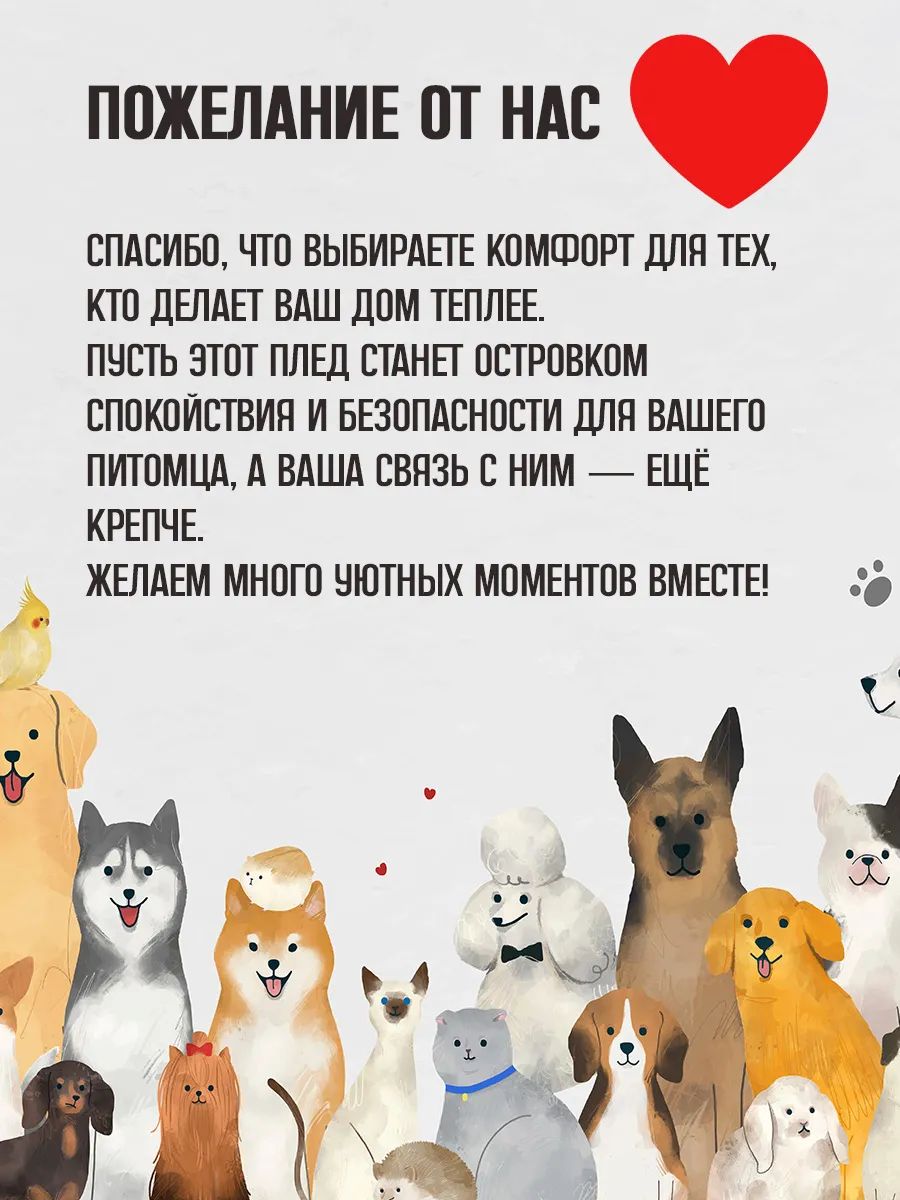 Дарите своим питомцам уют, радость и удобство. Не забудьте добавить этот уютный плед в свою коллекцию предметов для ухода за вашим питомцем! Закажите наш маленький плед для животных прямо сейчас и удивите своего питомца его новым аксессуаром!