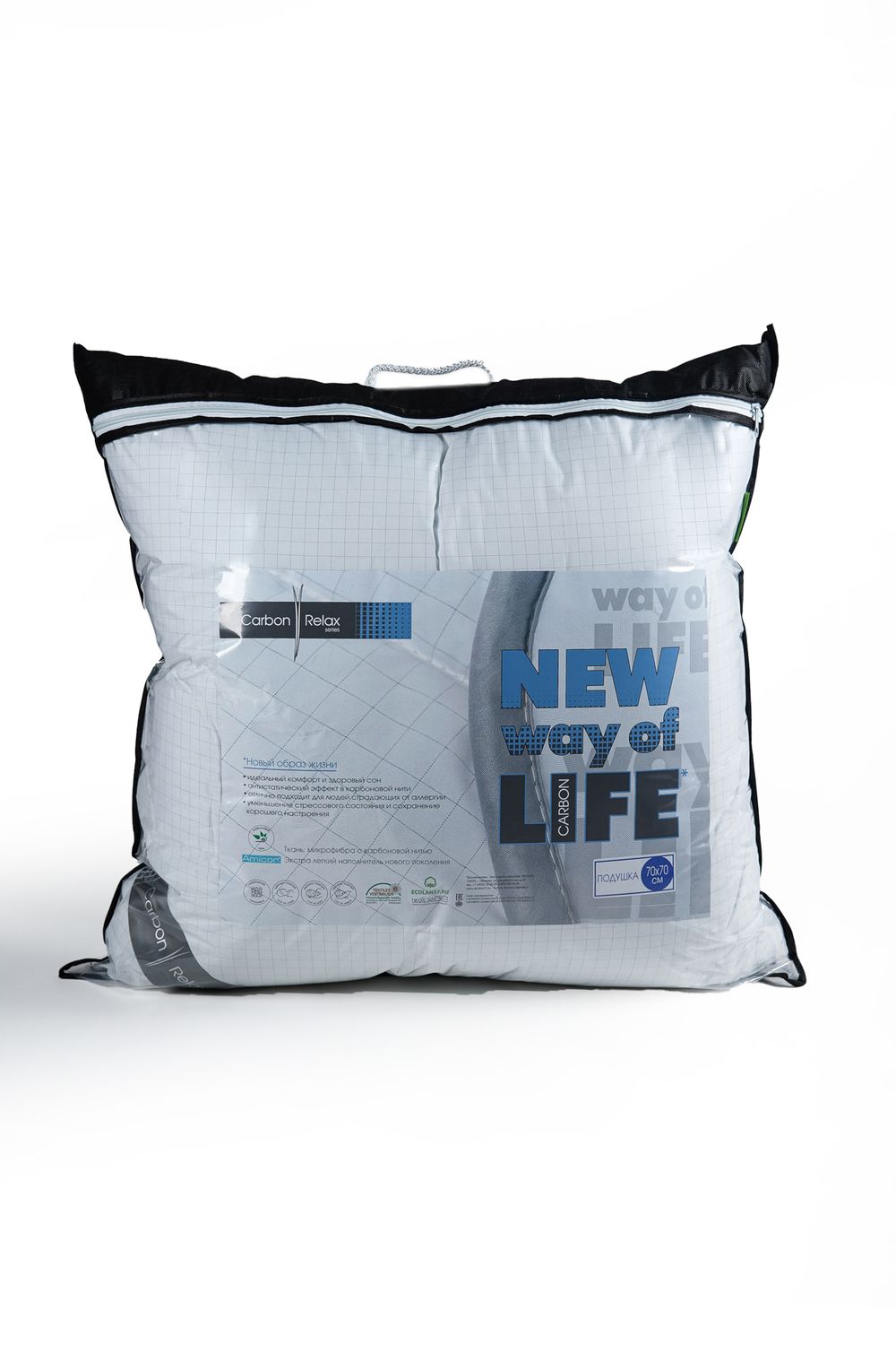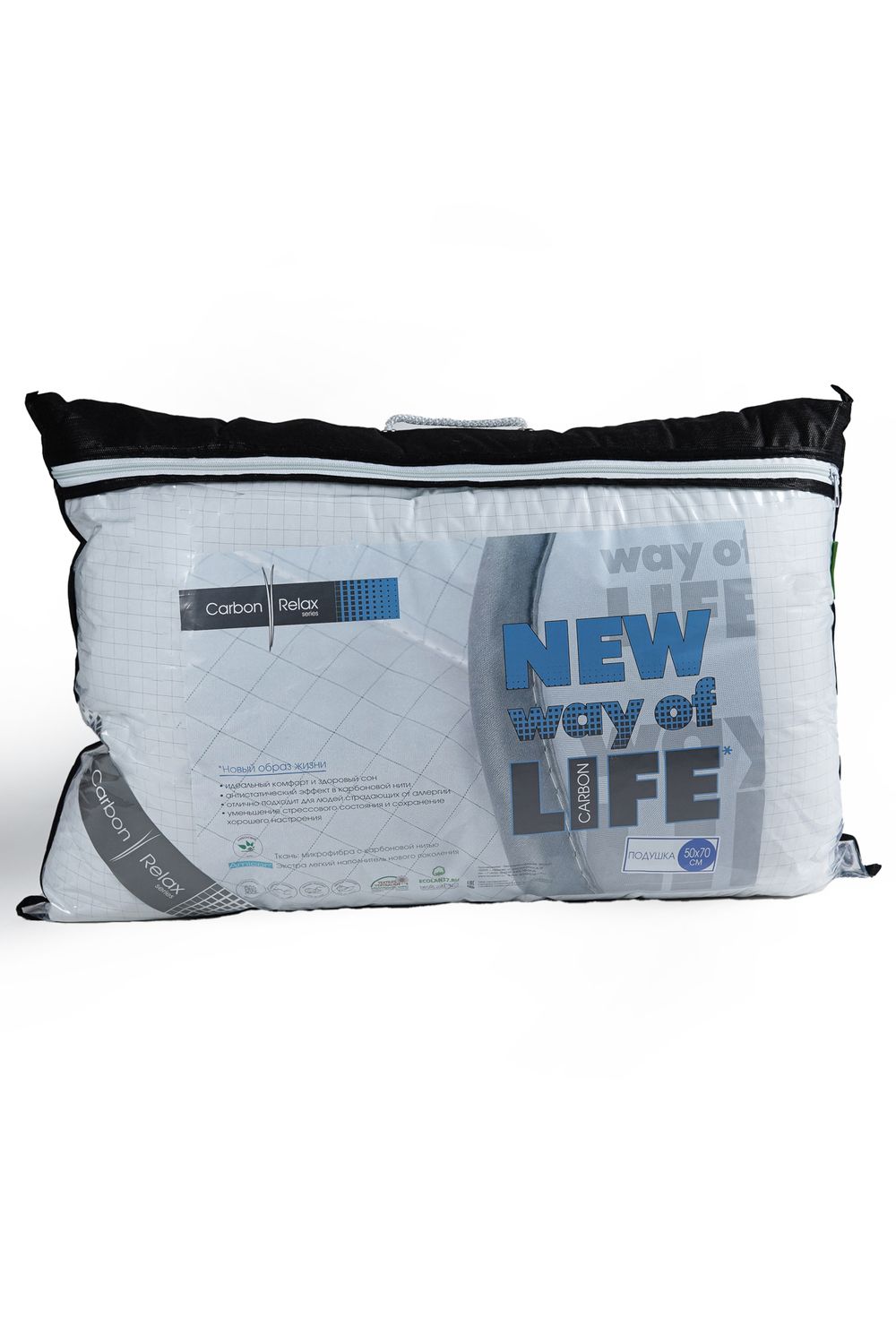 Размер 50х70см, 70х70см. Элегантный внешний вид, благородная воздушность и мягкость, утонченность линий атласного канта и особенное исполнение изделия - для всех ценителей истинного комфорта и наслаждения. Изделия из серии Carbon-Relax изготовлены с использованием новейших технологий из хлопковой ткани с карбоновой нитью и экстра легким наполнителем нового поколения AMICOR™.