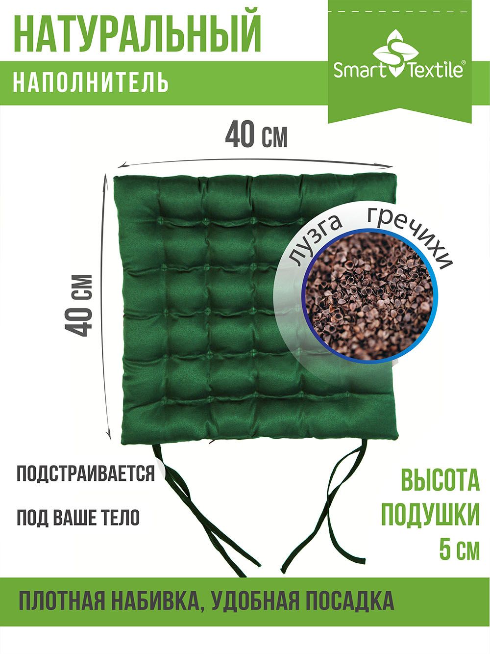 Благодаря форме пошива в виде объемных ячеек и уникальным природным свойствам наполнителя из лузги гречихи, сидеть на такой подушке удобно и полезно. С завязками для стула. Чехол: смесовая ткань. Наполнитель: лузга гречихи.