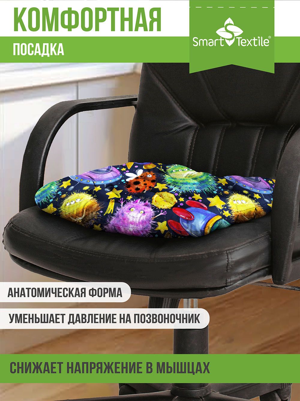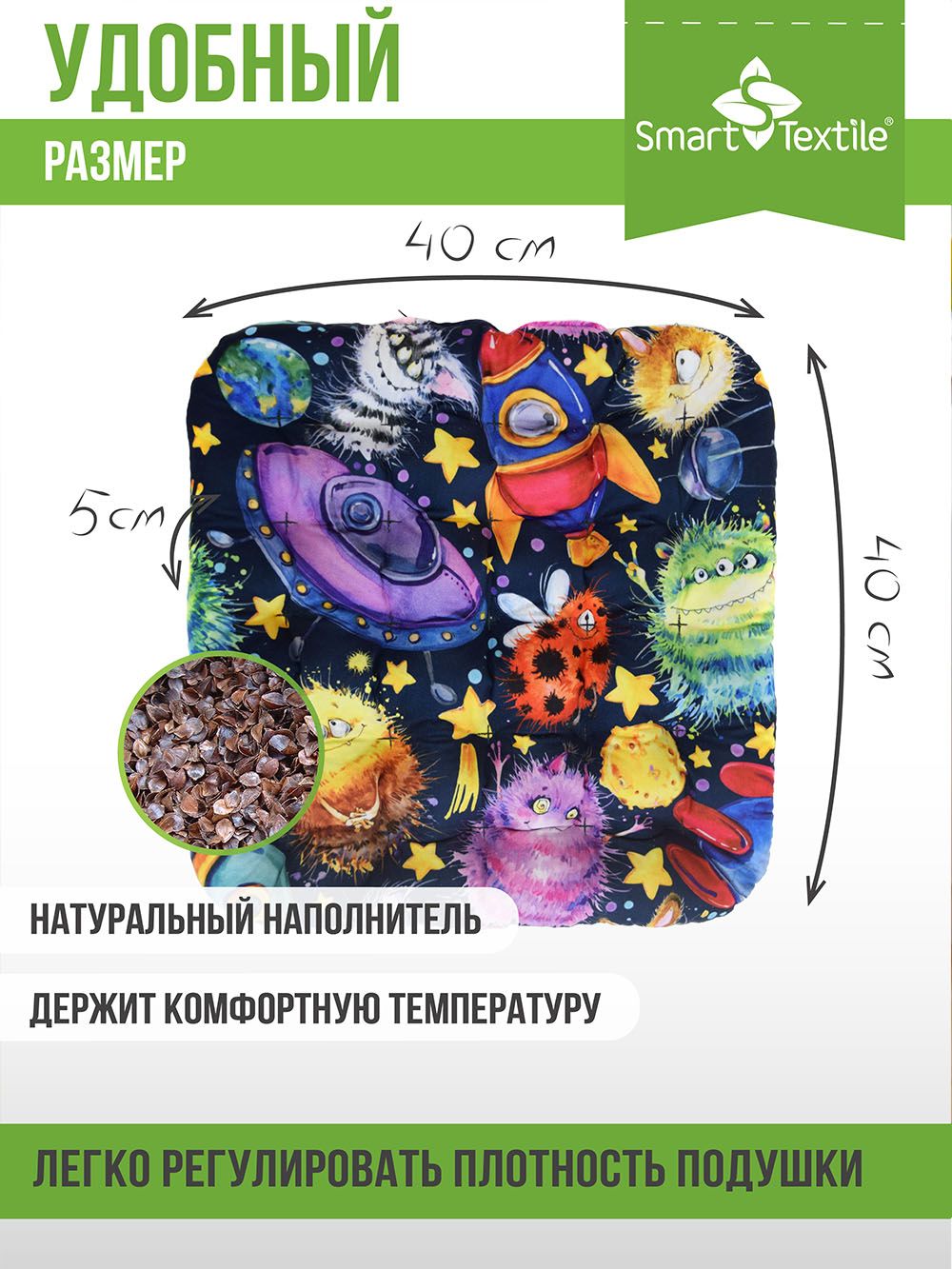 Сидушка-подушкасерии "Сюжет" подходит для всех домашних и школьных стульев. Благодаря объемным ячейкам и уникальным природным свойствам наполнителя из лузги гречихи, сидеть на такой подушке удобно и комфортно.