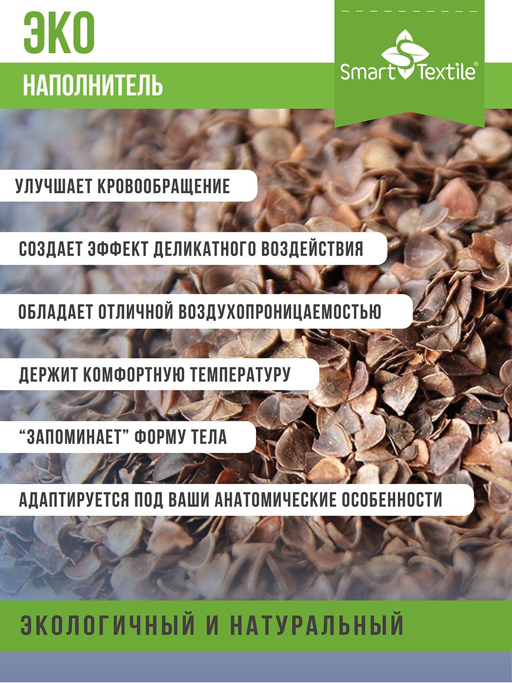 Наполнитель из лузги гречихи придает подушкам анатомические свойства, снижая нагрузку на мышцы, уменьшая давление и расслабляя позвоночник, а также улучшая кровообращение в органах малого таза.