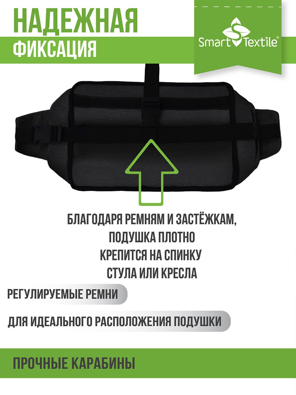 Благодаря удобным регулируемым ремням подушка легко крепится на любое кресло или стул. Она имеет прямоугольную форму с горизонтальными валиками и слегка утолщена в верхней части. Чехол выполнен из прочной, износостойкой ткани (гретта). Натуральный наполнитель – лузга гречихи – обеспечивает свободную циркуляцию воздуха, сохраняя спину сухой даже в жару. Пирамидальное строение лузги оказывает мягкое массажное действие, улучшая кровообращение. Компактные размеры (40х20 см) позволяют брать подушку с собой в поездки, использовать на отдыхе, работе или дома.
