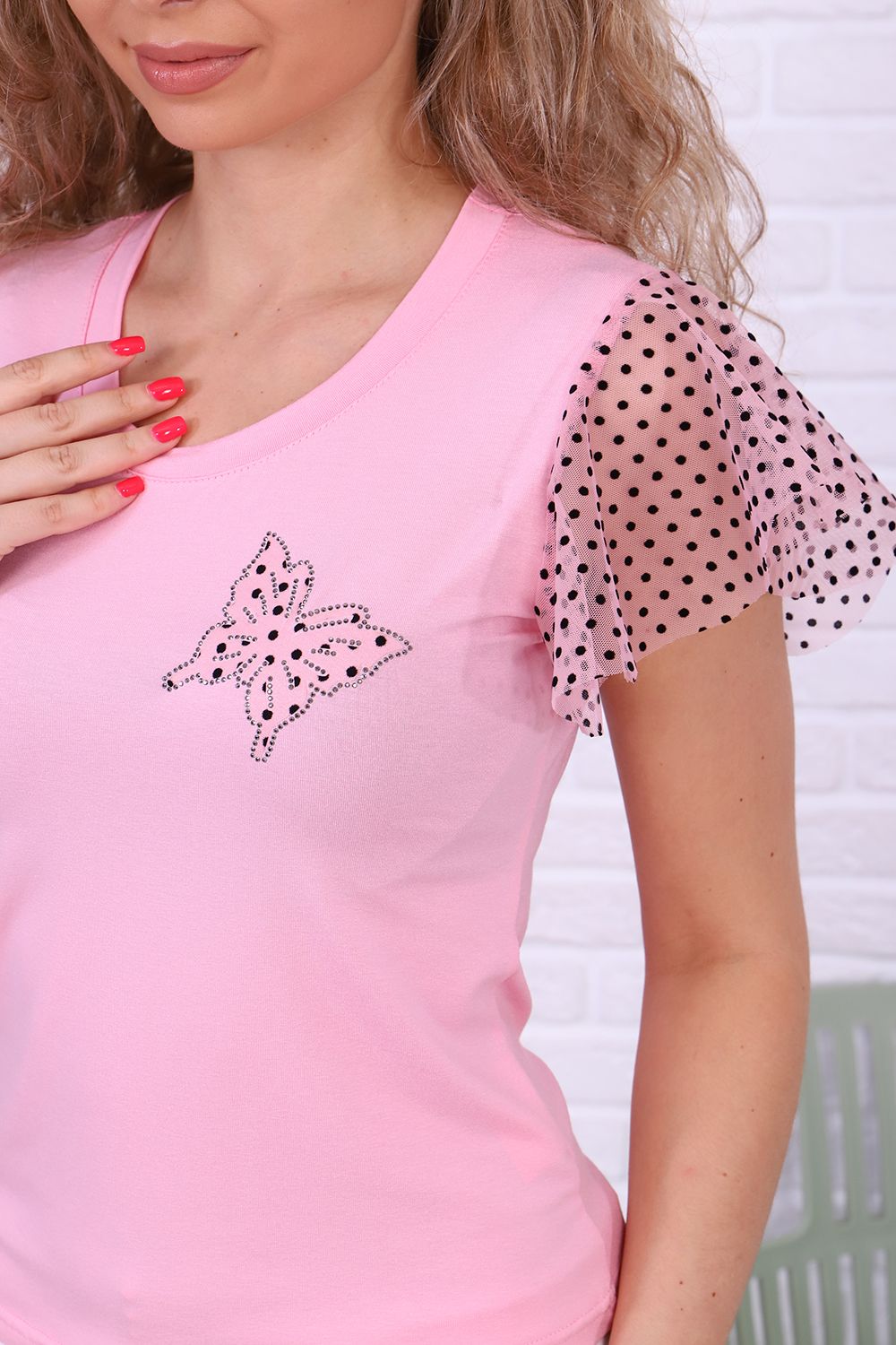 Футболка выполнена из вискозы: 95% вискоза, 5% лайкра, 210 - плотность. На данной модели имеется декоративный элемент в виде бабочки из сетки и страз на груди. Футболка прилегающая, на рукавах воланы из сетки. Такая модель подойдет всем, подчеркнет достоинства и скроет недостатки.