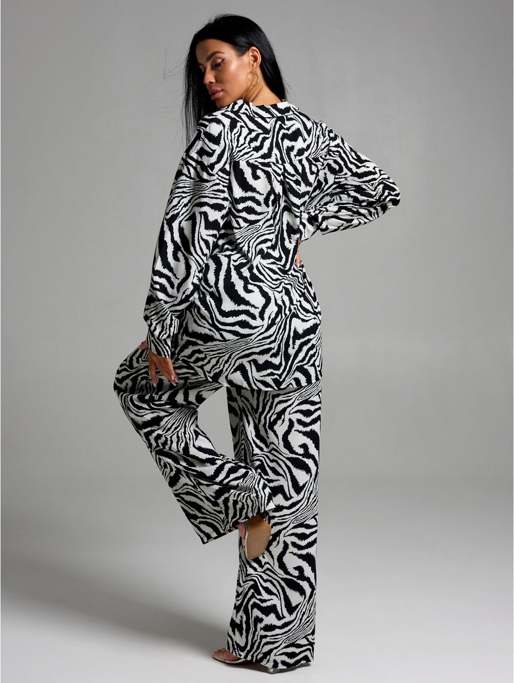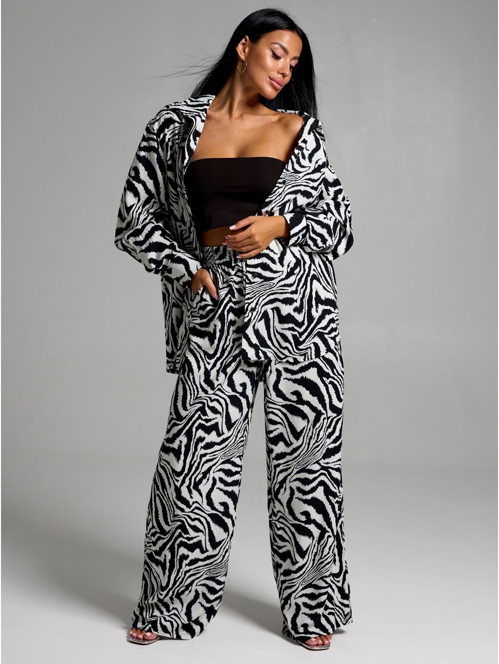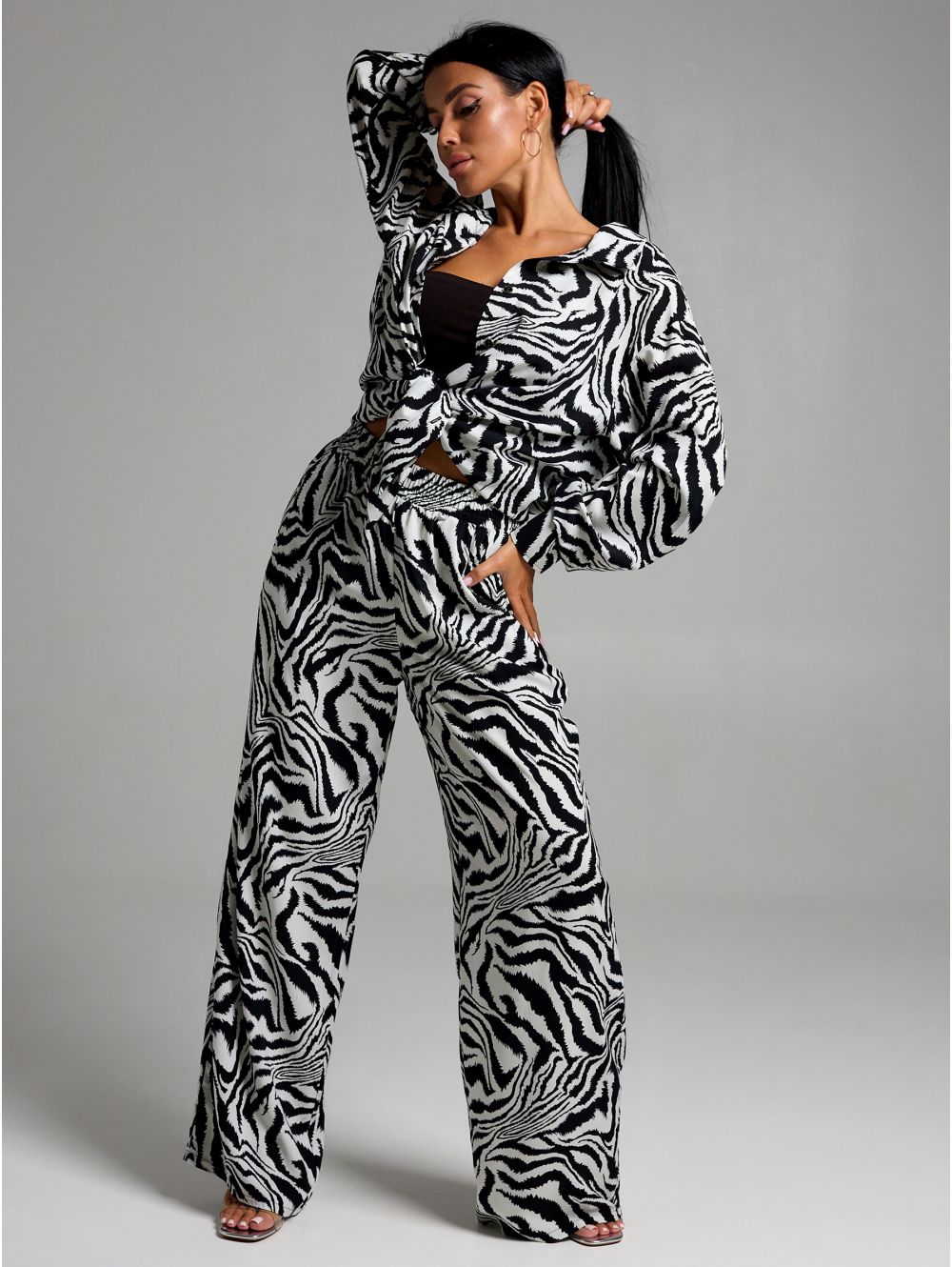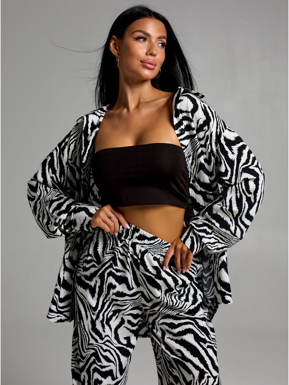 Костюм женский состоит из рубашки и брюк. Рубашка – прямого силуэта. Брюки прямые от бедра с отрезным поясом.