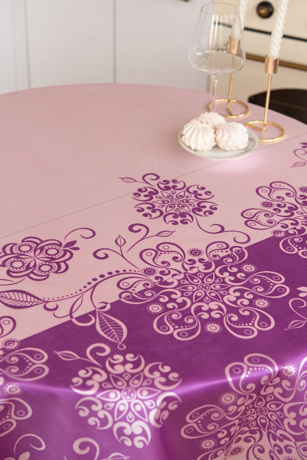 Современный материал обладает высокой износостойкостью, эластичностью и приятной мягкостью на ощупь. Скатерть легко стирается, быстро сохнет и не требует сложного ухода, сохраняя свежий и аккуратный вид даже при частом использовании.