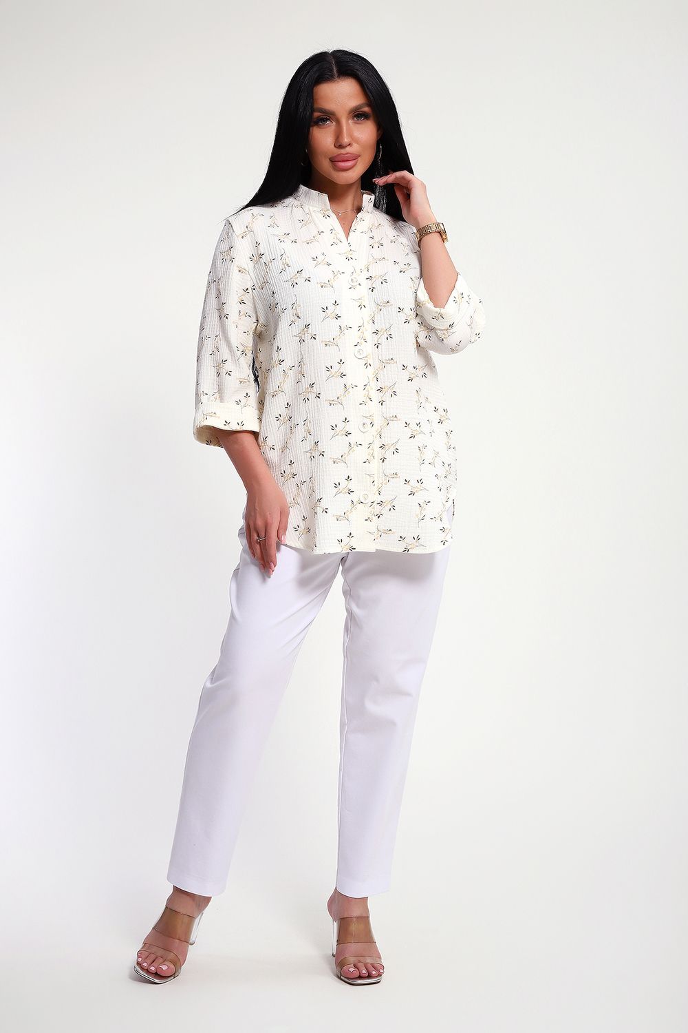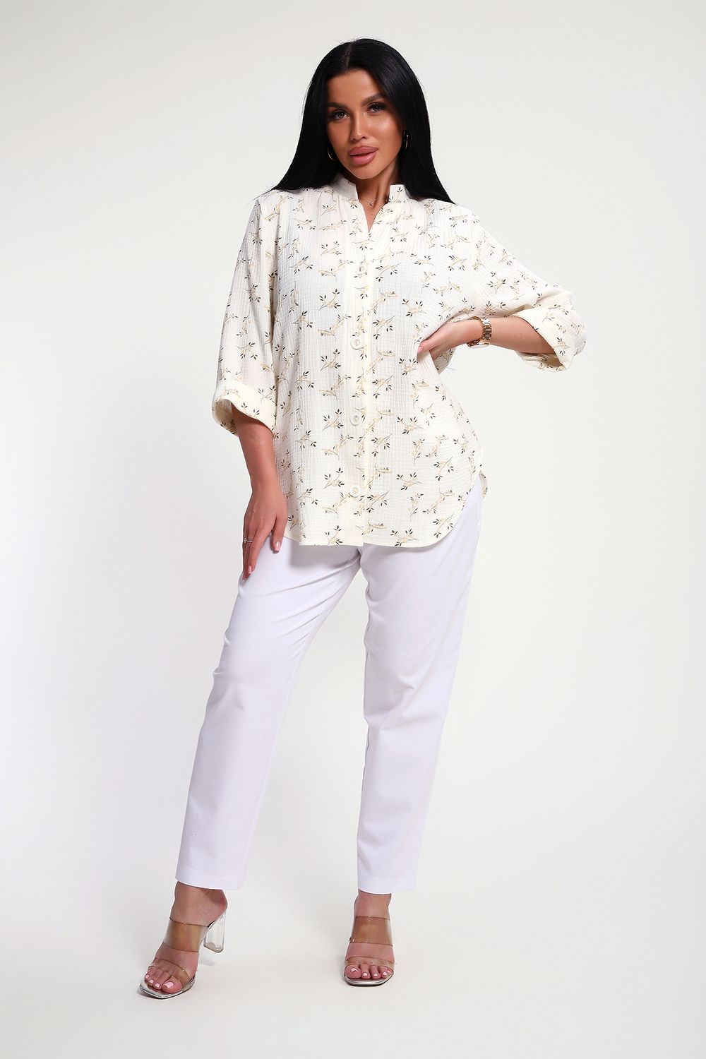 Свободный крой, удлиненный силует, фигурный низ рубашки, рукава 3/4 с манжетом, аккуратная стойка по горловине - эта модель воплощает в себе утонченную непринужденность и безупречный вкус. Застежка на петли и пуговицы образуют V-образный вырез по горловине, что удлиняет шею и подчеркивает женственность образа.