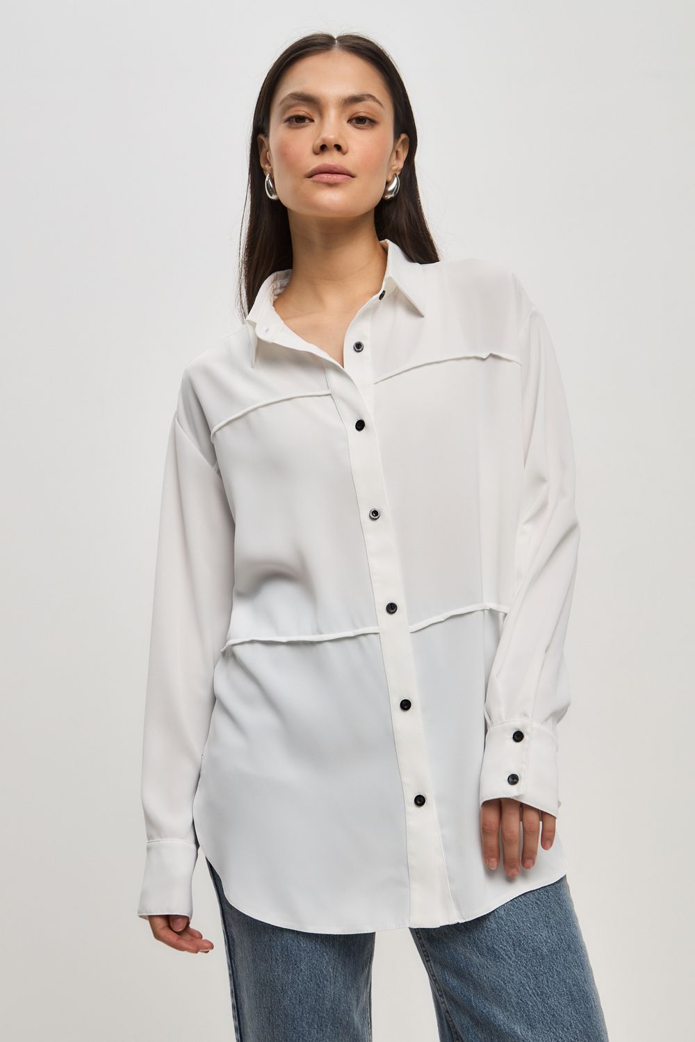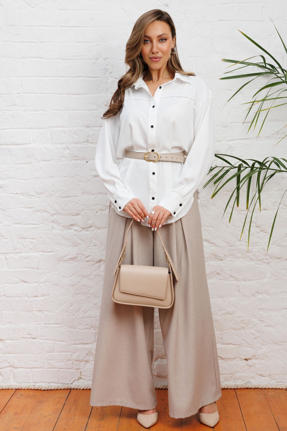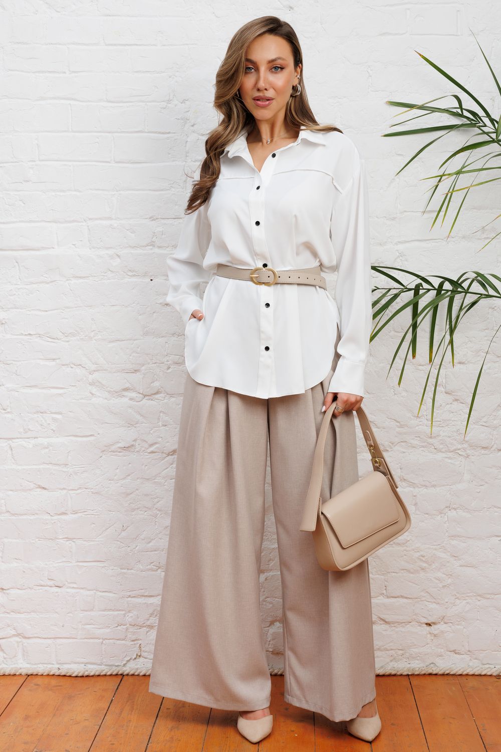 Представляем актуальную рубашку в стиле расслабленного оверсайз, которая идеально впишется в ваш гардероб предлагая современный взгляд на деловой стиль с акцентом на максимальный комфорт и сдержанную элегантность от российского производителя бренда женской одежды! Модель с отложным воротником со стойкой деликатно обрамляет лицо и визуально удлиняет шею, а длинные рукава на манжете акцентируют внимание на запястьях, подчеркивая женственность и хрупкость рук, что создает тот самый желанный образ собранной и ухоженной леди. Продуманный крой с двумя видами защипов по переду и спинке создает благородную свободу облегания, позволяя ткани красиво струиться и мягко скрывать область живота, даря вам ощущение комфорта и уверенности в своей фигуре даже после насыщенного дня. Контрастные пуговицы и планка по низу с фигурным разрезом добавляют образу современную динамичность и статусность. Эта рубашка идеально впишется в ваш ритм жизни, легко трансформируясь из строгого офисного наряда для важных встреч в расслабленный кэжуал-лук для прогулки или похода в гости, помогая вам всегда выглядеть эффектно и чувствовать себя свободной, сочетаясь с брюками, юбками или джинсами. Модель доступна в больших размерах плюс сайз - 50, 52 и 54, будет шикарно смотреться в любом возрасте, подойдет для полных девушек. Удачных Вам покупок! С уважением, TOPLES.