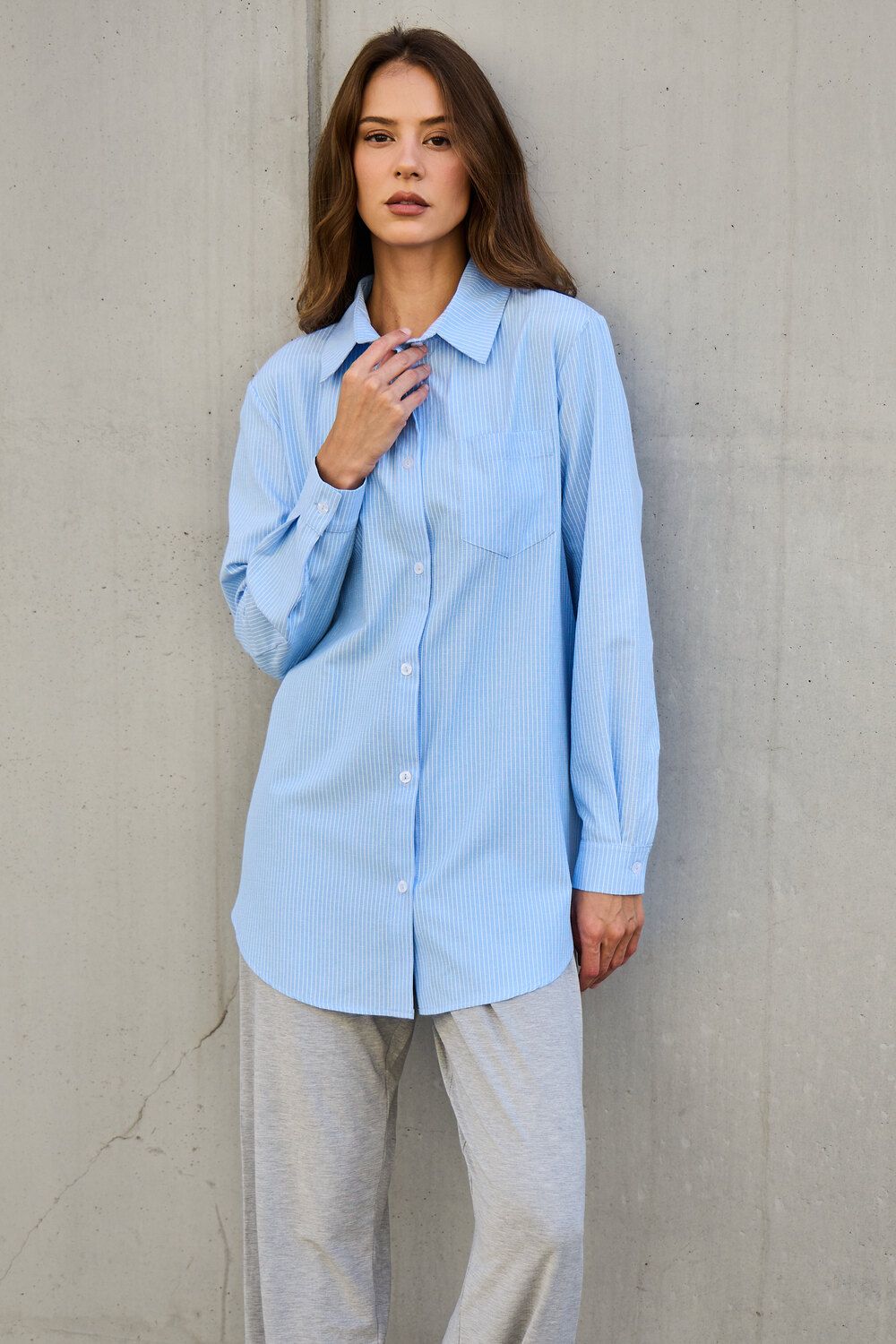 Изысканность в каждой детали: удлиненный силуэт, элегантный длинный рукав и широкий воротник придают этой полосатой рубашке особый шарм. Она станет вашим верным спутником на романтических свиданиях, обеспечит комфорт в школе и подчеркнет профессионализм в офисе. Легкость и дышащие свойства хлопка гарантируют непревзойденное ощущение свежести.