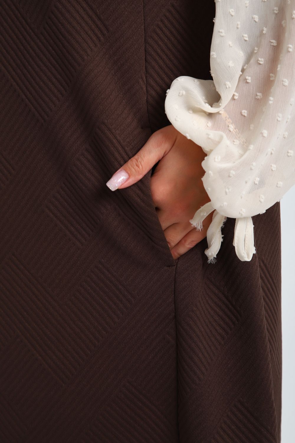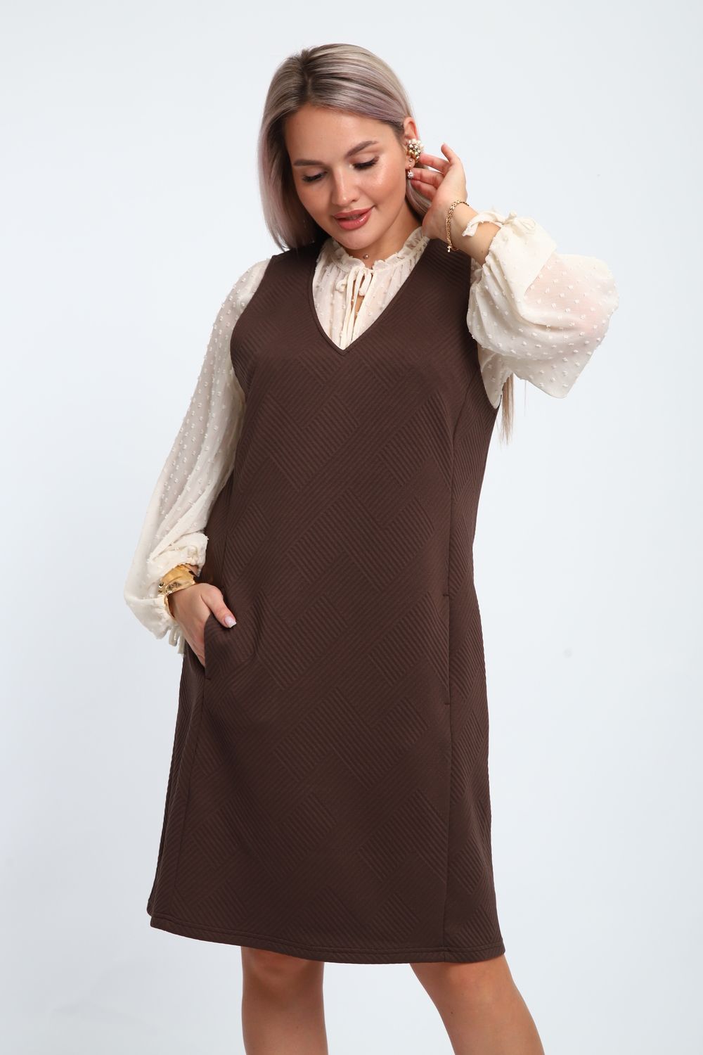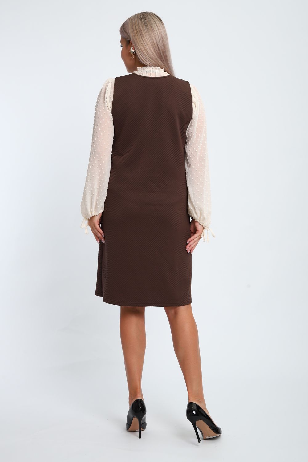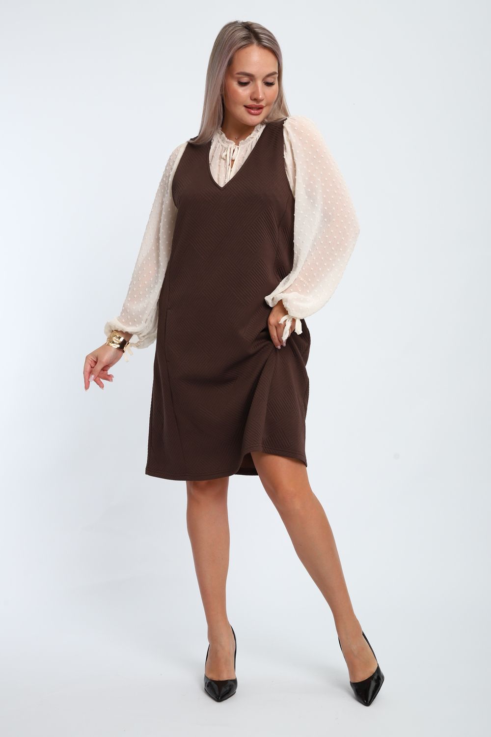 Создайте свой неповторимый образ с помощью универсального сарафана, к которому можно подобрать разнообразные блузки, водолазки, свитшоты. Сарафан прямого кроя, слегка притален, благодаря отрезному бочку, аккуратная V-образная горловина обработана обтачкой, в швах притачивания бочков имеются внутренние карманы. Пройма достаточно глубокая, чтобы не стеснять рукав блузки, длина до середины колена. Лаконичность деталей кроя подчеркивает стиль и элегантность изделия. Свободный крой сарафана и воздухопроницаемость ткани обеспечивают комфорт и свободу движения, что делает его идеальным для повседневного ношения. Модная геометрическая рельефная фактура ткани придает изделию стильный и современный образ. Базовые расцветки сарафана помогут с легкостью подобрать к нему пару. На работе, в офисе, на прогулке, на празднике вы будете чувствовать себя комфортно и уверенно.