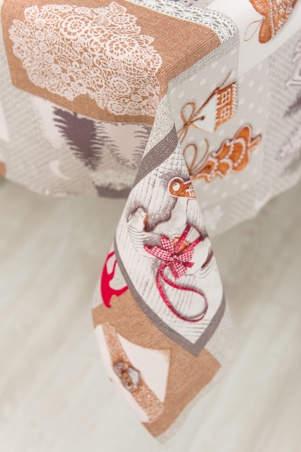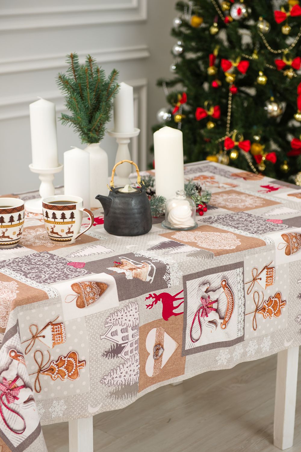 Скатерть из рогожки размером 120*150 с изображением оленей, печенья и елочных игрушек - неотъемлемый атрибут праздничного стола.