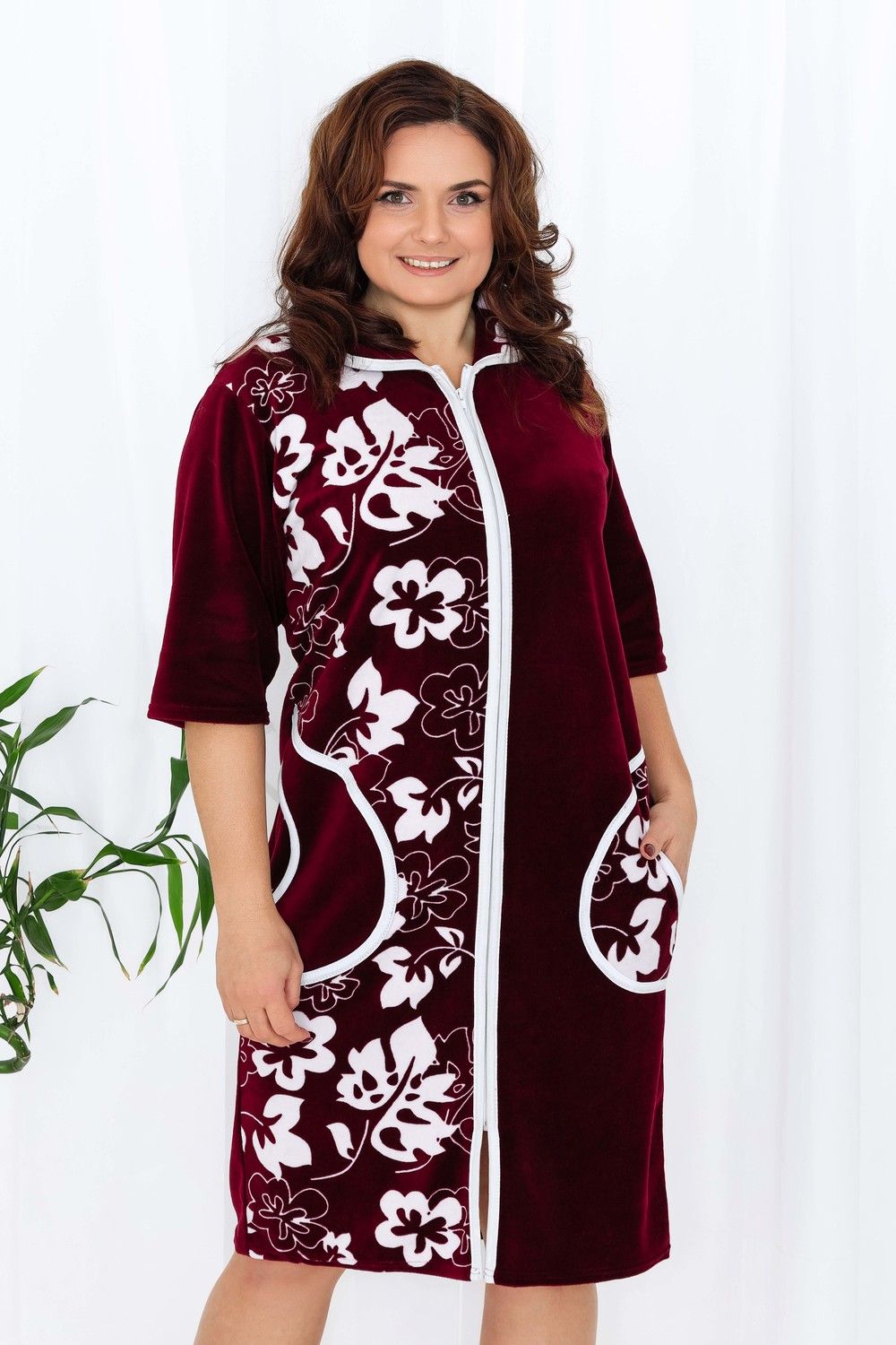 Халат домашний женский на молнии. Рукав короткий, длина ниже колена, в боковых швах два полупояса, воротник круглый. Размерный ряд имеет большие размеры.