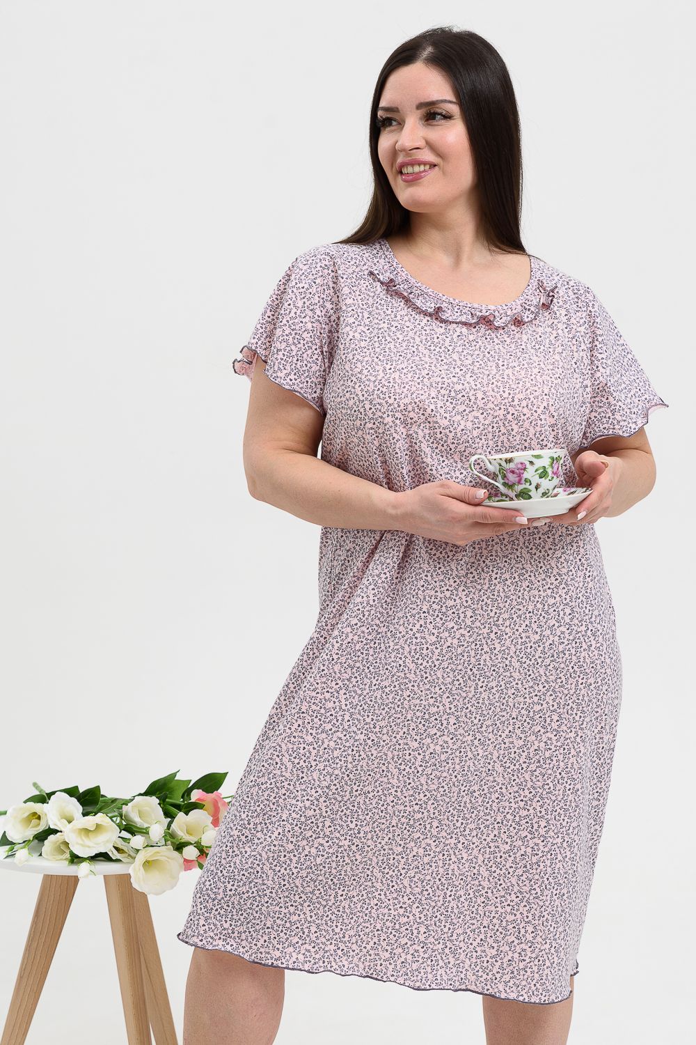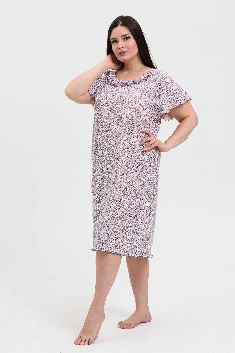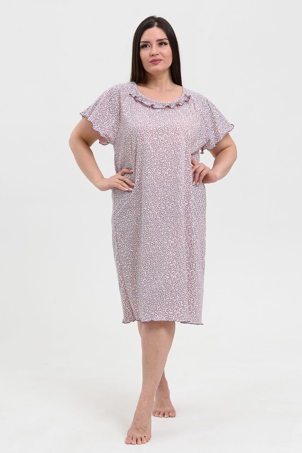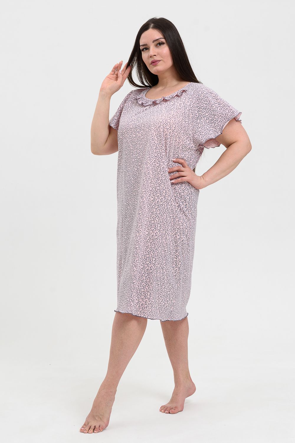 Сорочка женская больших размеров с симпатичной рюшей по горловине. Очень свободный и удобный крой. Рукав-реглан, не стесняет движения рук. Обработка рукава и низа изделия в виде лёгкой волны придаёт лёгкость и воздушность.