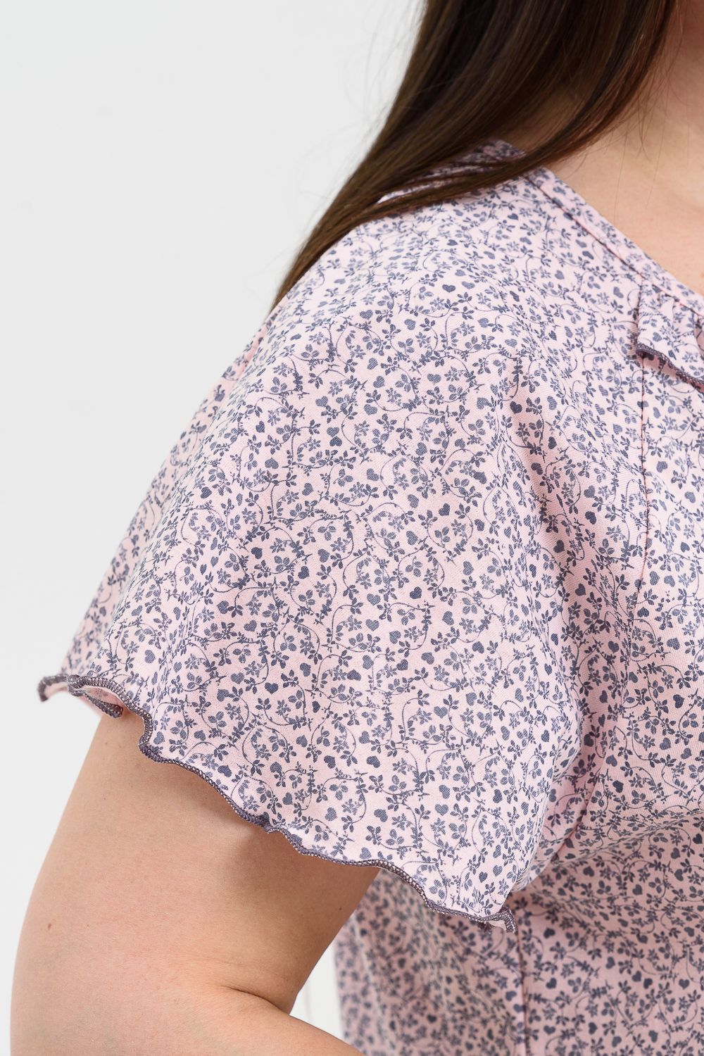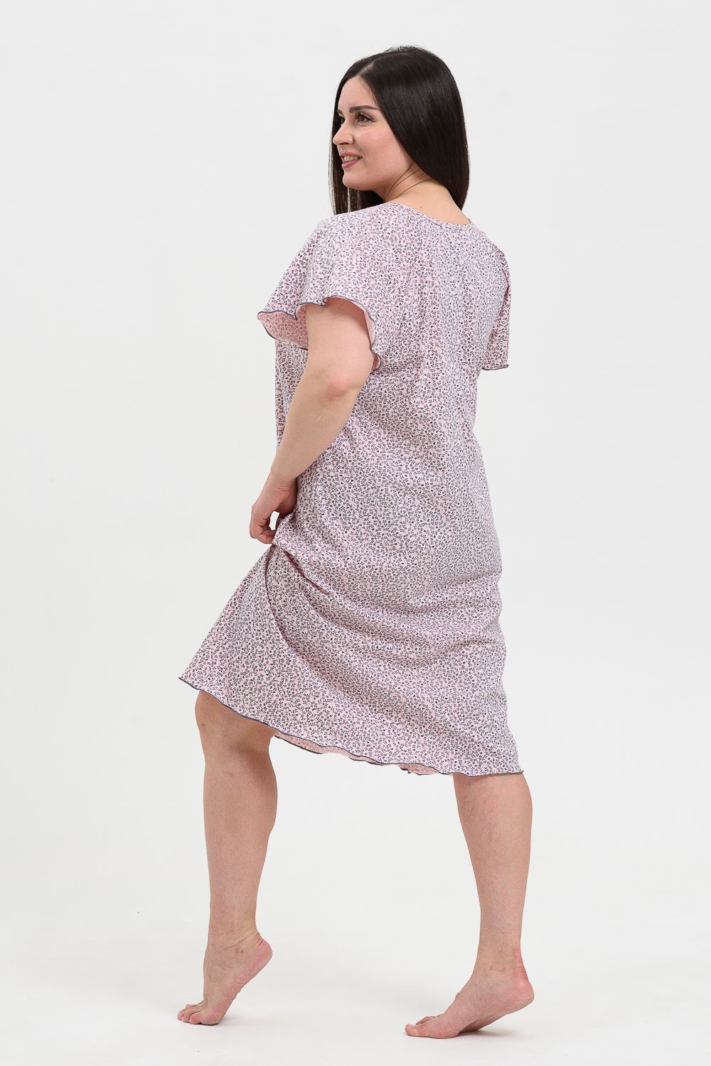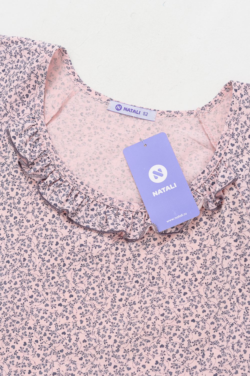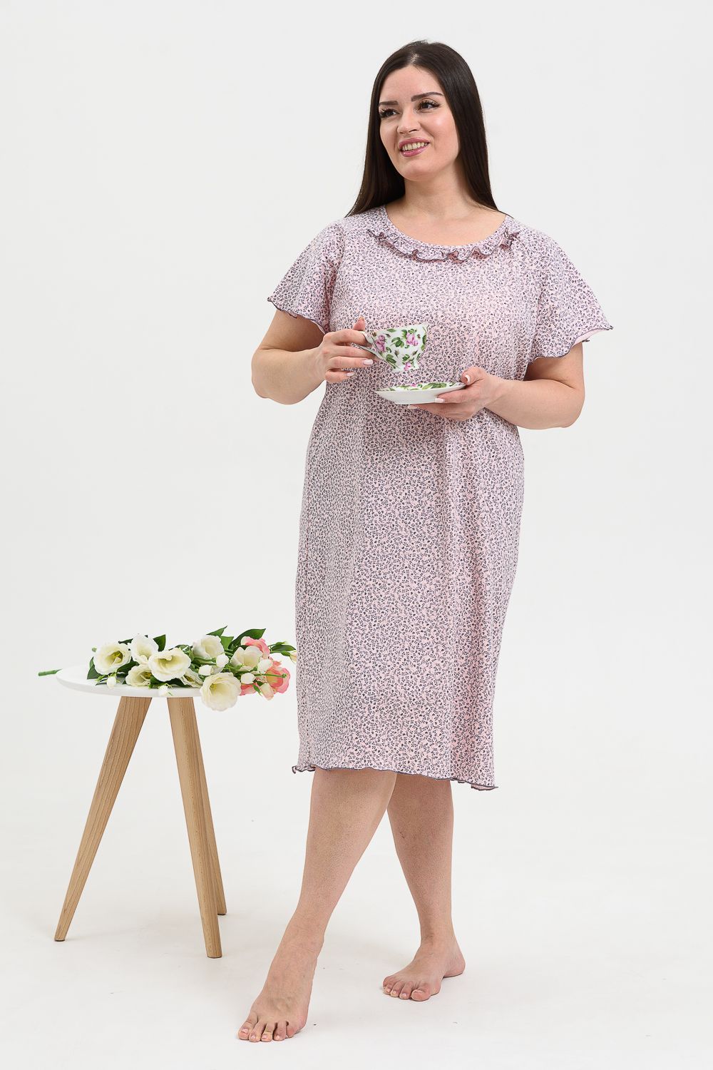 Сорочка женская больших размеров с симпатичной рюшей по горловине. Очень свободный и удобный крой. Рукав-реглан, не стесняет движения рук. Обработка рукава и низа изделия в виде лёгкой волны придаёт лёгкость и воздушность.