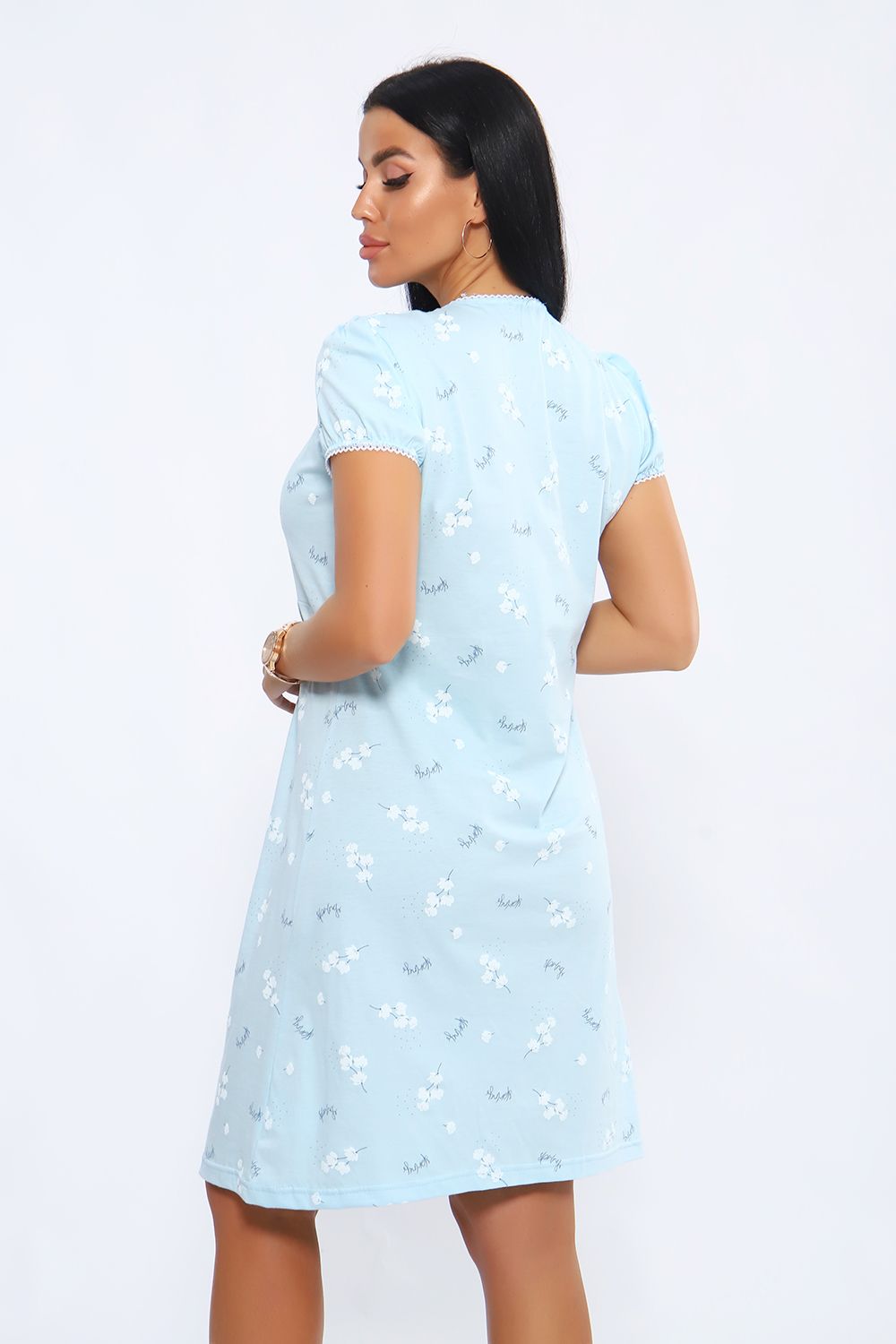 Женская сорочка с V-образным вырезом на кнопках. Отличный вариант для сна и отдыха, идеально подходит для кормления малыша. Данная модель выполнена из приятного к телу материала, трикотажного полотна кулирка (100% хлопок). Пройма и горловина обработана кружевной резинкой.