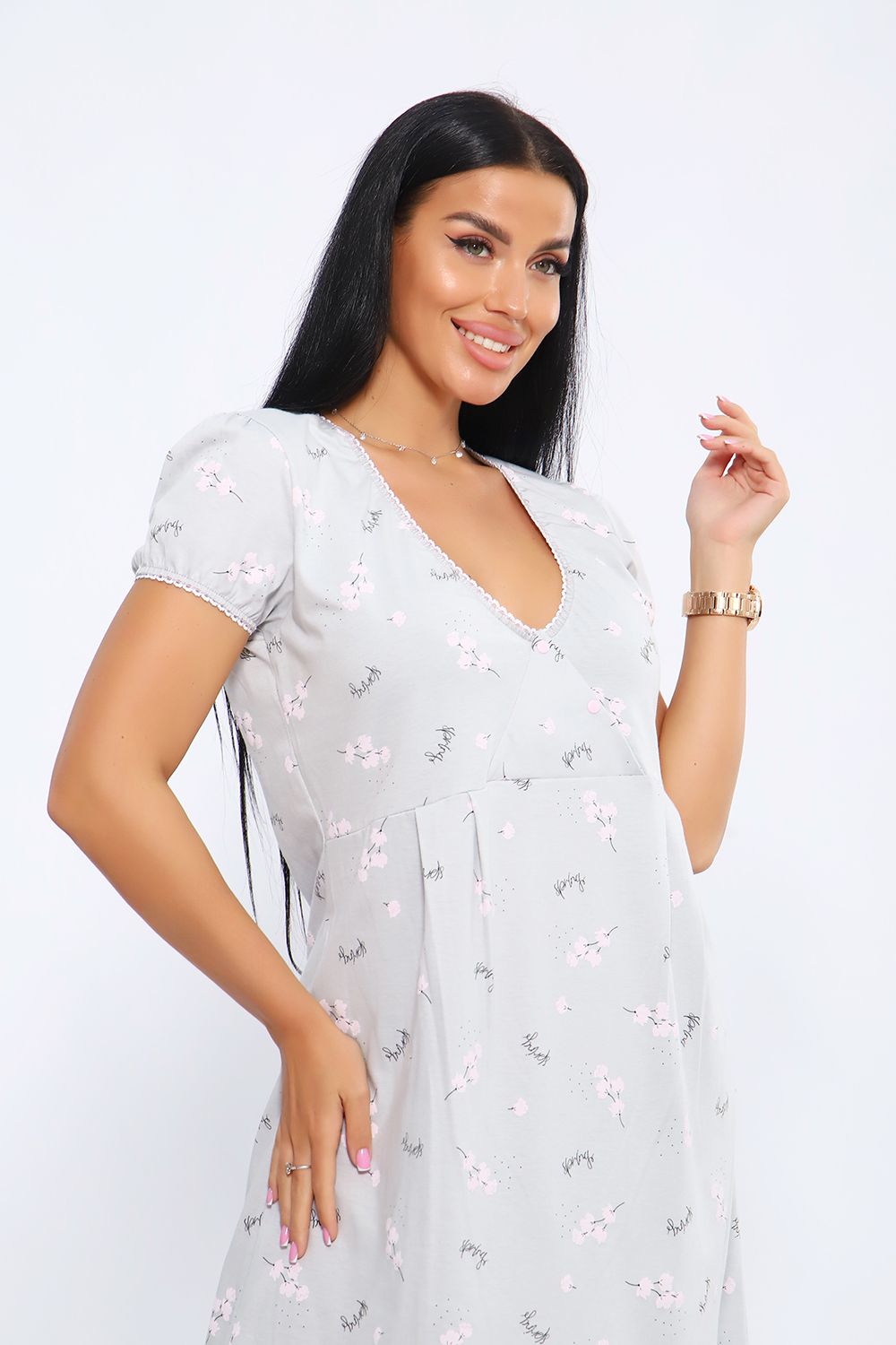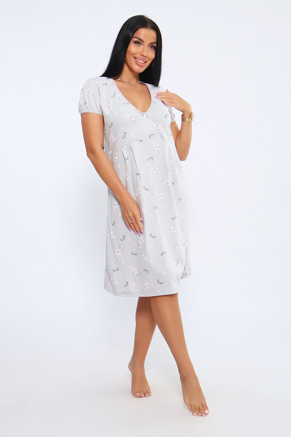 Женская сорочка с V-образным вырезом на кнопках. Отличный вариант для сна и отдыха, идеально подходит для кормления малыша. Данная модель выполнена из приятного к телу материала, трикотажного полотна кулирка (100% хлопок). Пройма и горловина обработана кружевной резинкой.