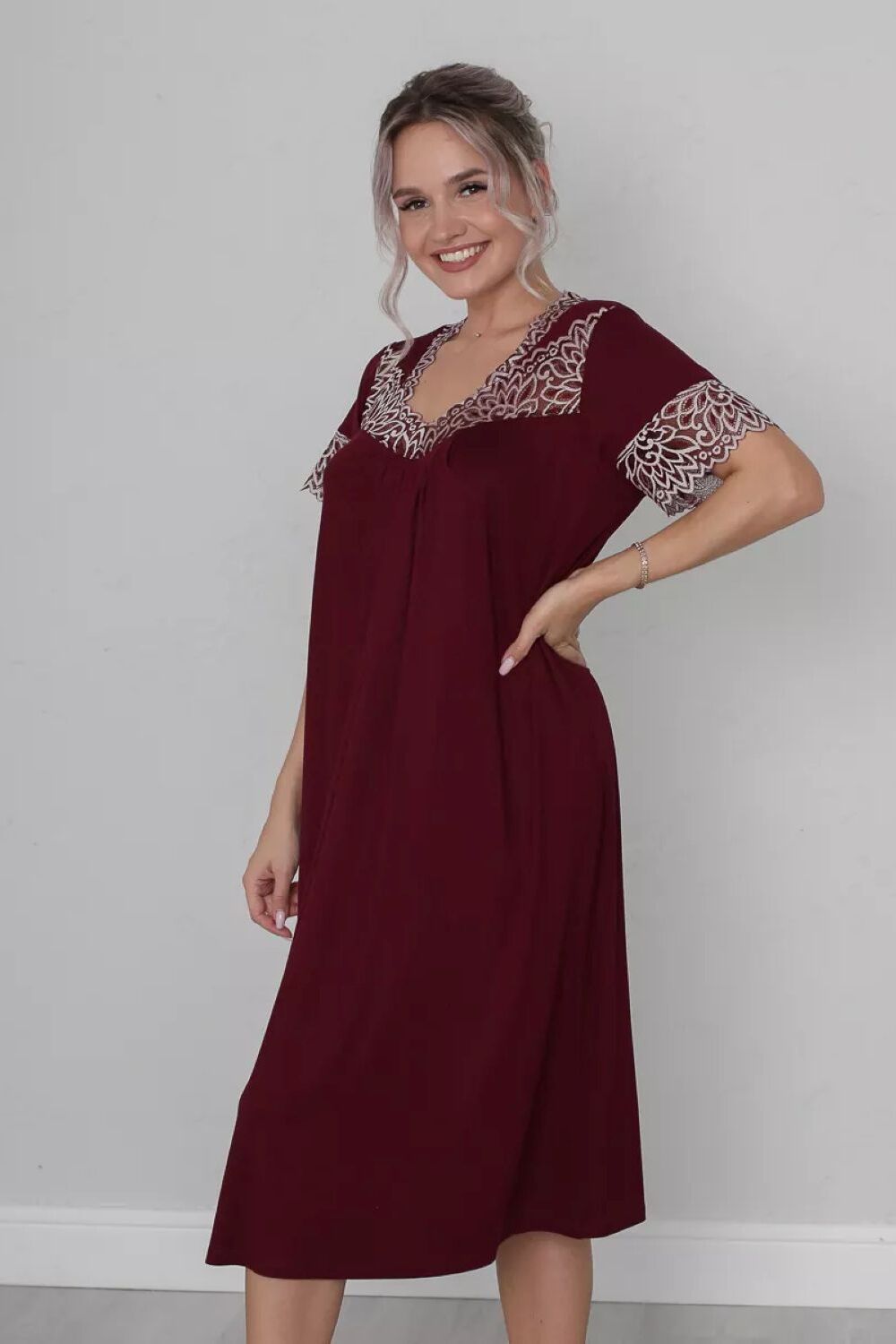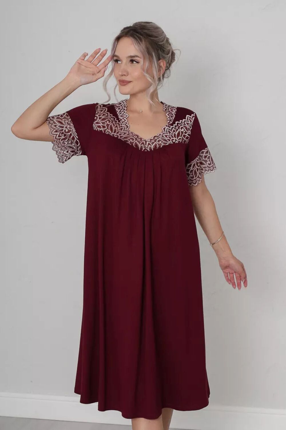 Ночная сорочка из вискозы - элегантная и удобная модель с короткими втачными рукавами и длиной до середины икры. Сборка на груди придает ночнушке женственность и легкость, а кружево на груди и рукавах добавляет ей изящества и интриги. Благодаря крою такая модель подходит для женщин больших размеров, а использование мягкой и приятной на ощупь вискозы обеспечит комфорт и свободу движения. Удобная посадка и открытый вырез горловины делают рубашку идеальной для ночного отдыха. Дополнительным элементом дизайна является эластичное кружево, которое придает модели особую загадочность и стиль. Каждая женщина достойна и дома, в кругу своих близких выглядеть неотразимо. Приобретая нашу сорочку, вы получаете сразу два решения- эффектное платье для дома и одежду для комфортного сна. Вискоза отлично тянется, а это значит, что ночная сорочка подойдет для беременных и кормящих, возьмите ее с собой в роддом и будете самой элегантной мамочкой. Ночная рубашка подойдет на большие размеры, девочкам, молодым девушкам и дамам. Трикотажная ночнушка с кружевом - это отличный подарок. Порадуйте покупкой себя или сделайте подарок близким.