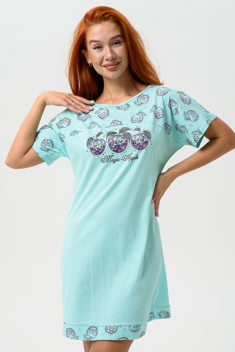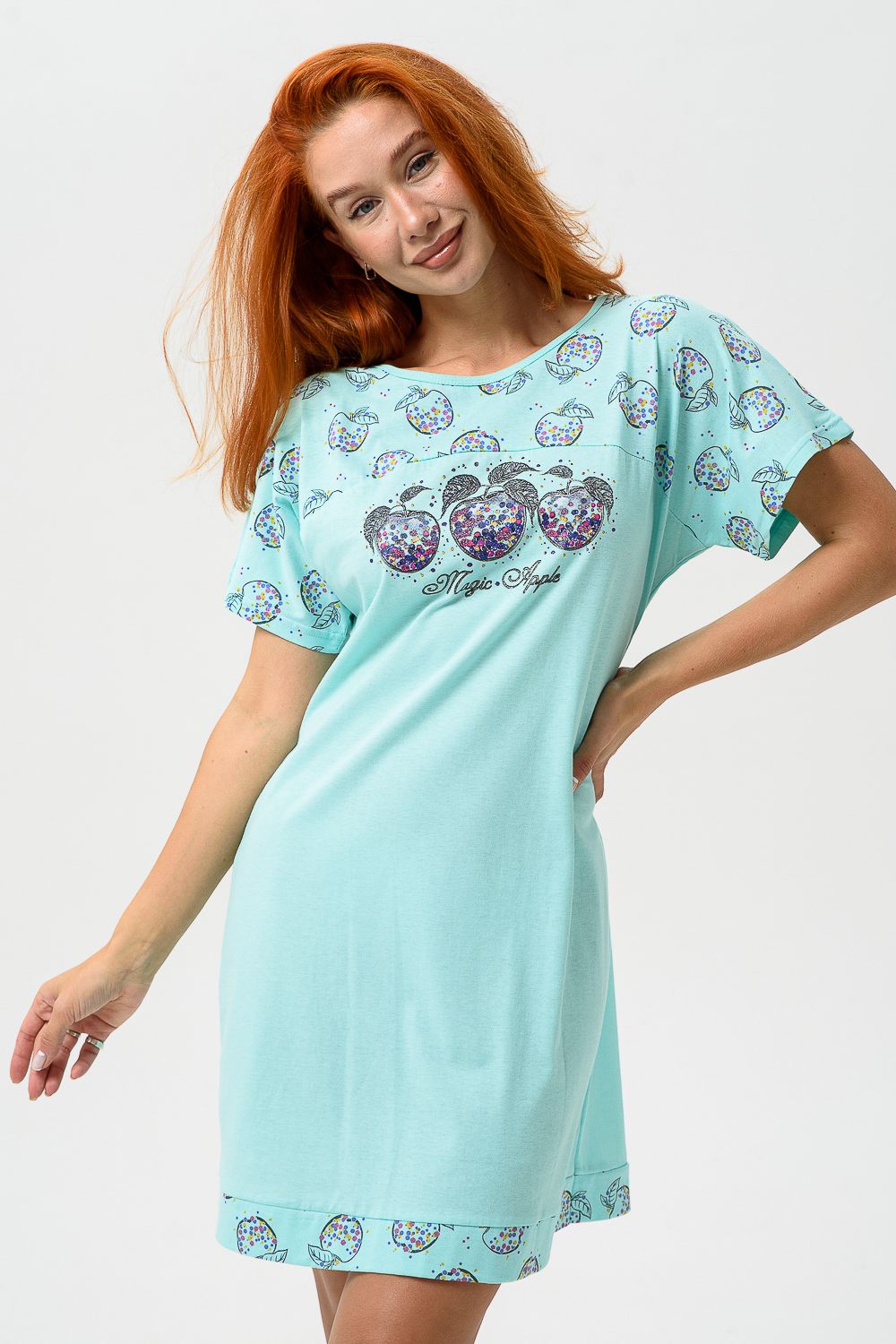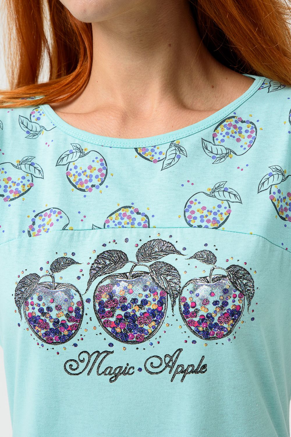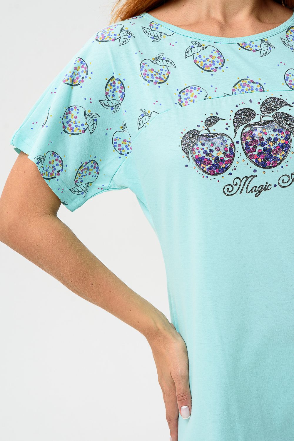 Сорочка с цельнокроеным рукавом, с кокеткой и двойной манжетой по линии низа из ткани-компаньона. Печать - три яблочка с глитером