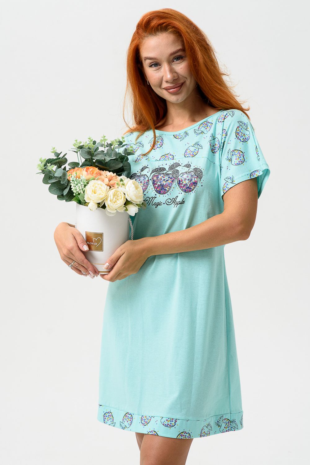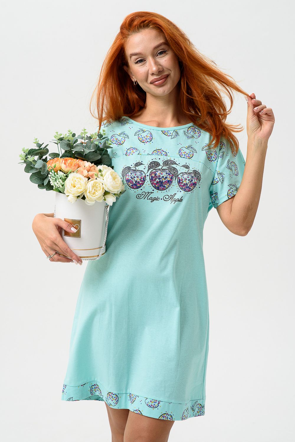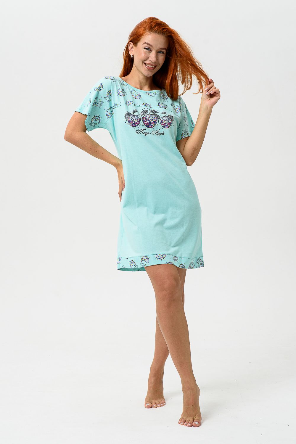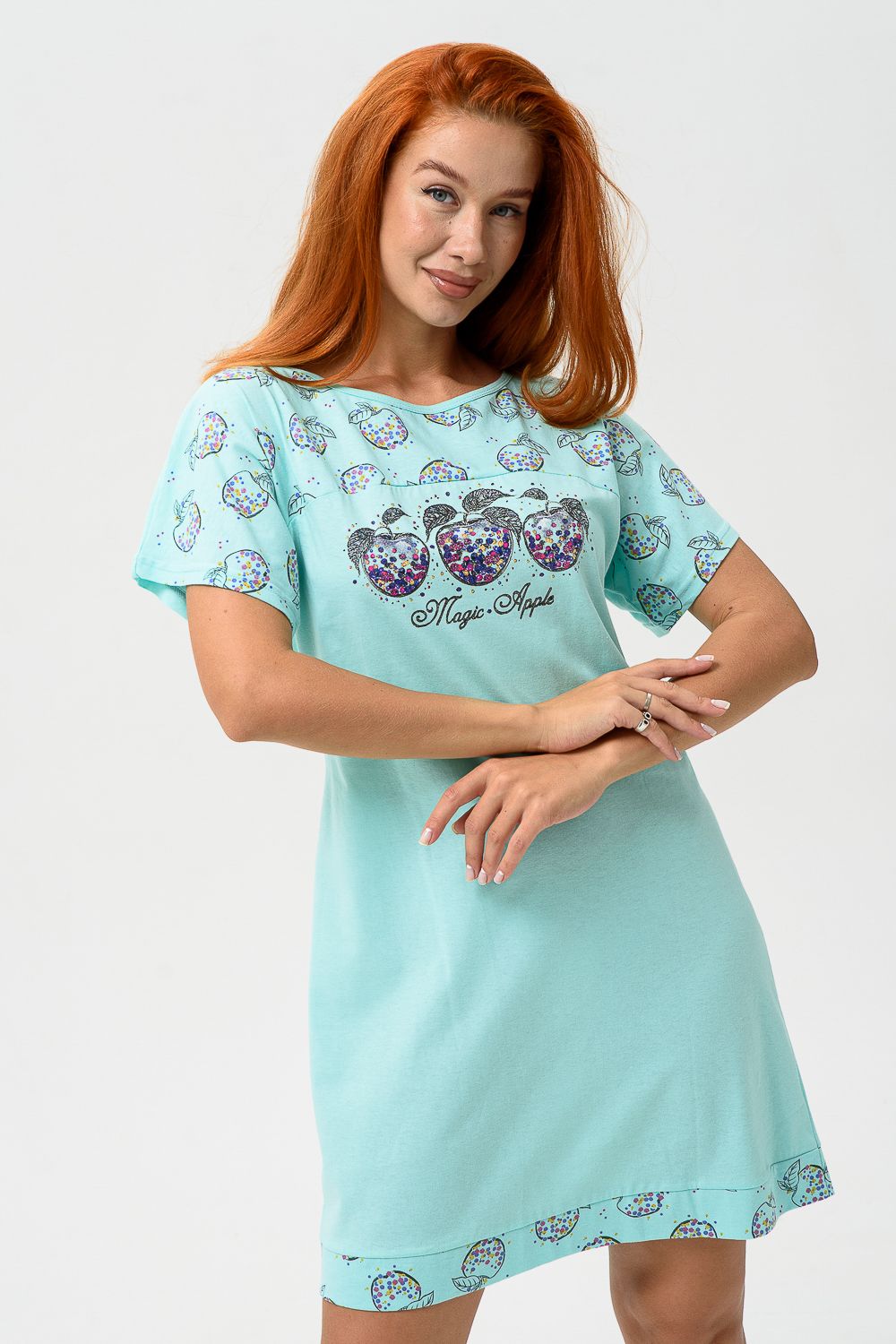 Сорочка с цельнокроеным рукавом, с кокеткой и двойной манжетой по линии низа из ткани-компаньона. Печать - три яблочка с глитером