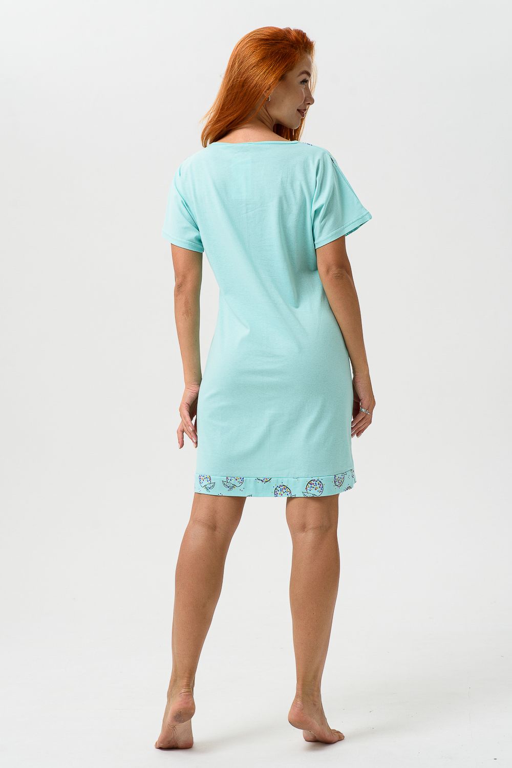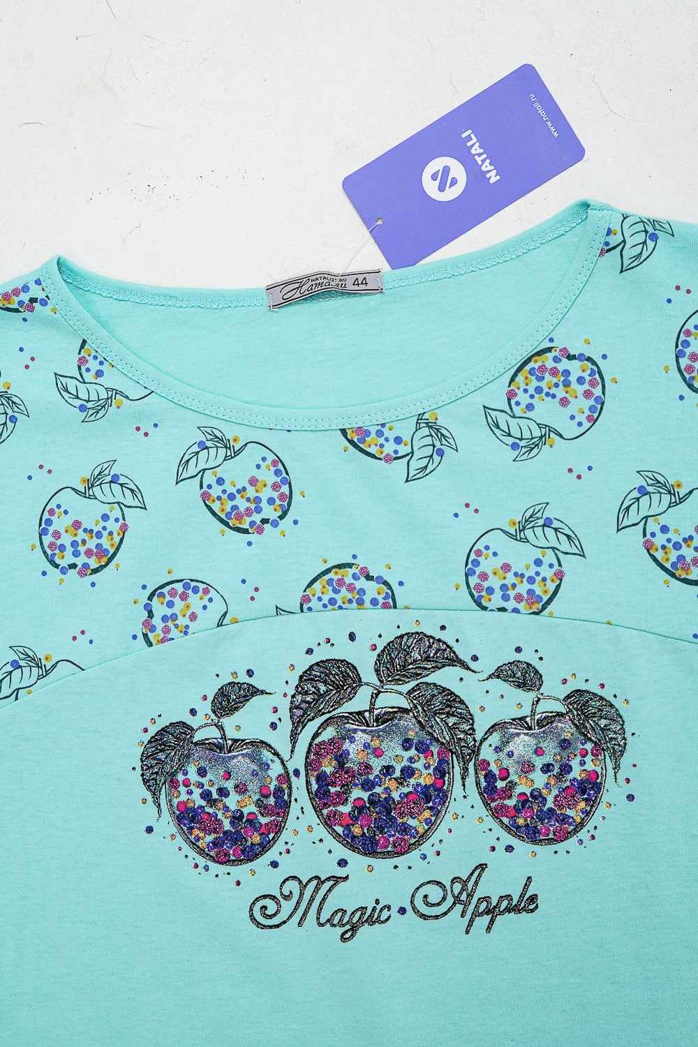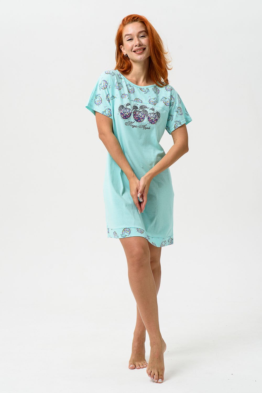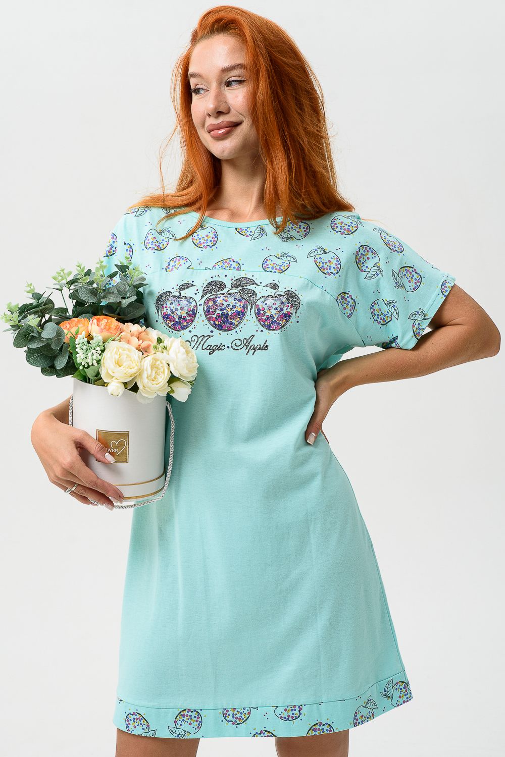 Сорочка с цельнокроеным рукавом, с кокеткой и двойной манжетой по линии низа из ткани-компаньона. Печать - три яблочка с глитером