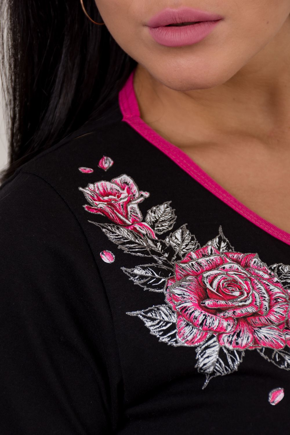 Очень нежная ночная сорочка с оригинальным принтом "Розы". Изделие слегка приталенного силуэта, длиной до колена с втачным рукавом. В лепестках цветов используется серебристый глиттер. Подходящий крой даёт возможность ходить в ней дома в качестве домашнего платья.