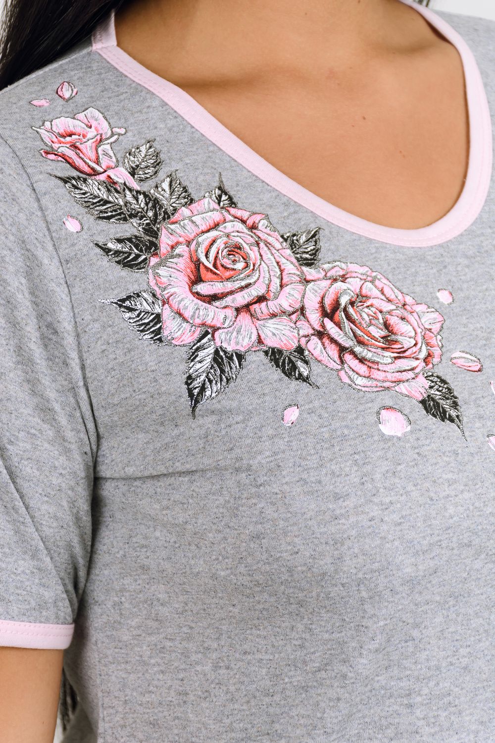 Очень нежная ночная сорочка с оригинальным принтом "Розы". Изделие слегка приталенного силуэта, длиной до колена с втачным рукавом. В лепестках цветов используется серебристый глиттер. Подходящий крой даёт возможность ходить в ней дома в качестве домашнего платья.